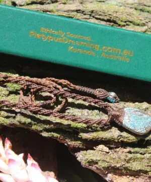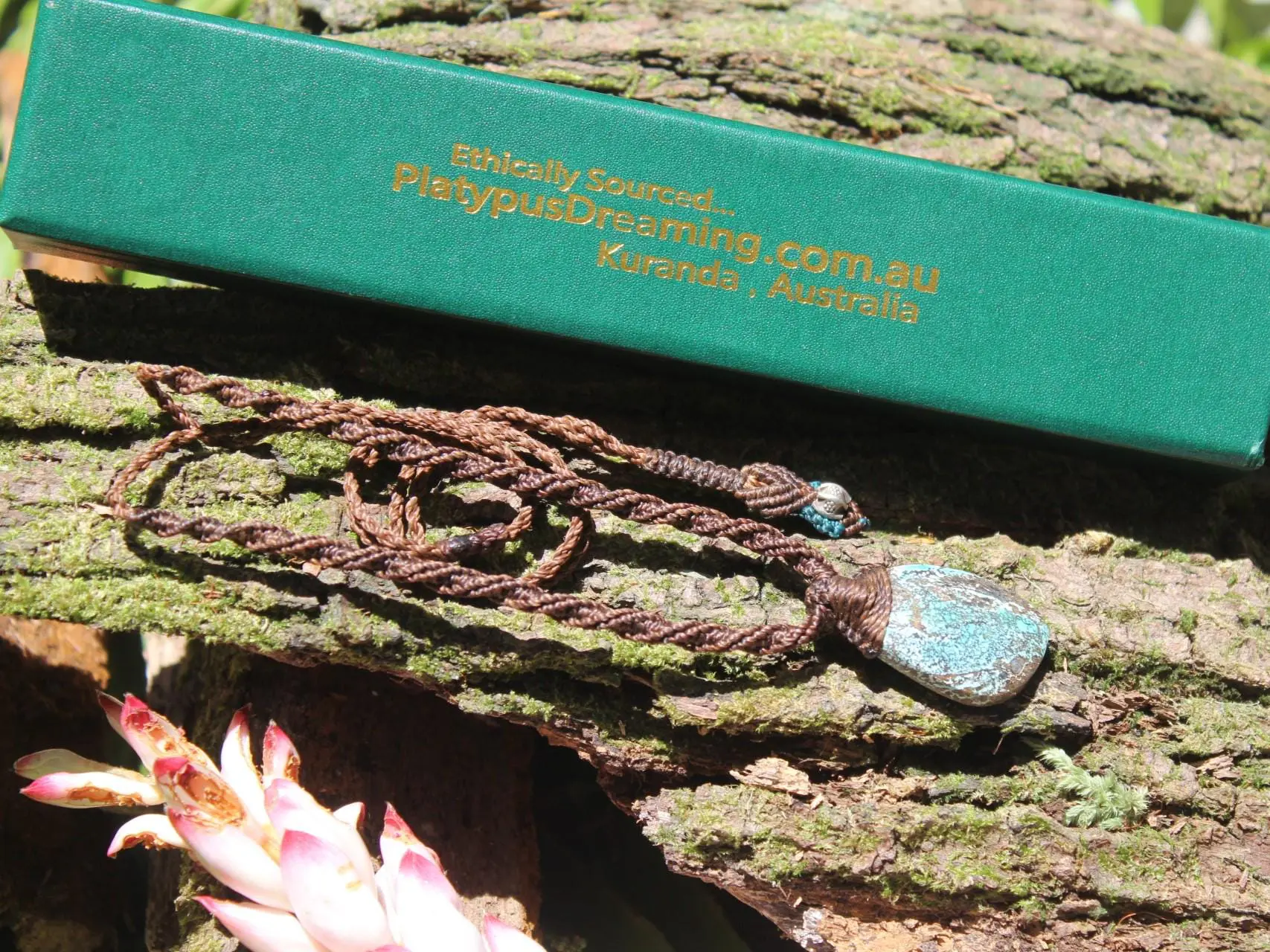 This natural Turquoise crystal talisman has been handcrafted in the healing rainforests of Far North Queensland, by Platypus Dreaming. The Turquoise has been ethically sourced from a small family business in Arizona, USA. This talisman features a 1000 pure silver tribal bead that has been hand-cut and chiseled using traditional techniques.