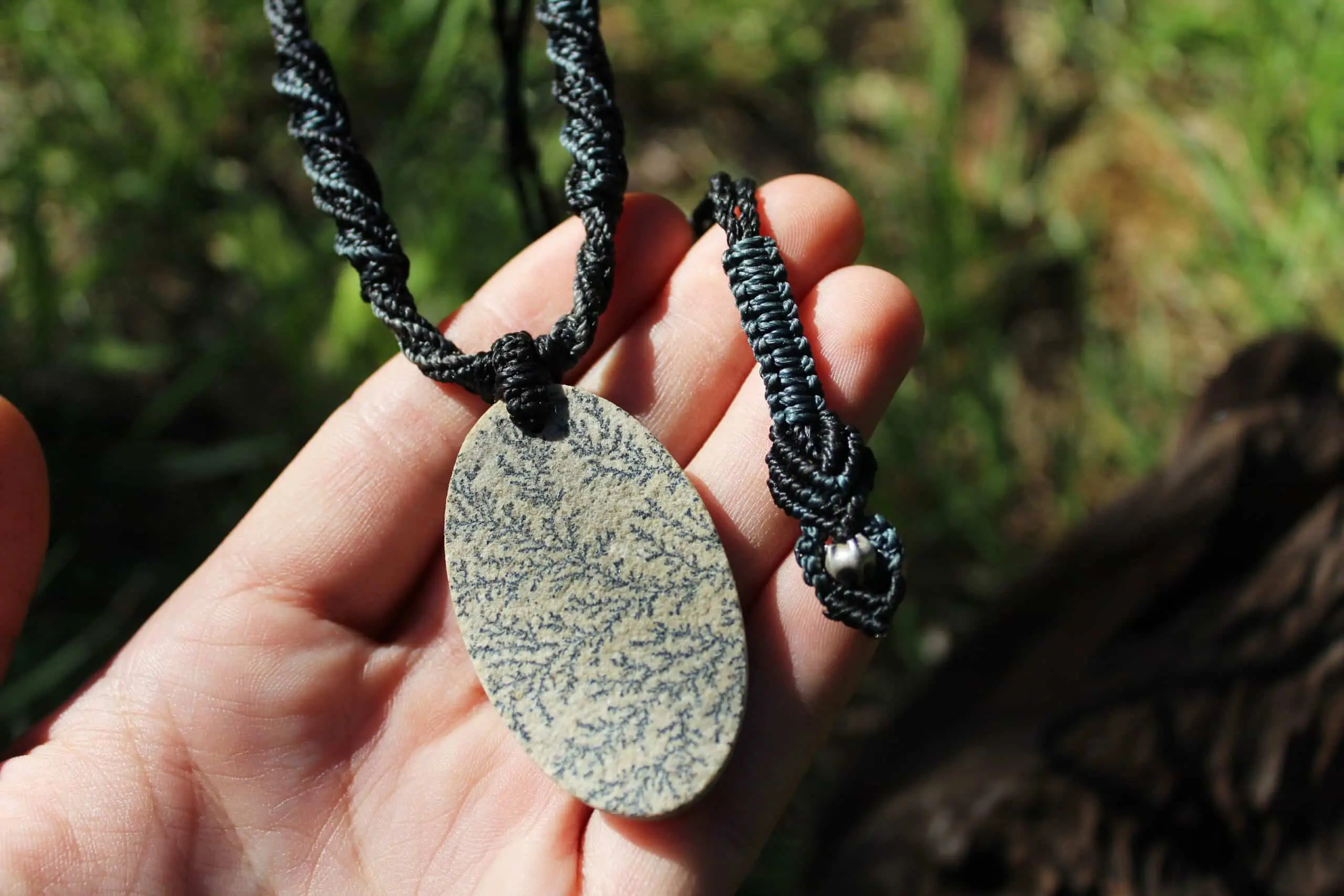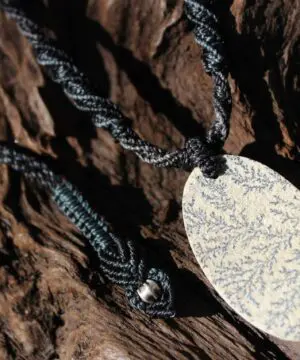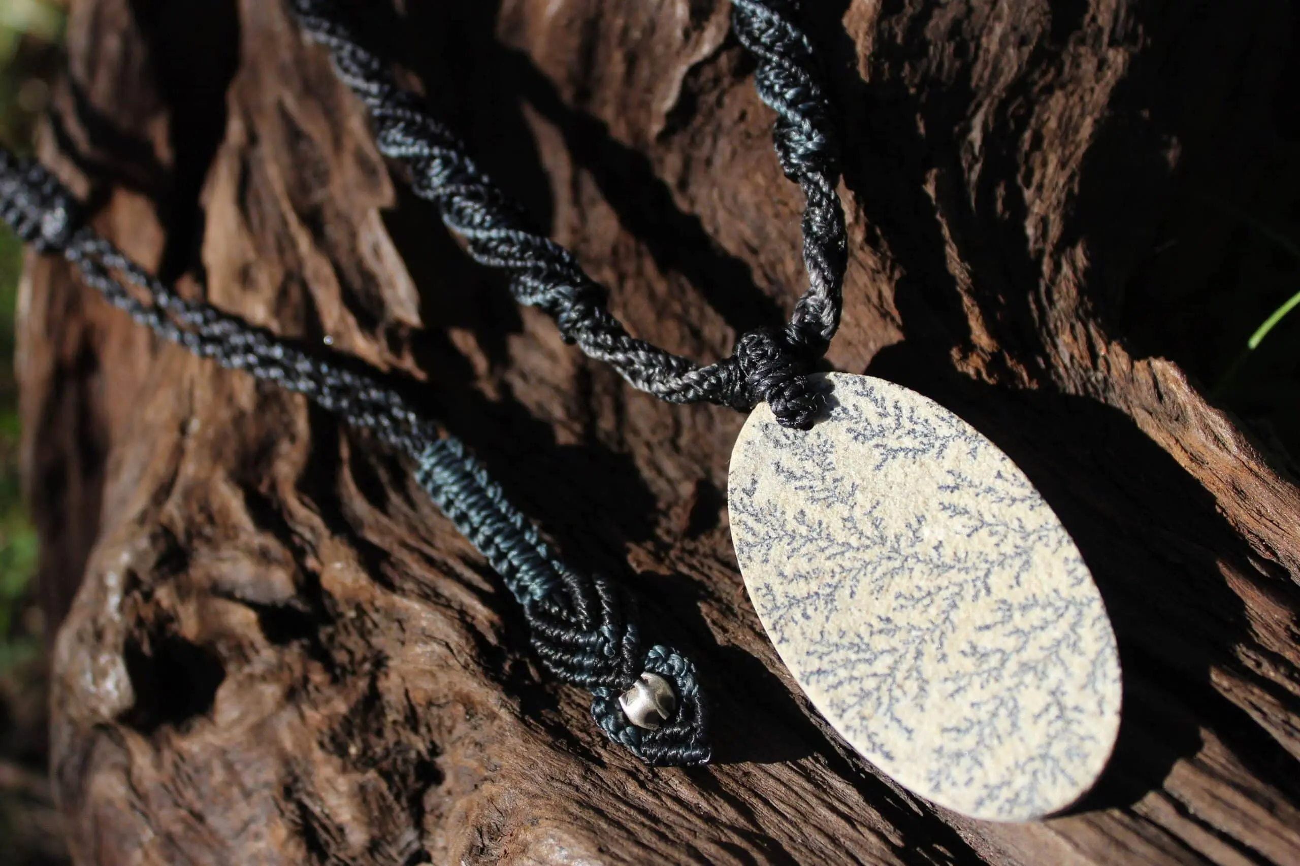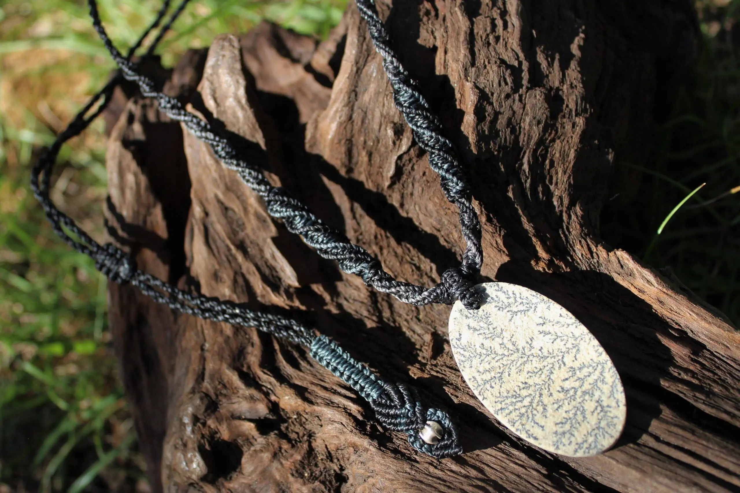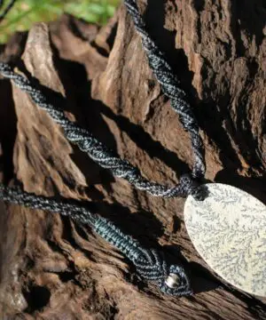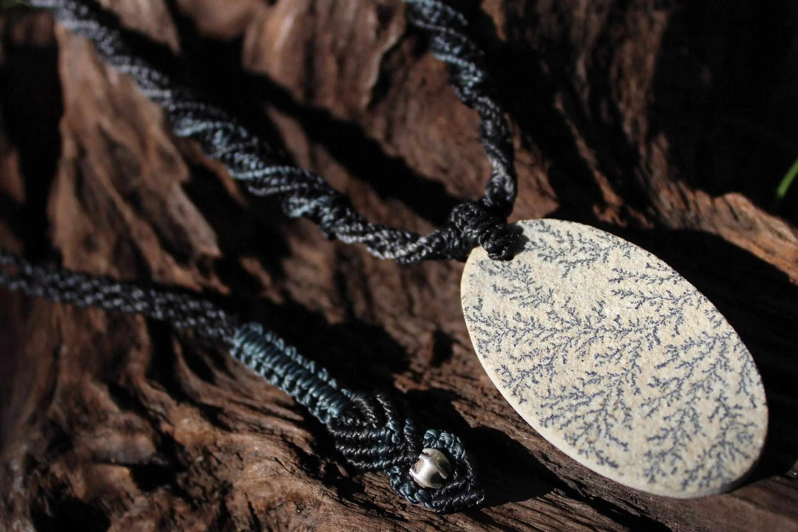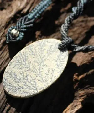 This dendritic tree stone crystal talisman has been handcrafted by us here at Platypus Dreaming in the luscious rainforests of Far North Queensland, Australia. The details on this gem are so delicate looking and the piece is an artwork. It is a large stone to show off its intriguing design. Such high quaility captured with this piece artistically cut to shape by us. The fine tree patterns fan over the beige stone. This talisman is a mirror for nature. The stone itself comes from Turkey – home to some of the most interesting dendritic crystals on Earth. This talisman features a 1000 pure silver tribal bead that has been hand-cut and chiseled using traditional techniques.