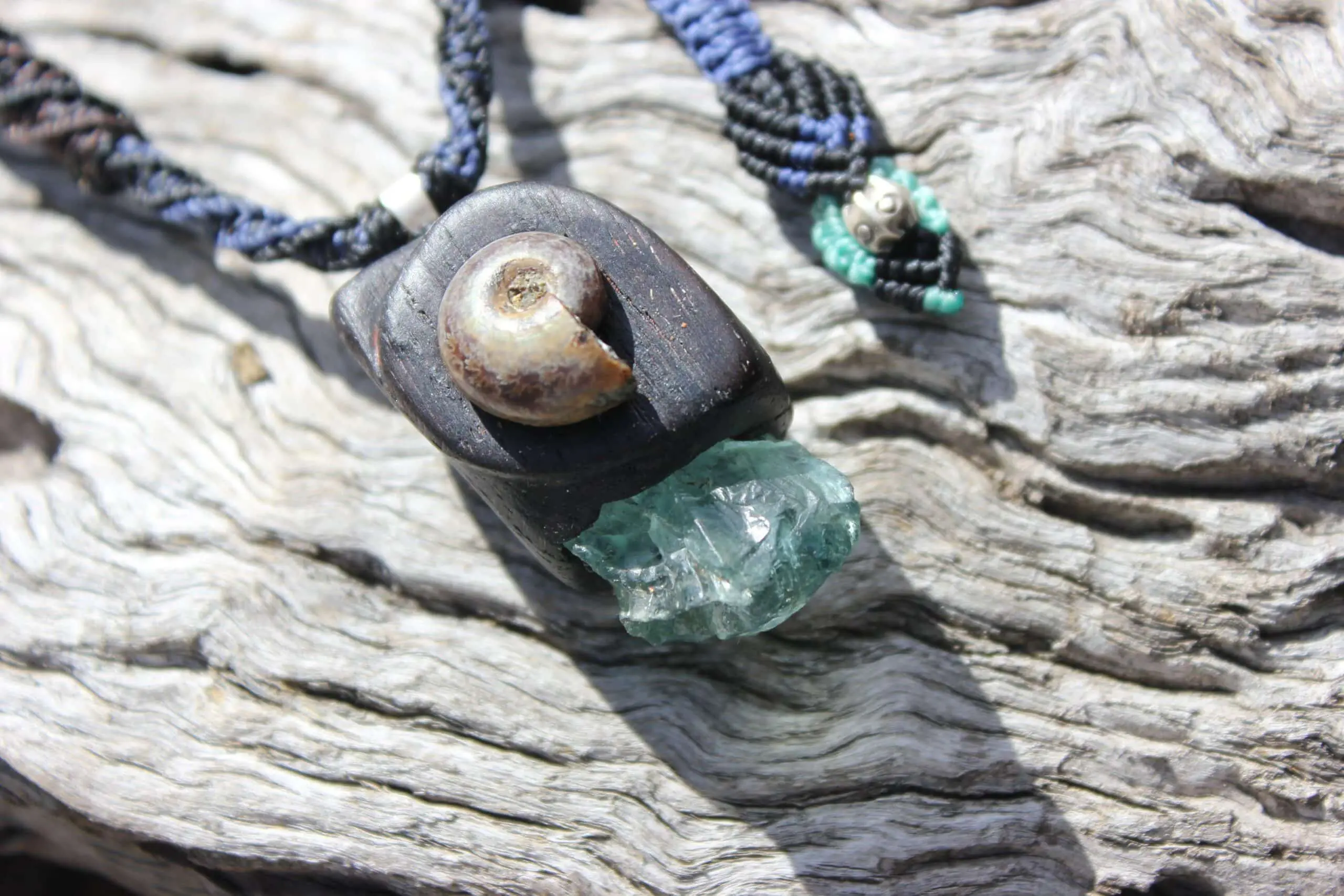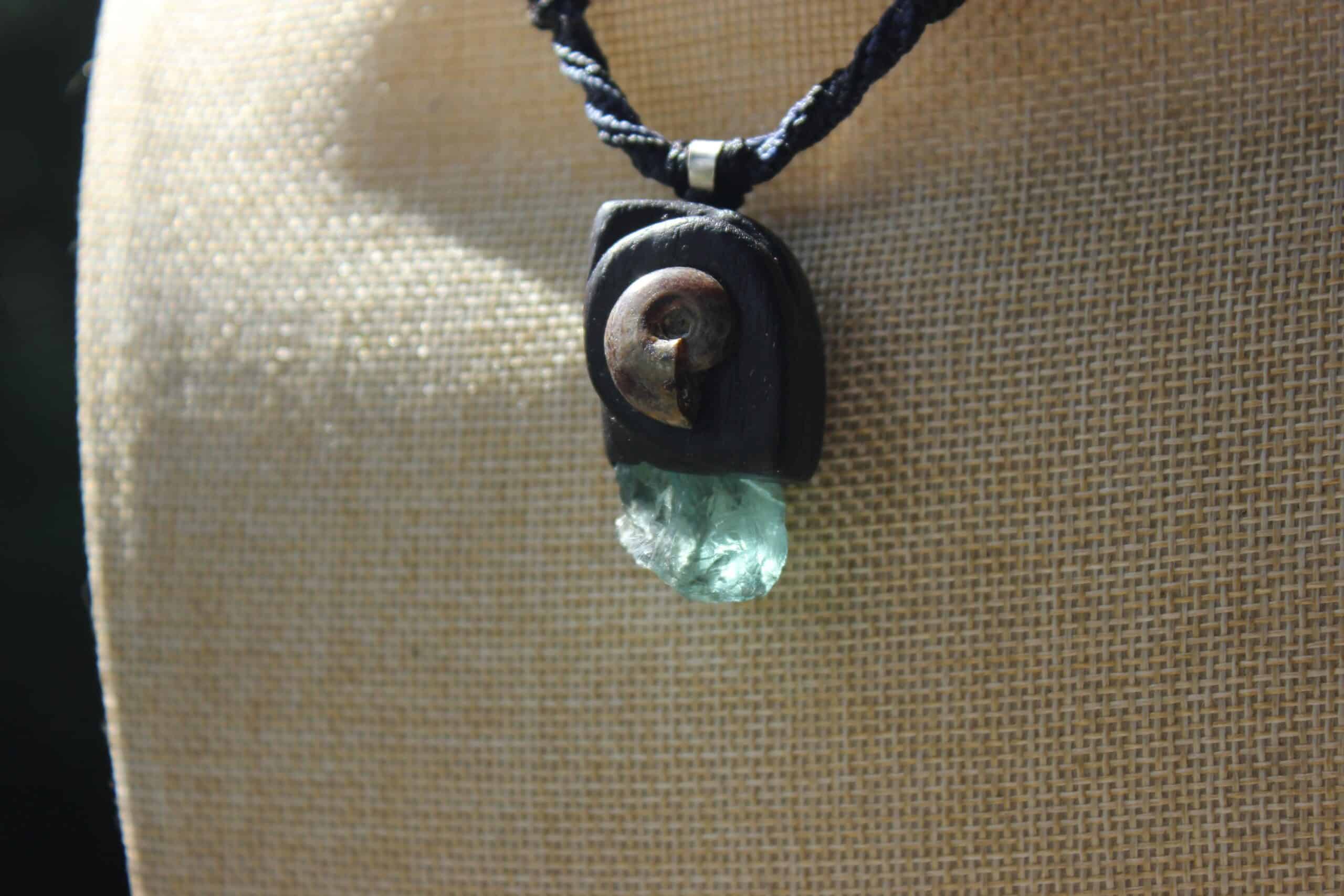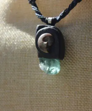 This is an absolutely unique creation, handcrafted by multiple artisans here at Platypus Dreaming. It features Aquamarine and Ammonite, which beautifully harmonize. It has been hand carved from Australian recycled red cedar, then burnt to enhance the features of the grain & give it an aged look. A bronze coating has been washed over to accentuate the antic finish. A blend of natural oils and wax has been applied over a period of several days to nurture the timber and seal it.