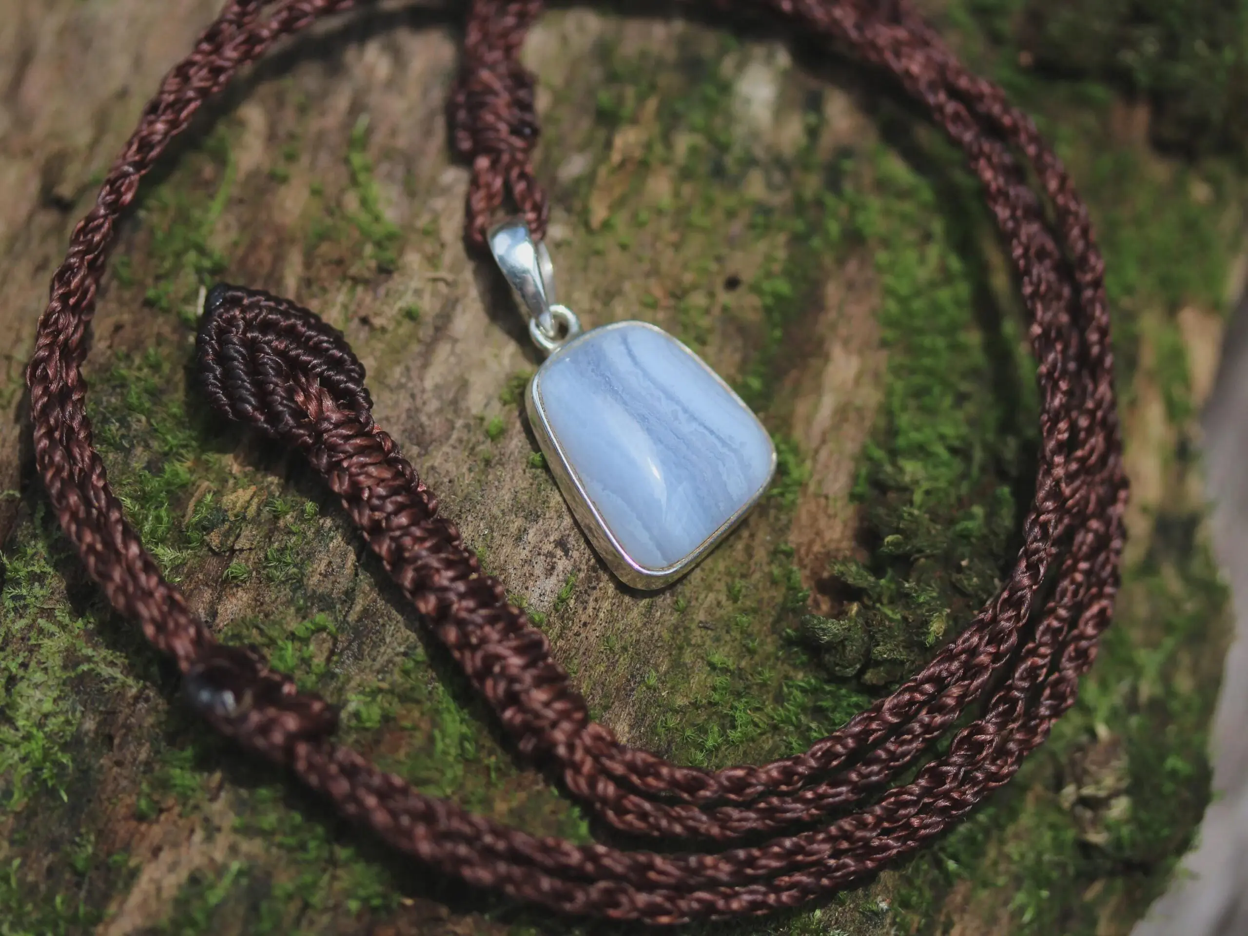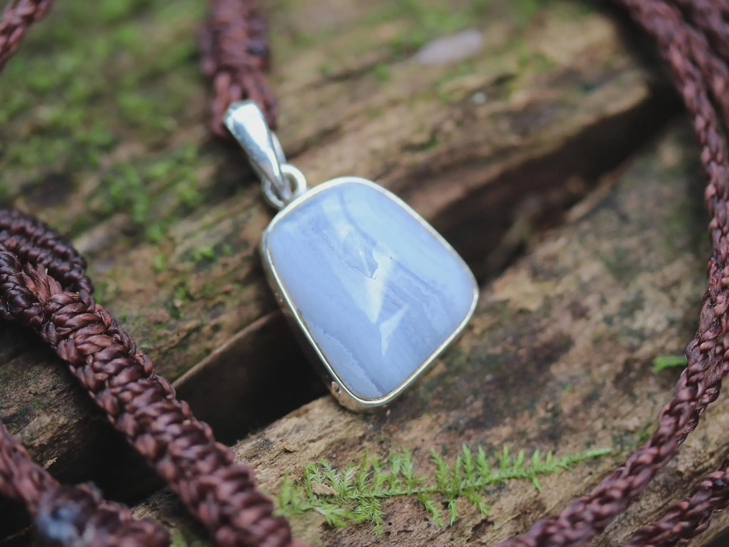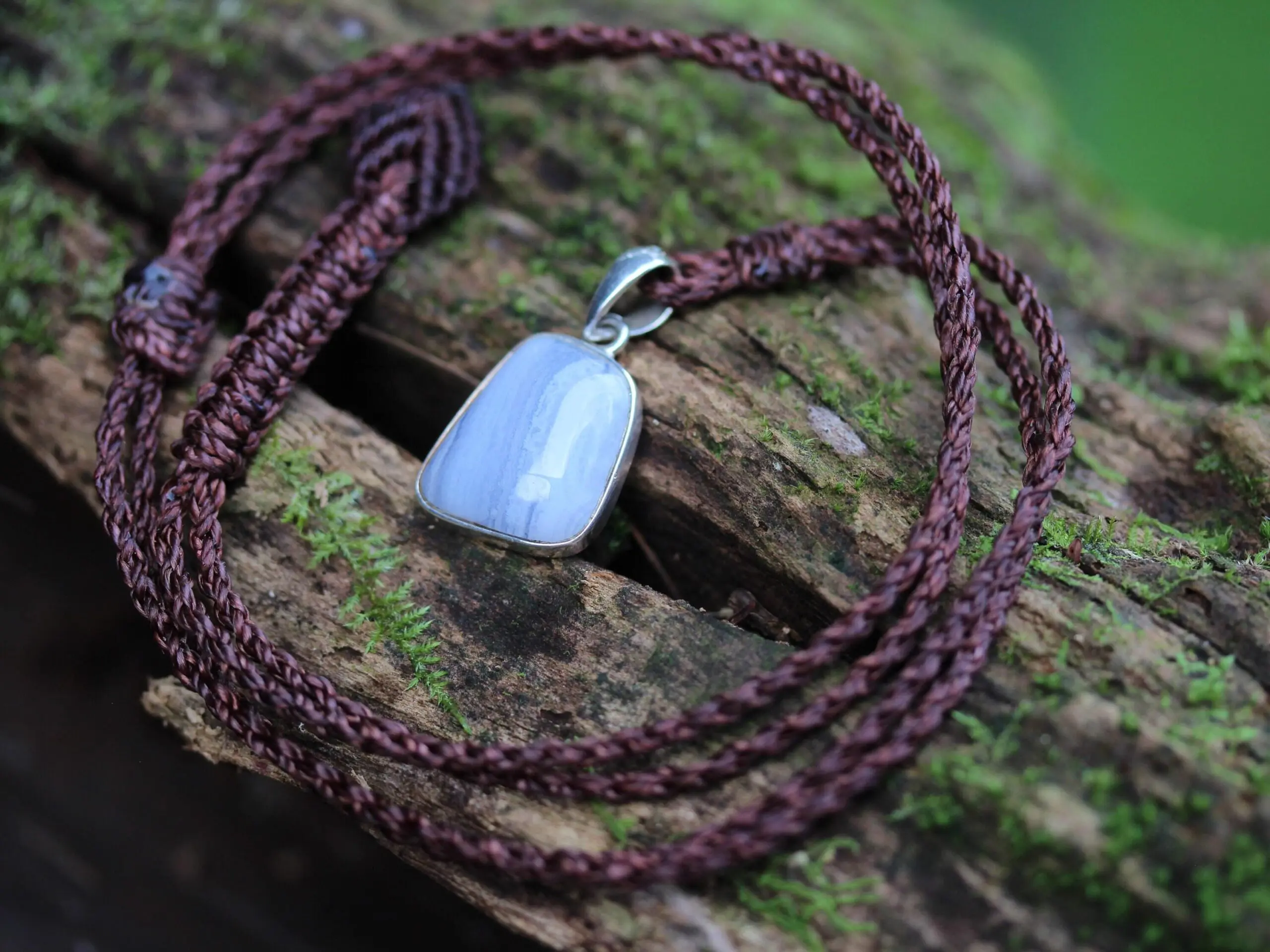 This divine Blue Lace Agate crystal talisman has been handcrafted by us here at Platypus Dreaming in the luscious rainforests of Far North Queensland, Australia. It is part of a silver set. Blue Lace Agate is one of the rarest forms of banded Chalcedony. Some specimens, in particular, have a coating of tiny druzy crystals within or on top of the banding formations. This stone has been ethically sourced and consciously polished – making it ideal for use in crystal healing.