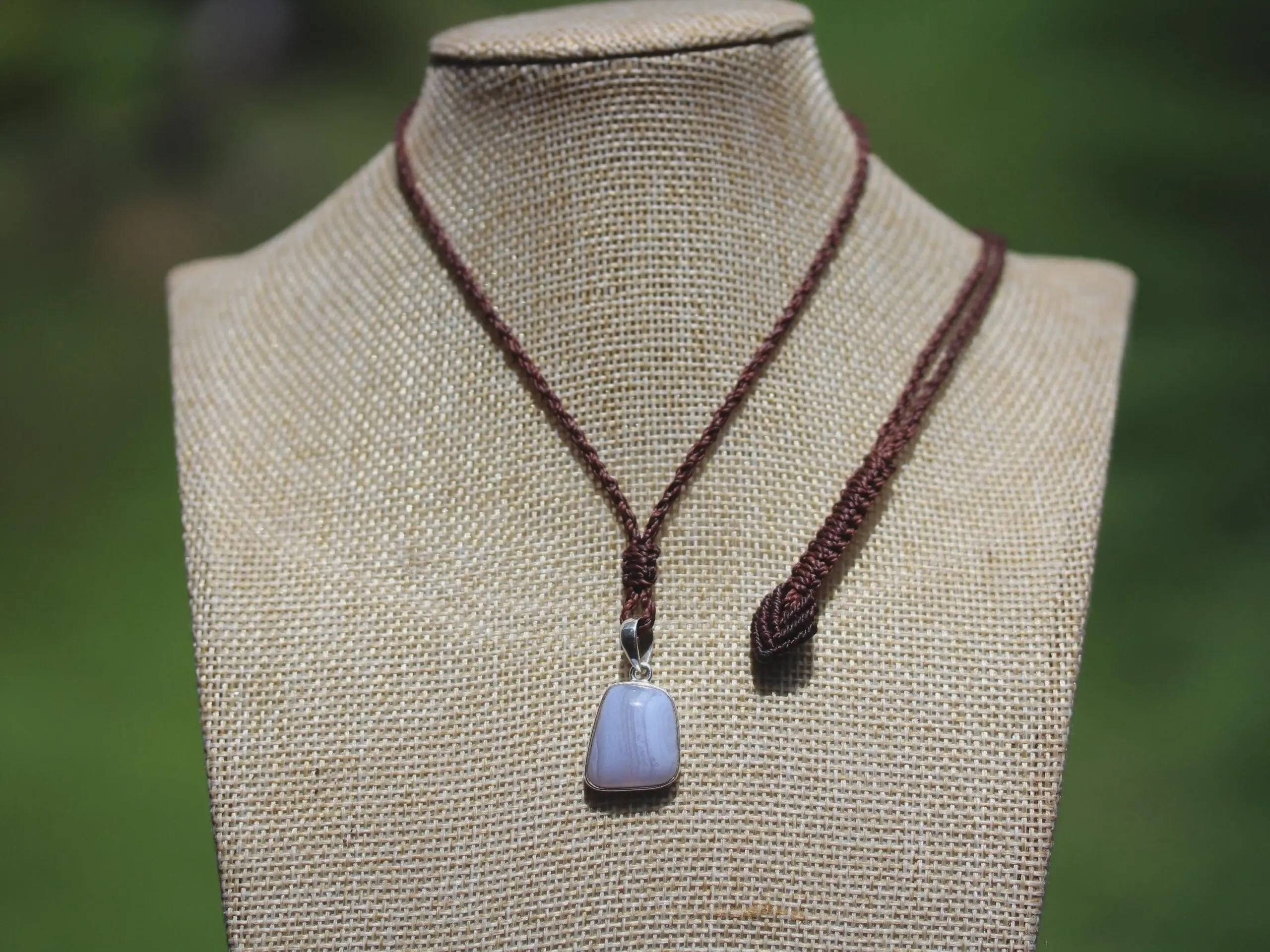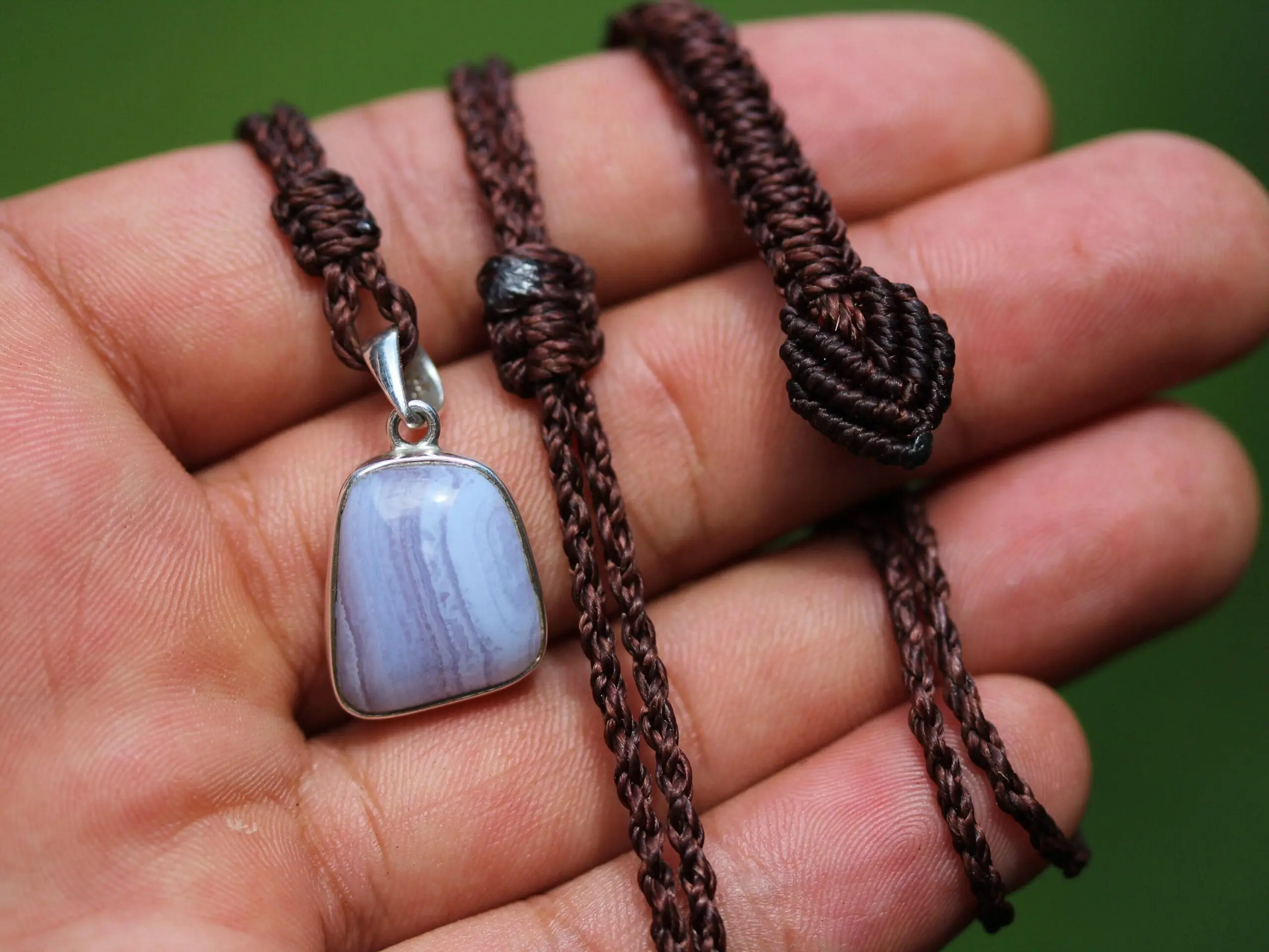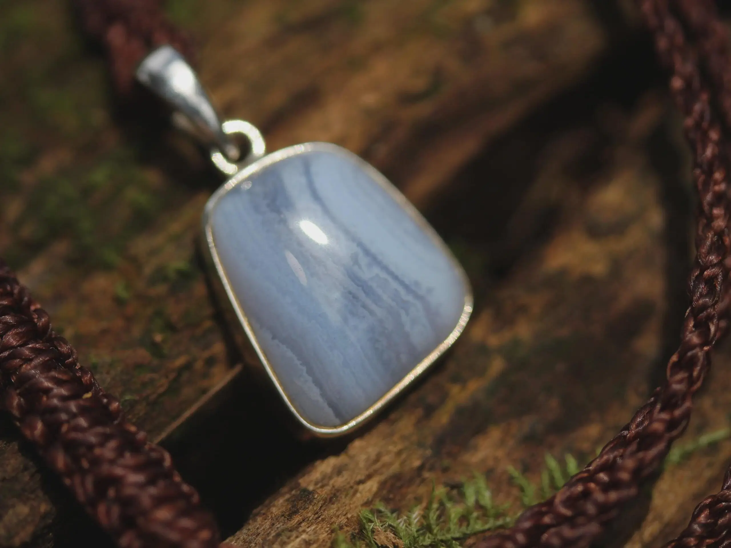 This divine Blue Lace Agate crystal talisman has been handcrafted by us here at Platypus Dreaming in the luscious rainforests of Far North Queensland, Australia. It is part of a silver set. Blue Lace Agate is one of the rarest forms of banded Chalcedony. Some specimens, in particular, have a coating of tiny druzy crystals within or on top of the banding formations. This stone has been ethically sourced and consciously polished – making it ideal for use in crystal healing.