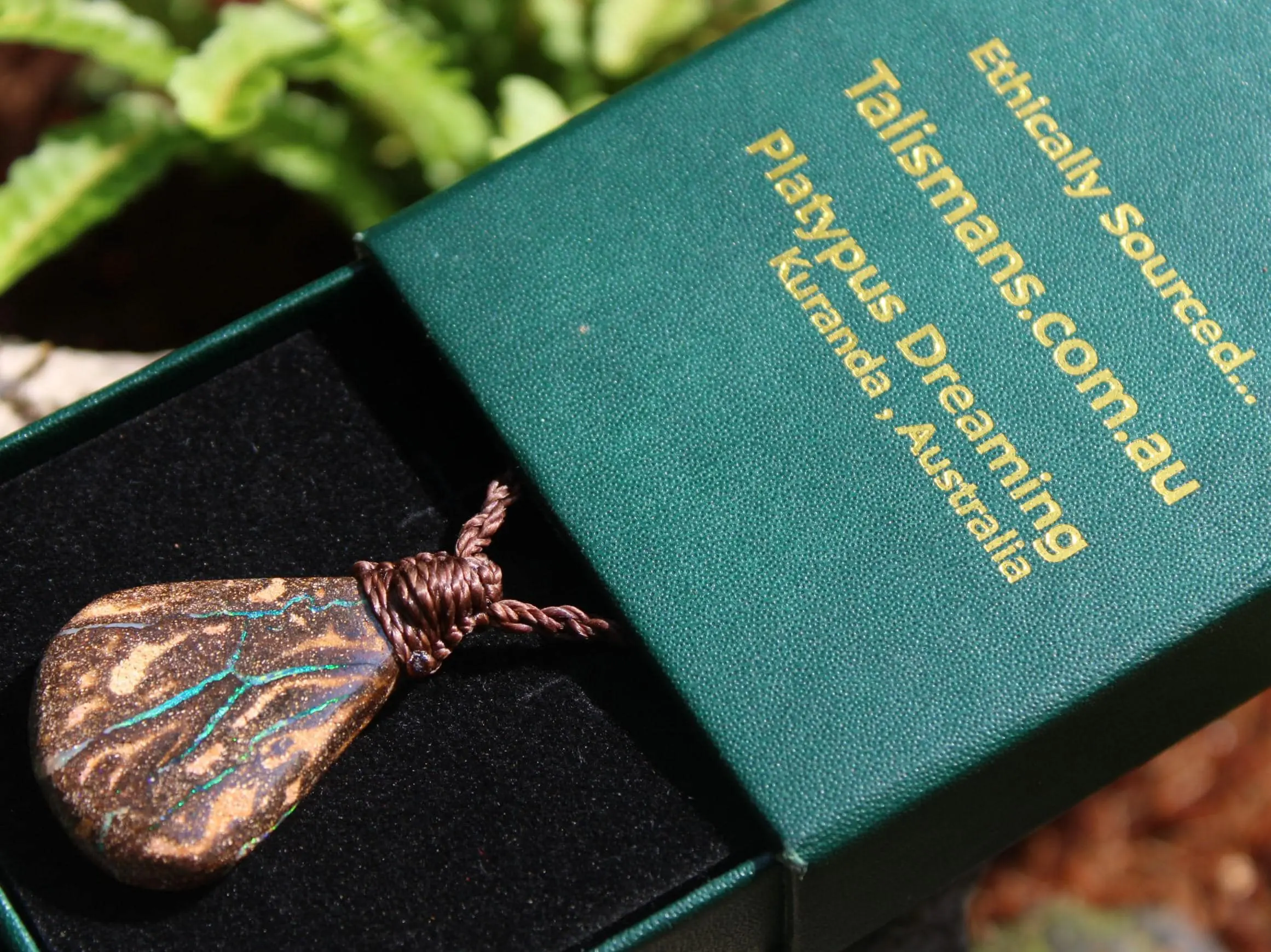 This is a beautiful handcrafted AAA-quality Queensland Boulder Opal talisman, created by our Platypus Dreaming collective in the ancient rainforests of Kuranda, Far North Queensland — Ngunbay / Djabugay Country.