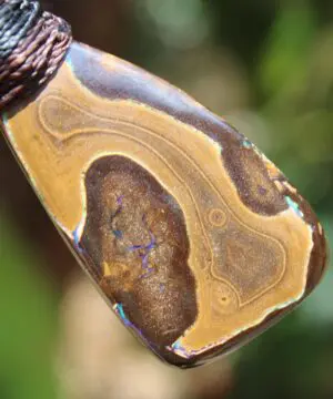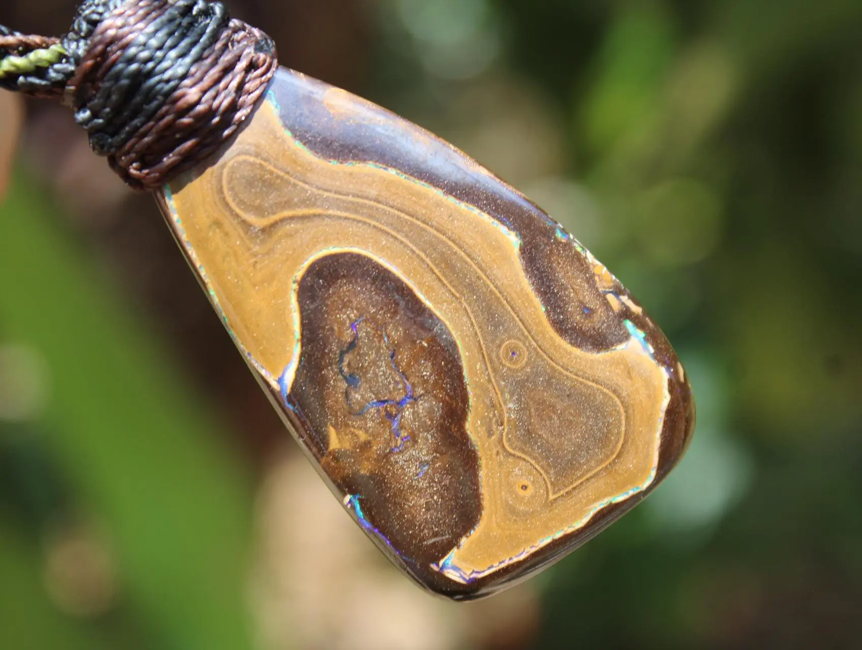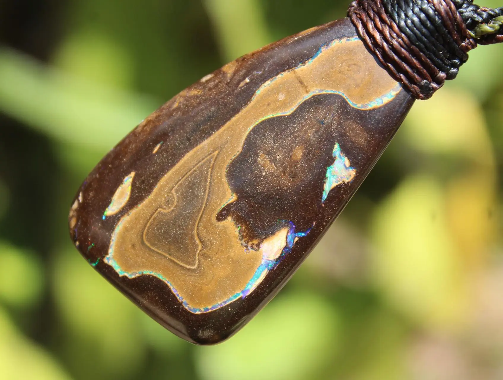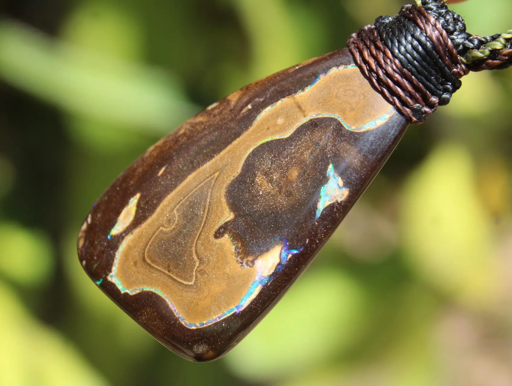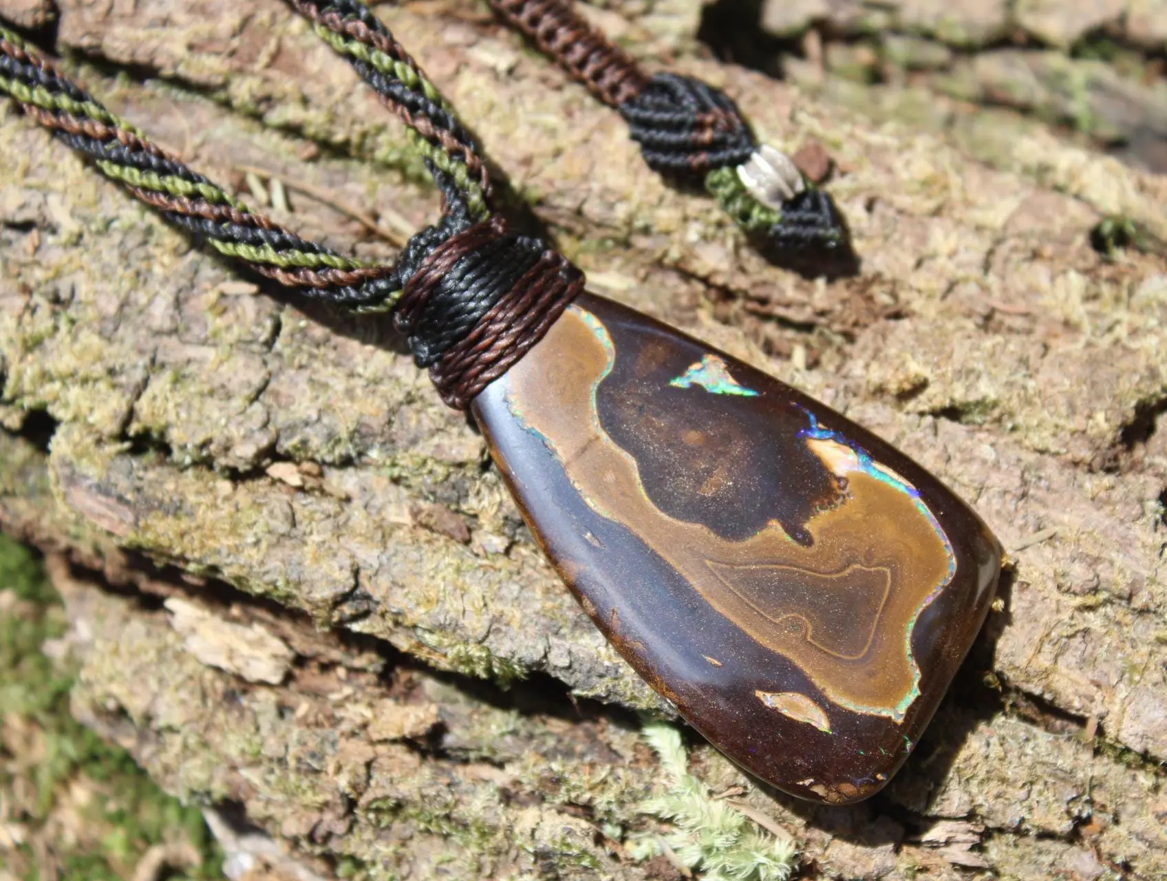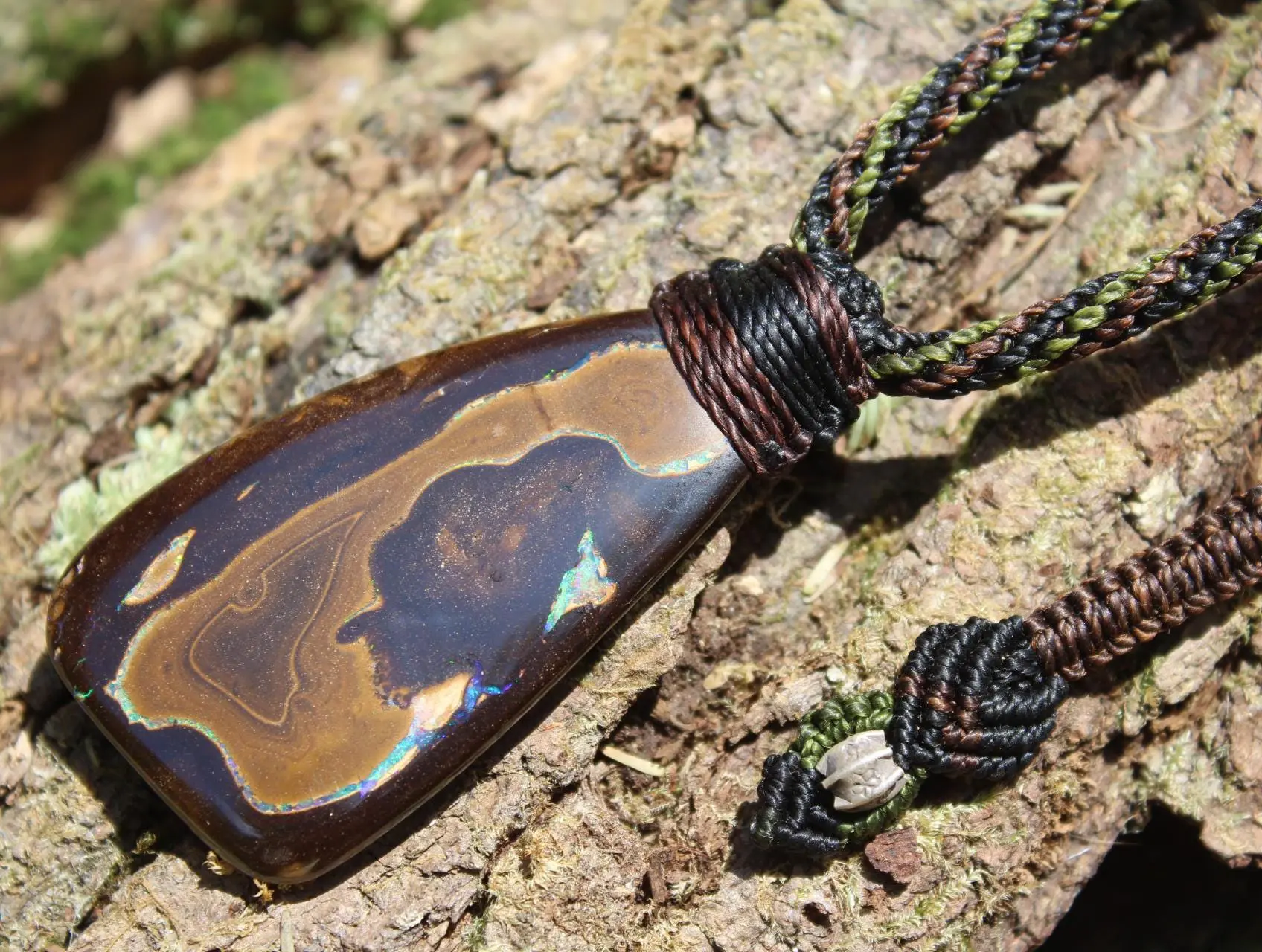 This is a beautiful handcrafted AAA-quality Queensland Boulder Opal talisman, created by our Platypus Dreaming collective in the ancient rainforests of Kuranda, Far North Queensland — Ngunbay / Djabugay Country.