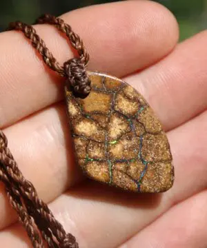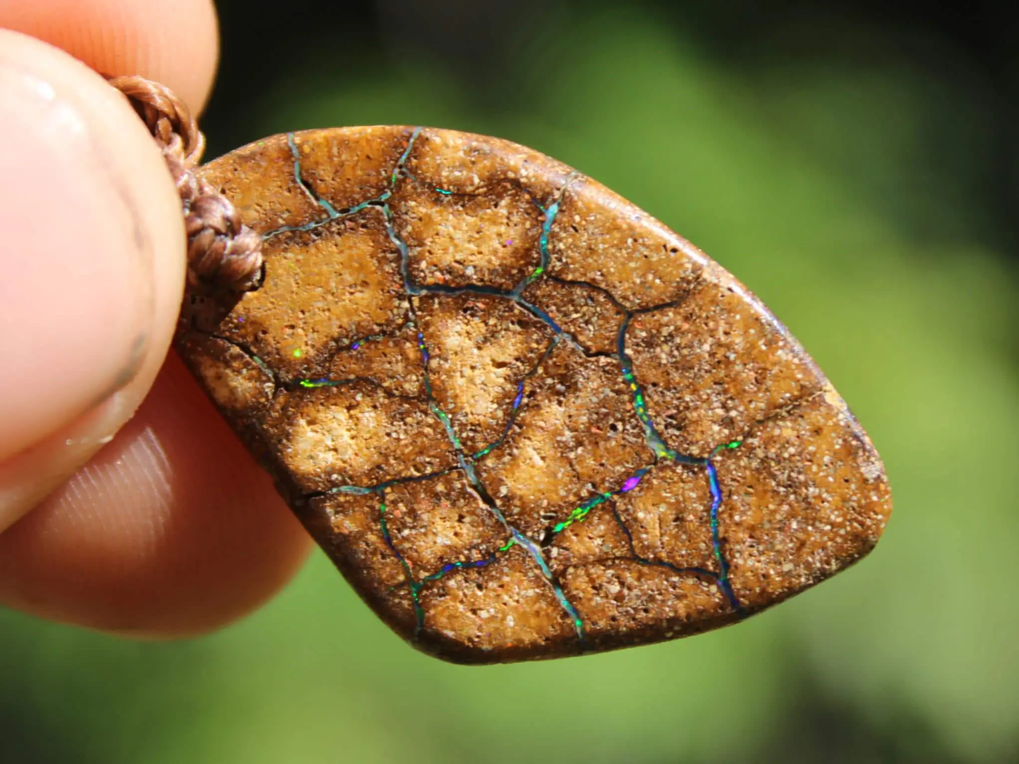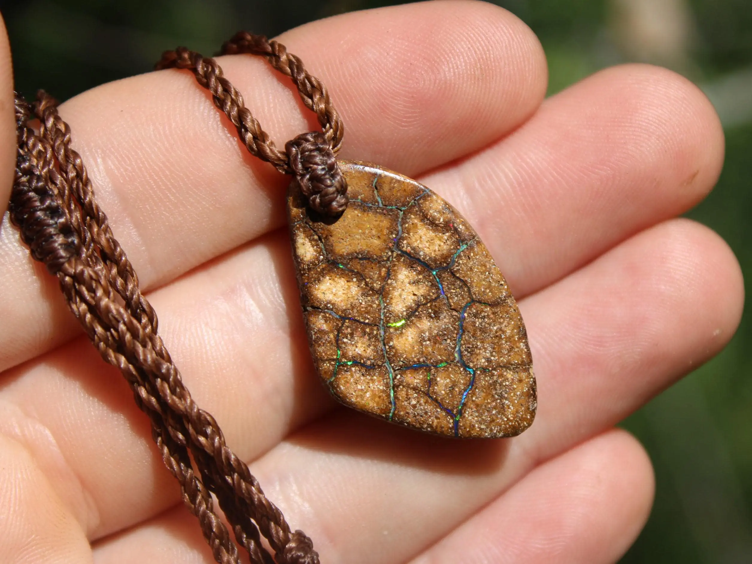 Boulder Opal flashes different colours at different angles — greens, blues, reds, violets, golds — shifting with every movement.