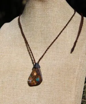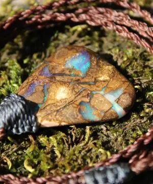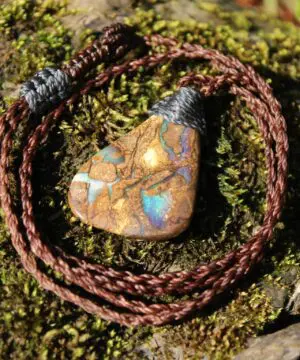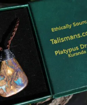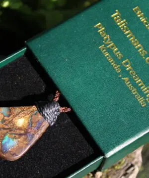 This is a beautiful handcrafted AAA-quality Queensland Boulder Opal talisman, created by our Platypus Dreaming collective in the ancient rainforests of Kuranda, Far North Queensland — Ngunbay / Djabugay Country.