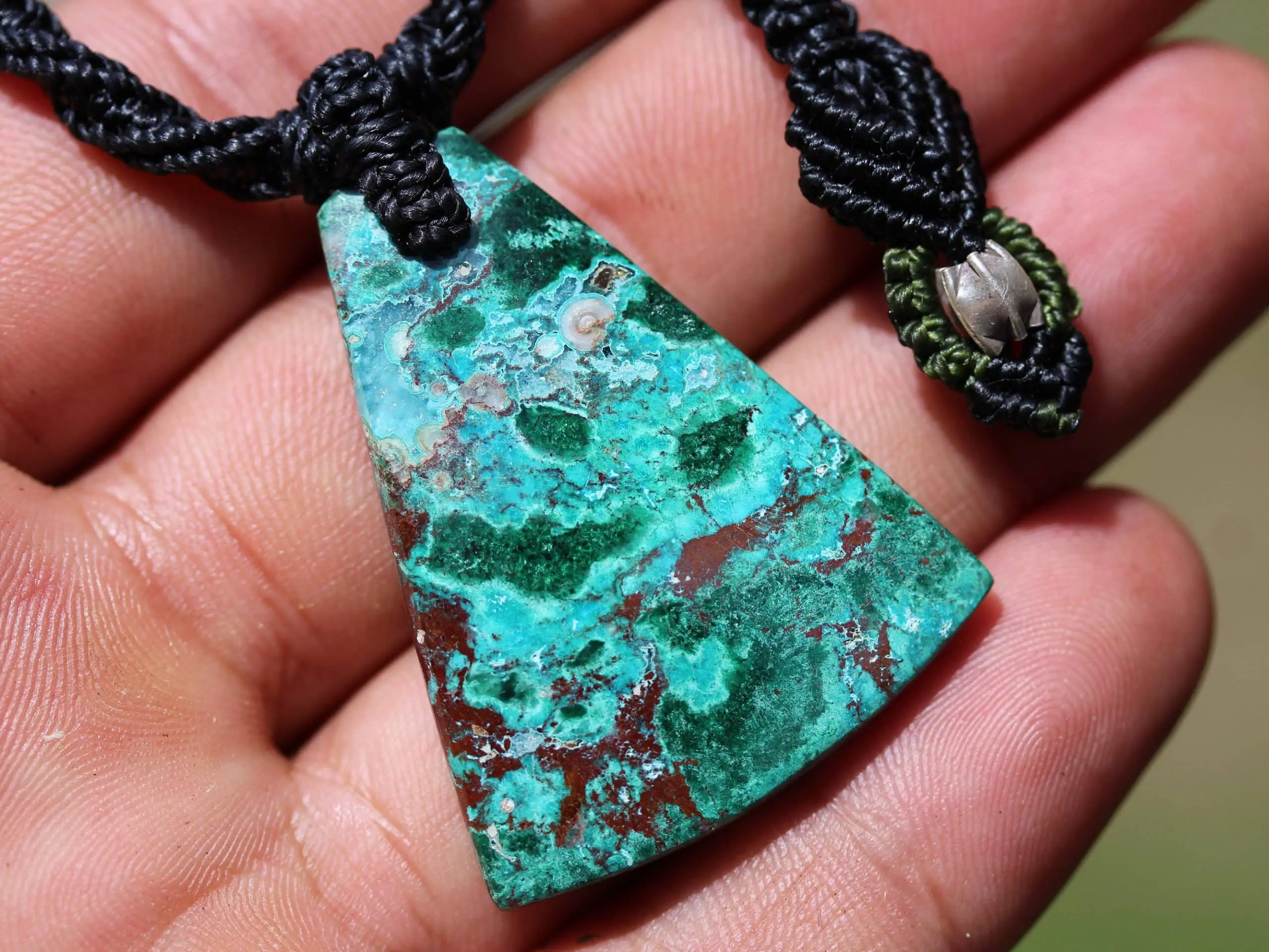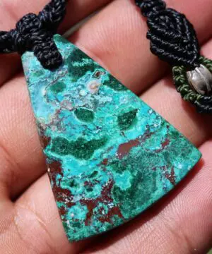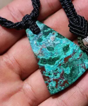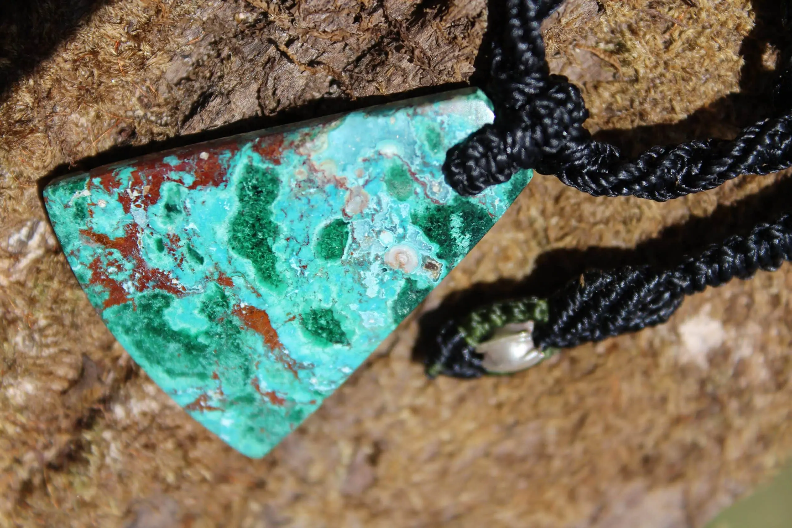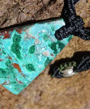 This is a powerful rare Australian Chrysocolla crystal talisman. Chrysocolla is a powerful blend of azurite, malachite and cuprite, and all these elements are evident in this stunning hand-polished designer cabochon. This chrysocolla is some of the highest quality we have been able to source, and comes from Queensland, Australia. Australian Chrysocolla is a vibrant gemstone with a stunning blue-green hue, similar to the very popular turquoise. A very striking stone that is 100% natural. This stone is almost always opaque, and when it is cut and polished, chrysocolla has a high-shine, vitreous luster. Chrysocolla can be found in Chile, Israel, Mexico, Peru, Russia and the US – but the stunning Australian variety is very rare with a very limited supply on Earth. This talisman also features a 1000 pure silver tribal bead that has been hand-cut and chiseled using traditional techniques.