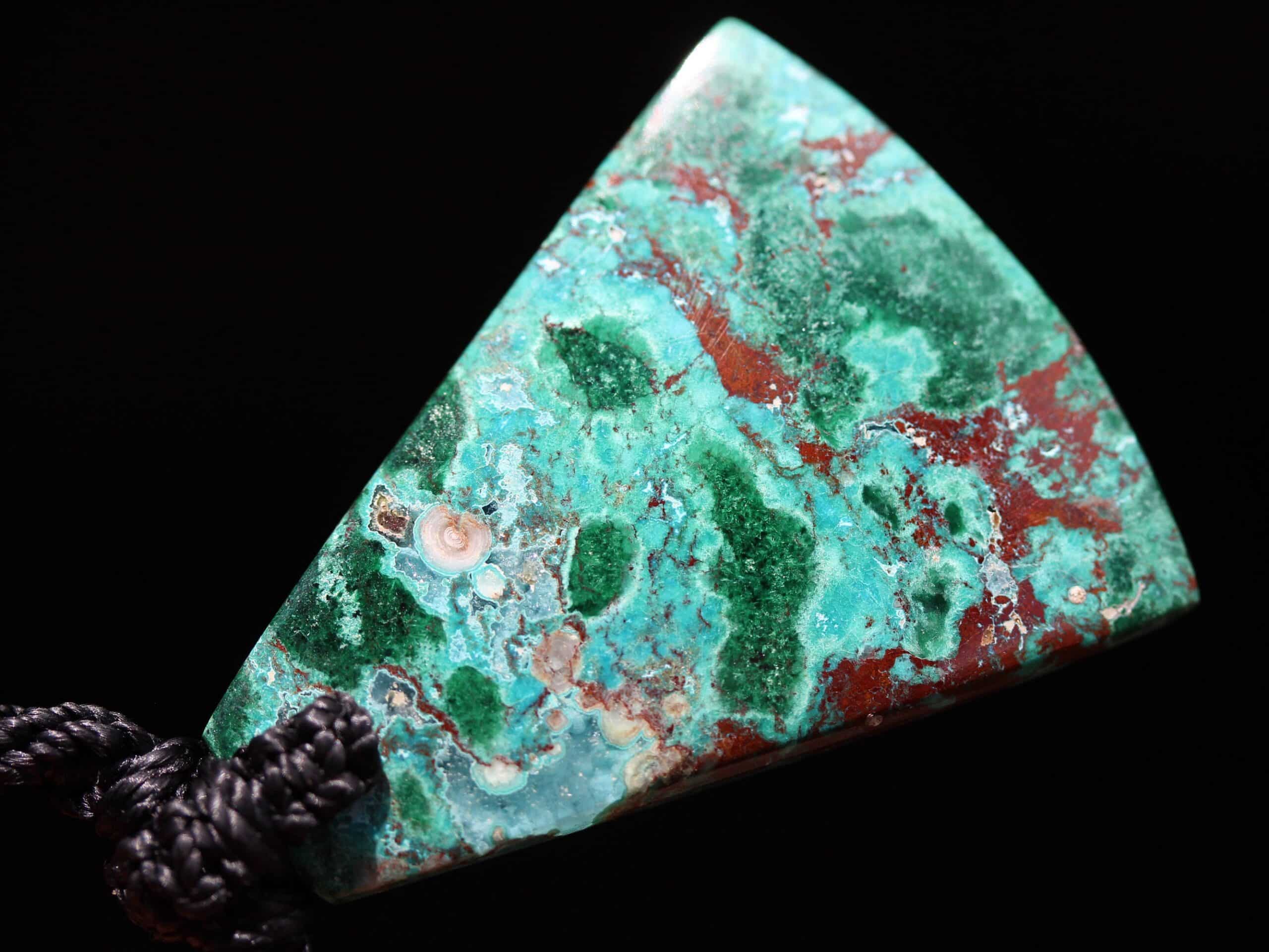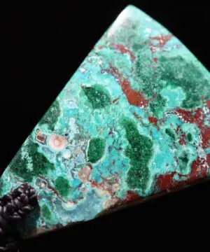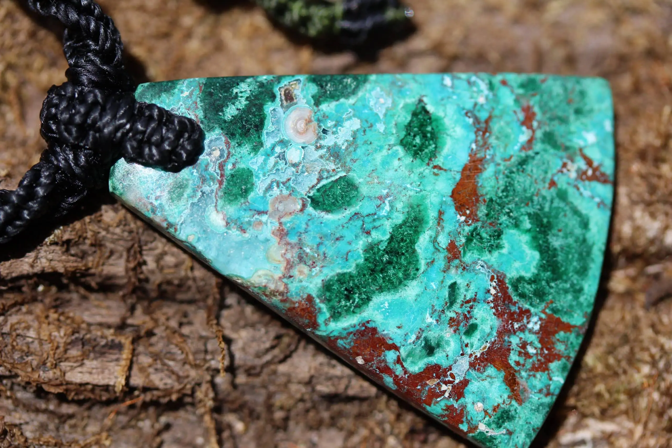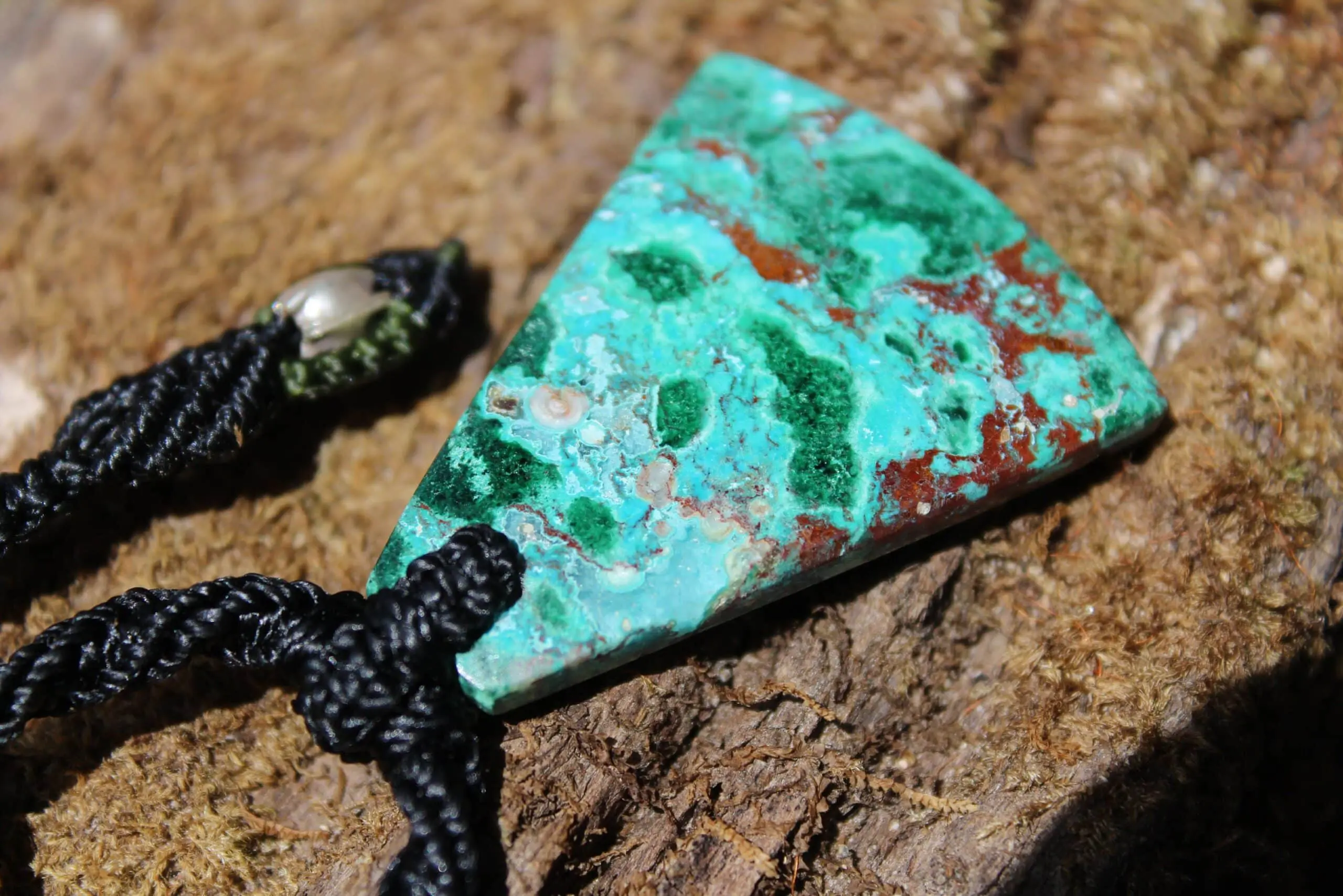 This is a powerful rare Australian Chrysocolla crystal talisman. Chrysocolla is a powerful blend of azurite, malachite and cuprite, and all these elements are evident in this stunning hand-polished designer cabochon. This chrysocolla is some of the highest quality we have been able to source, and comes from Queensland, Australia. Australian Chrysocolla is a vibrant gemstone with a stunning blue-green hue, similar to the very popular turquoise. A very striking stone that is 100% natural. This stone is almost always opaque, and when it is cut and polished, chrysocolla has a high-shine, vitreous luster. Chrysocolla can be found in Chile, Israel, Mexico, Peru, Russia and the US – but the stunning Australian variety is very rare with a very limited supply on Earth. This talisman also features a 1000 pure silver tribal bead that has been hand-cut and chiseled using traditional techniques.