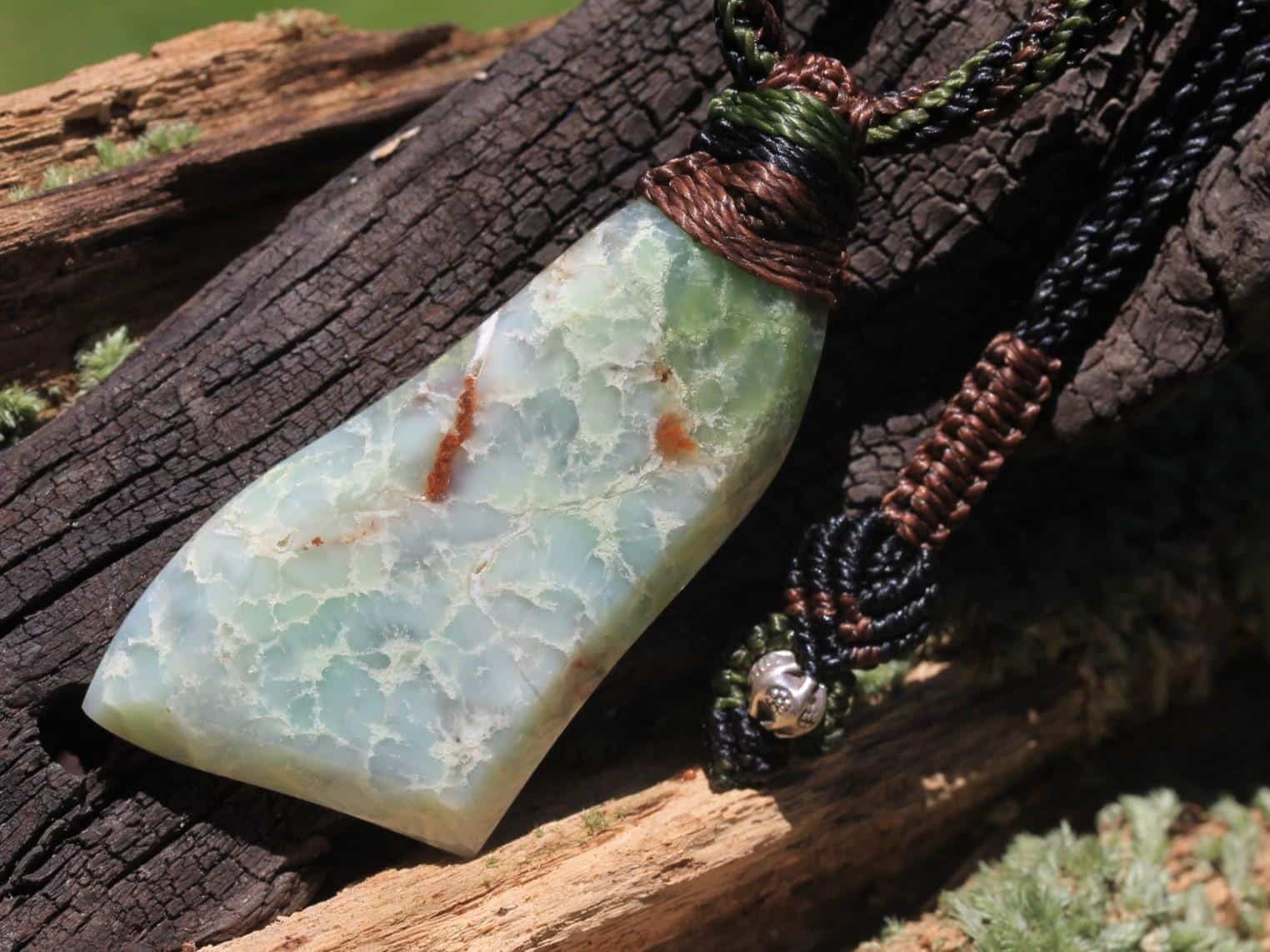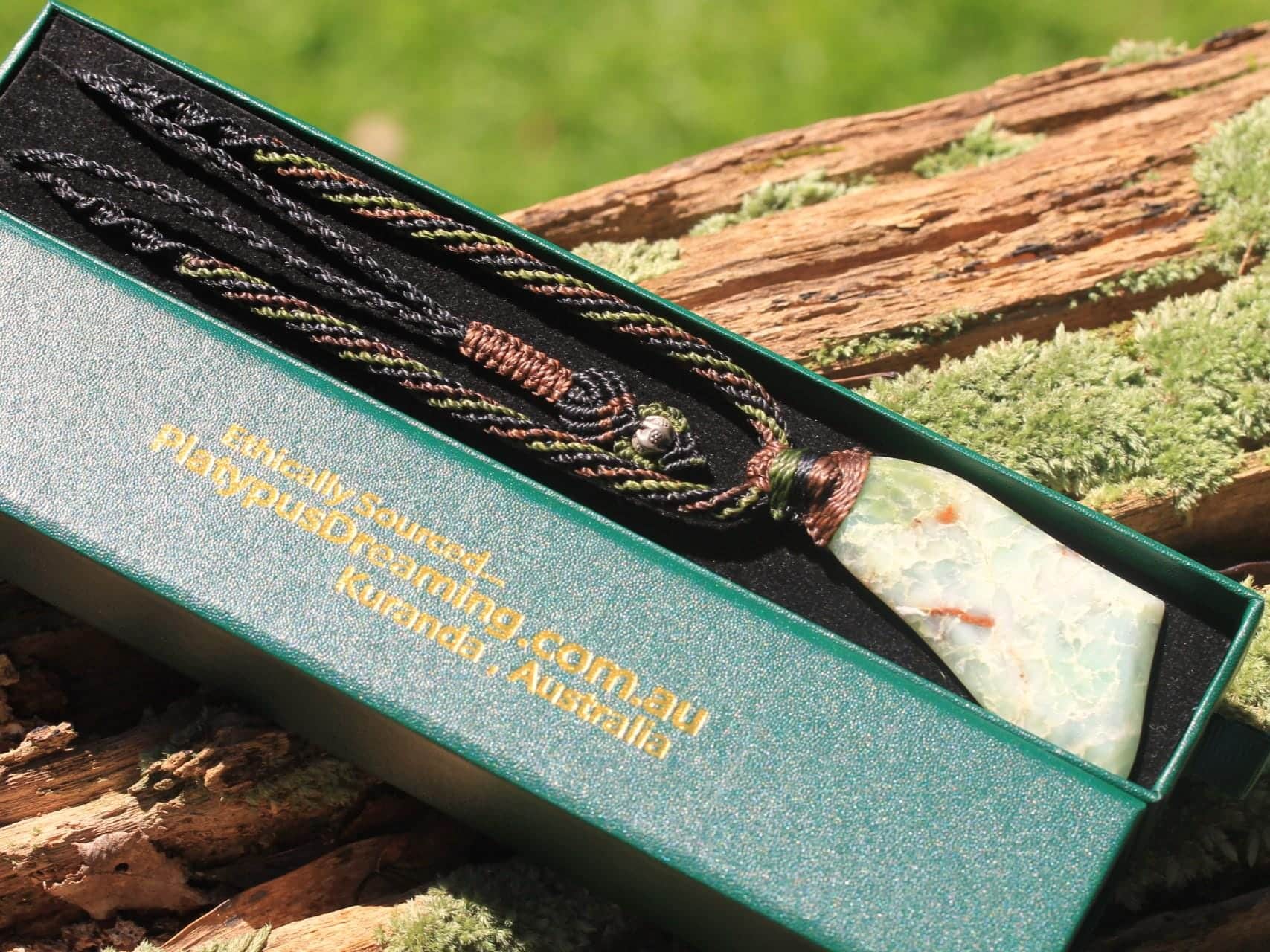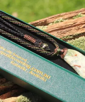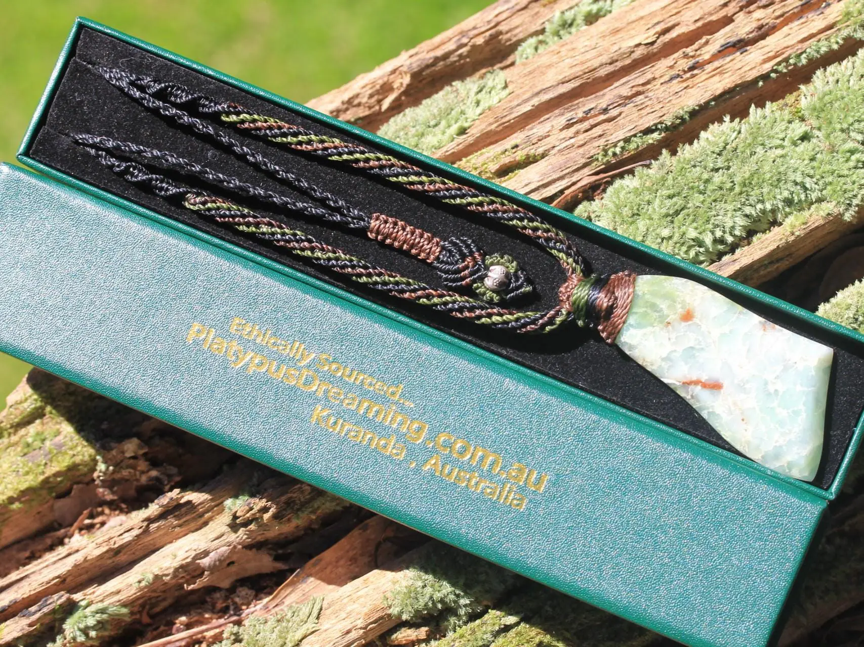 This divine dendritic Chrysoprase crystal talisman has been handcrafted by us here at Platypus Dreaming in the luscious rainforests of Far North Queensland, Australia. This is a rare stone – and not easy to find in such a stunning bottle green colour. The stone originates from Marlborough, Queensland. It is a soothing and calming one-of-a-kind creation. This talisman features a 1000 pure silver tribal bead that has been hand-cut and chiseled using traditional techniques.