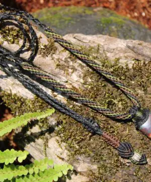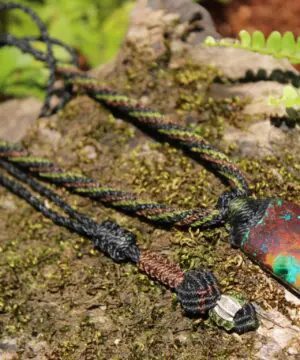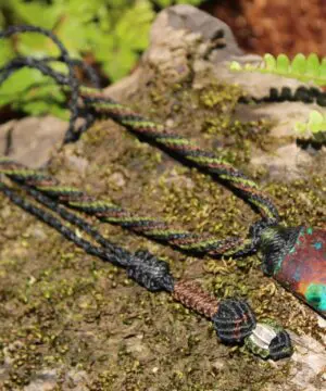 Each piece is a true collaboration of love — the stone was hand-cut and polished by my husband, while I handwoven the macramé tropical cord using an ancient knot technique for strength and beauty.