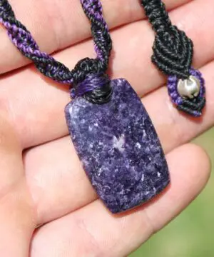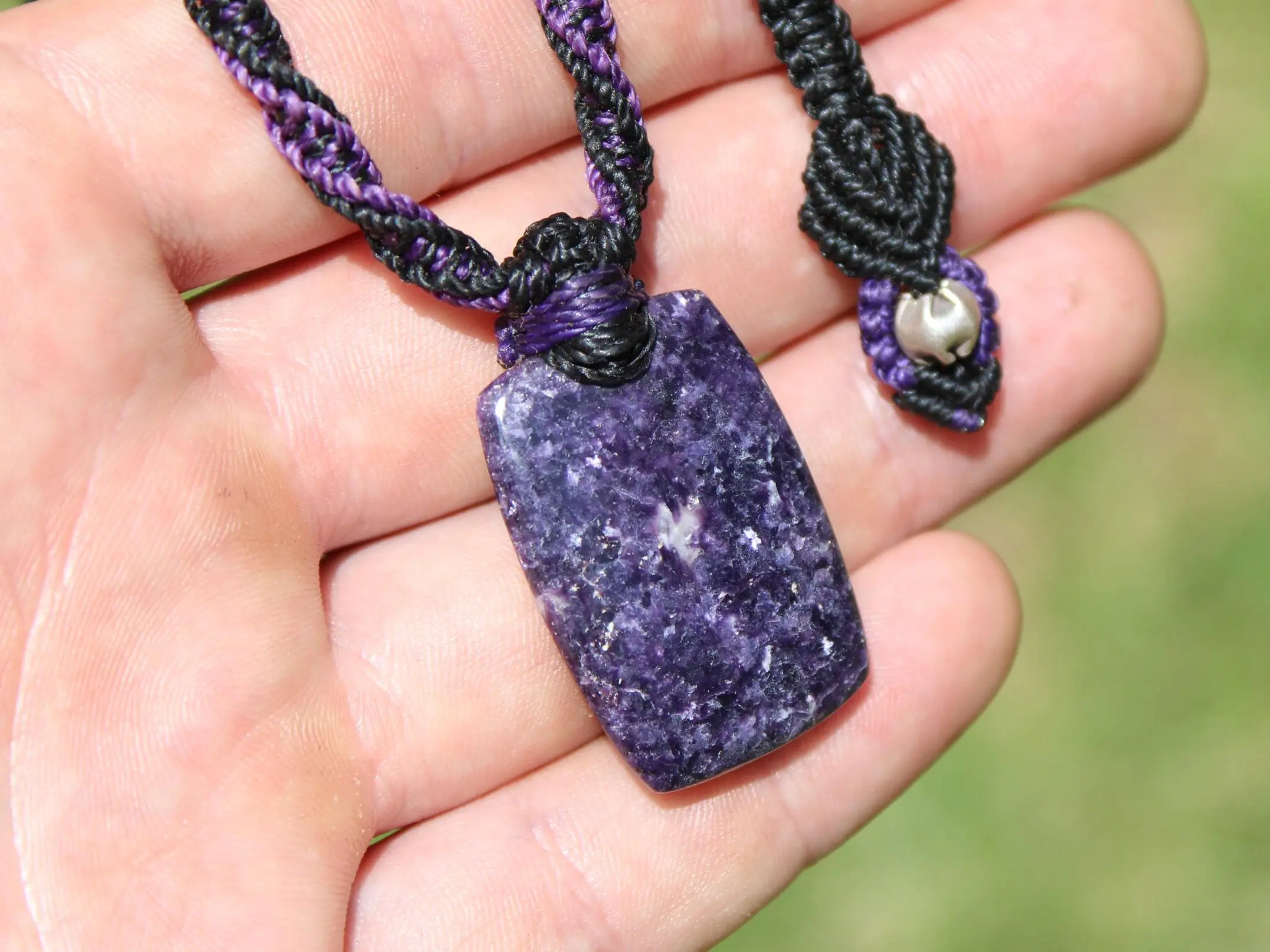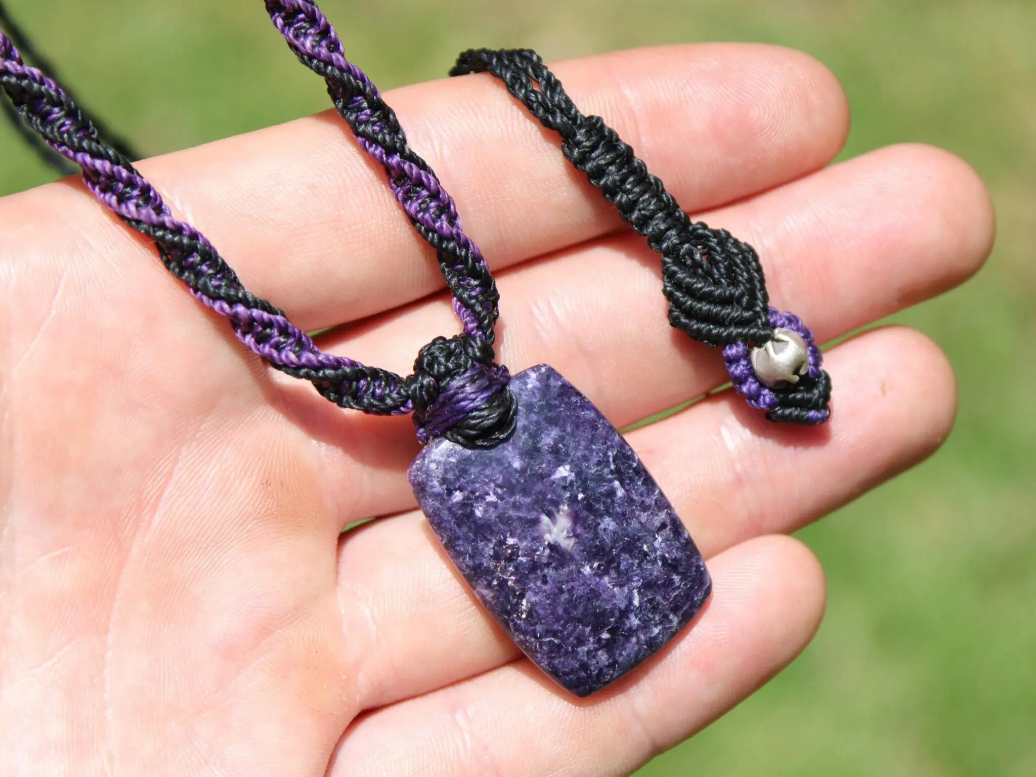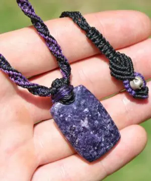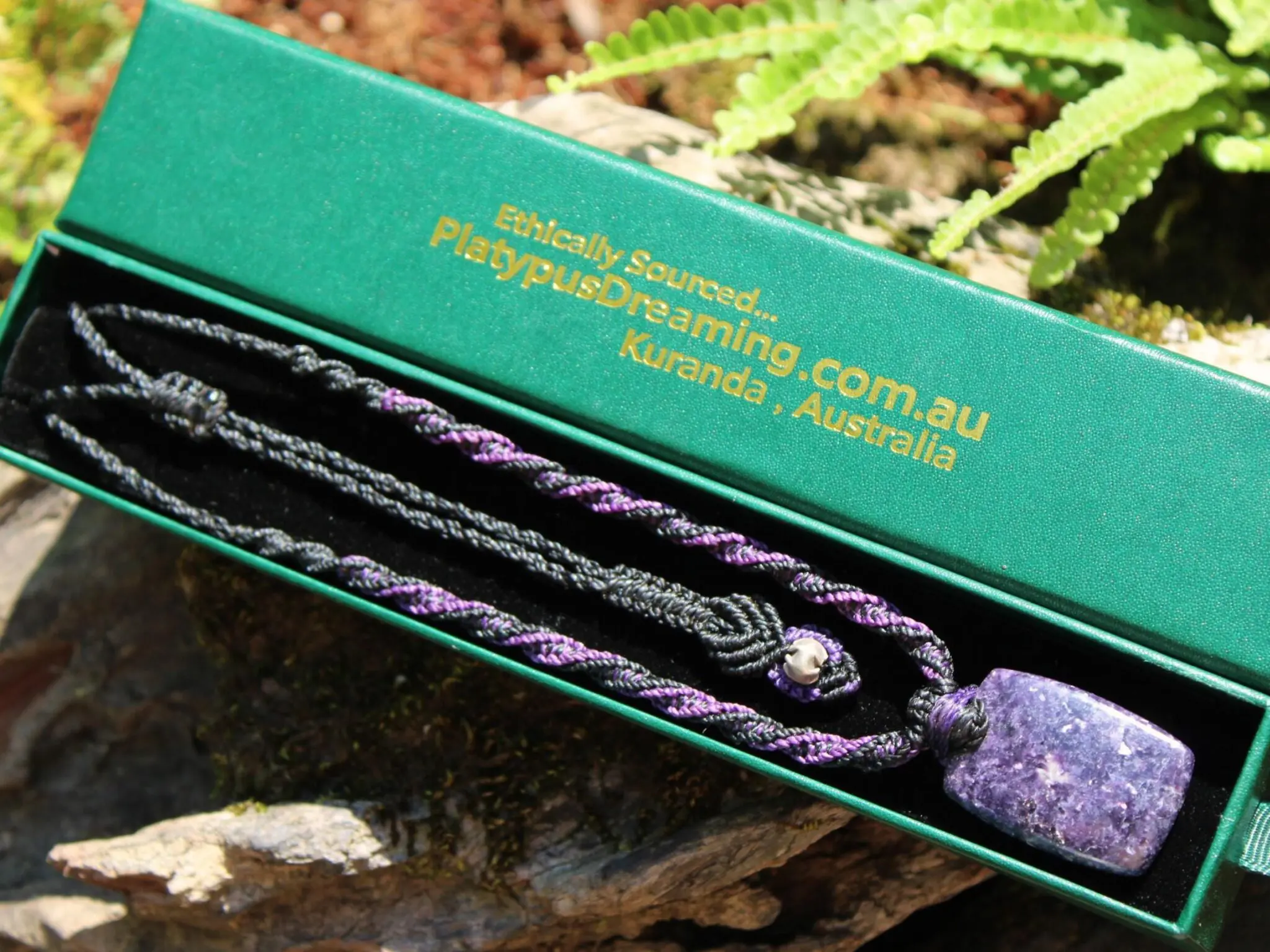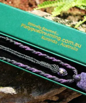 This playful lepidolite crystal pendant has been handpolished by us here at Platypus Dreaming in Far North Queensland, Australia, and handwoven using ancient knot technique. It is one of the only stones we could find that comes from Victoria, Australia. This necklace can also be adjusted to a child size! – please get in touch.