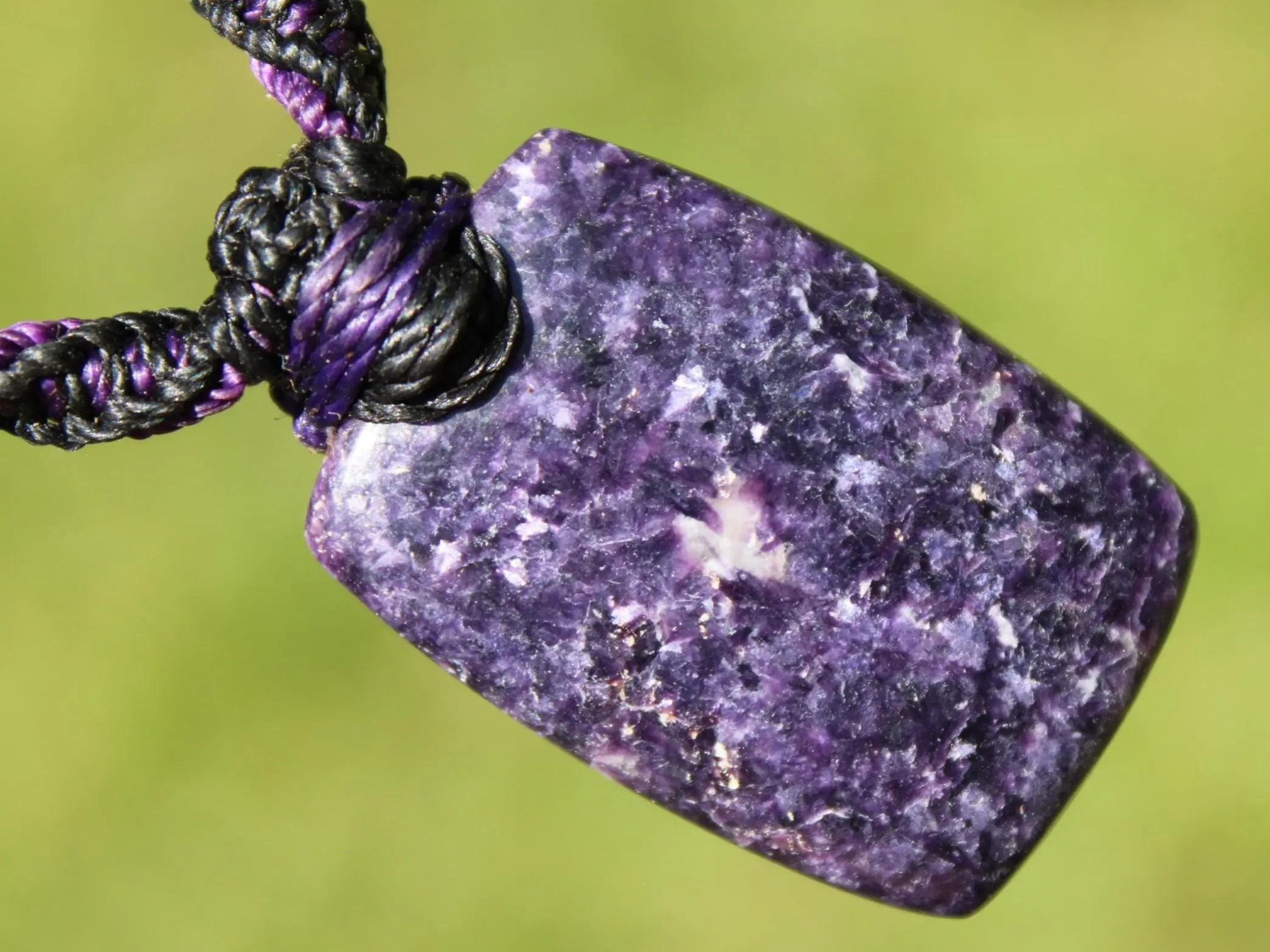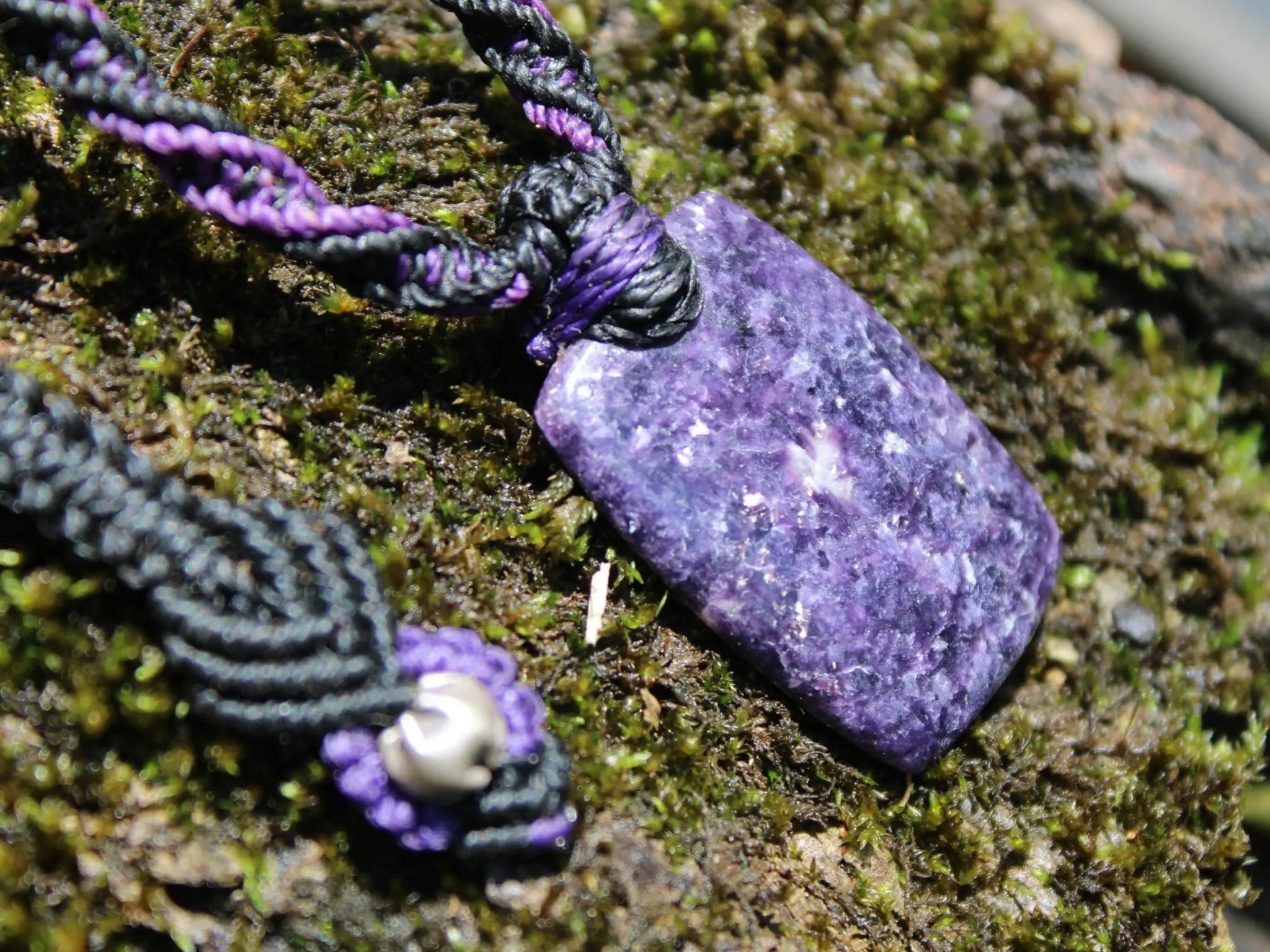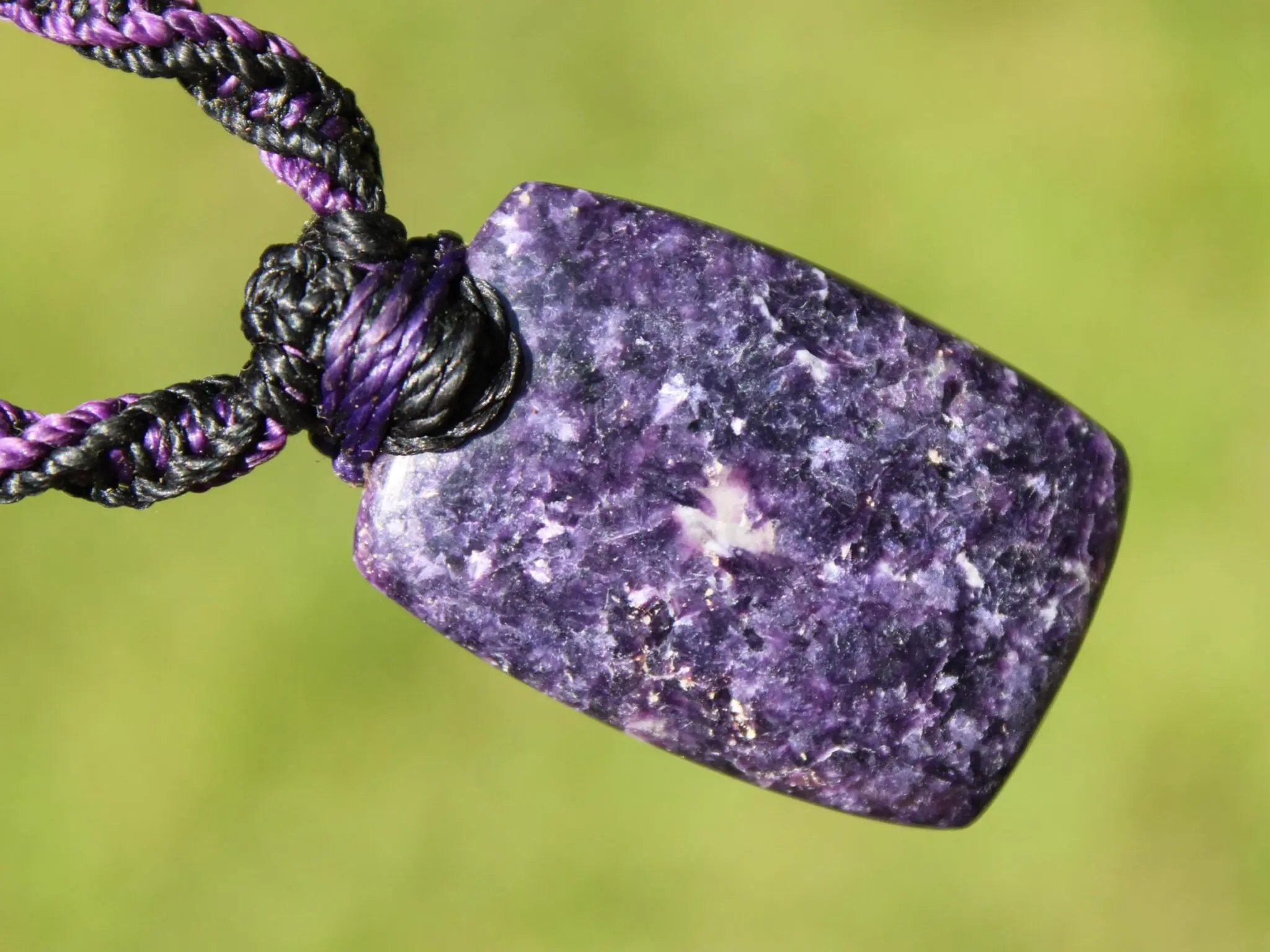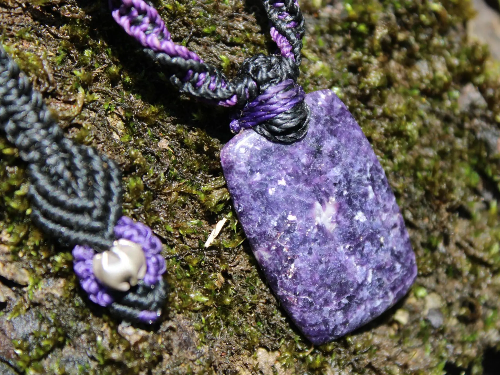 This playful lepidolite crystal pendant has been handpolished by us here at Platypus Dreaming in Far North Queensland, Australia, and handwoven using ancient knot technique. It is one of the only stones we could find that comes from Victoria, Australia. This necklace can also be adjusted to a child size! – please get in touch.