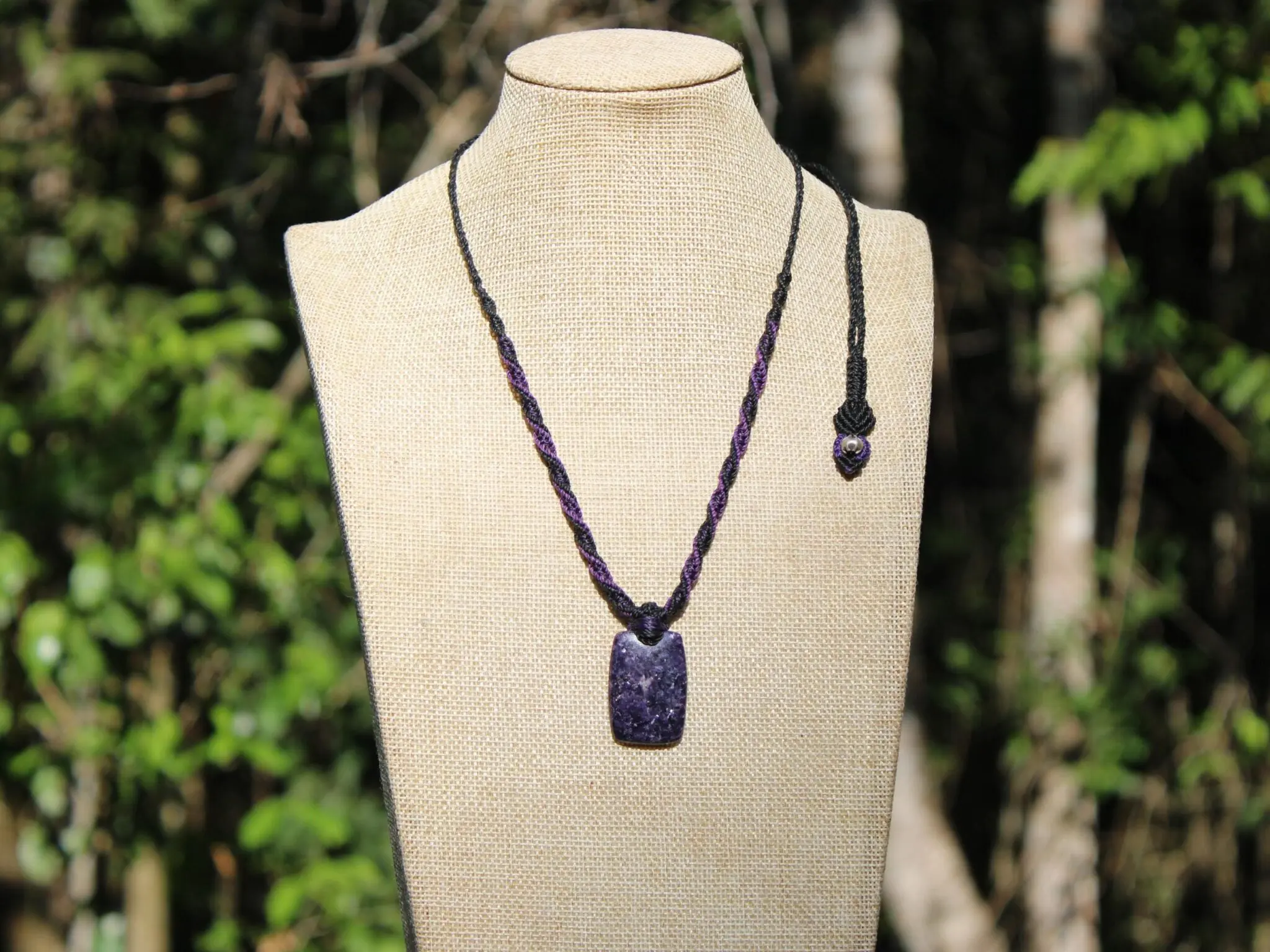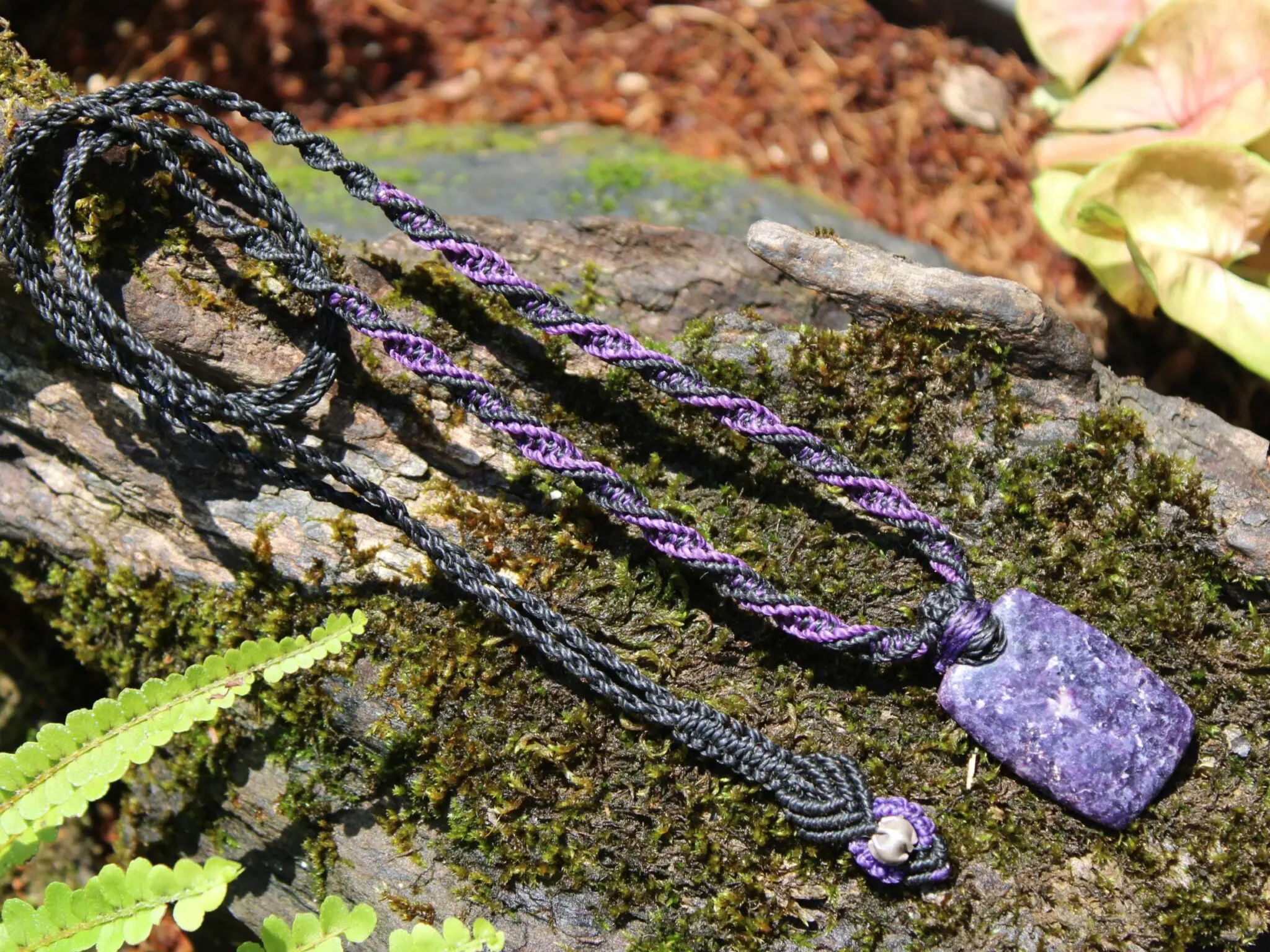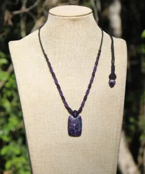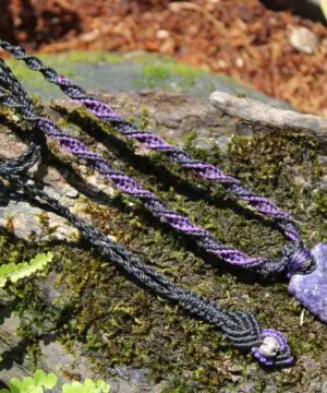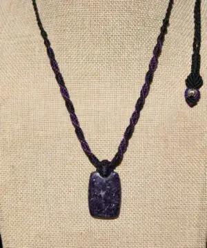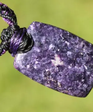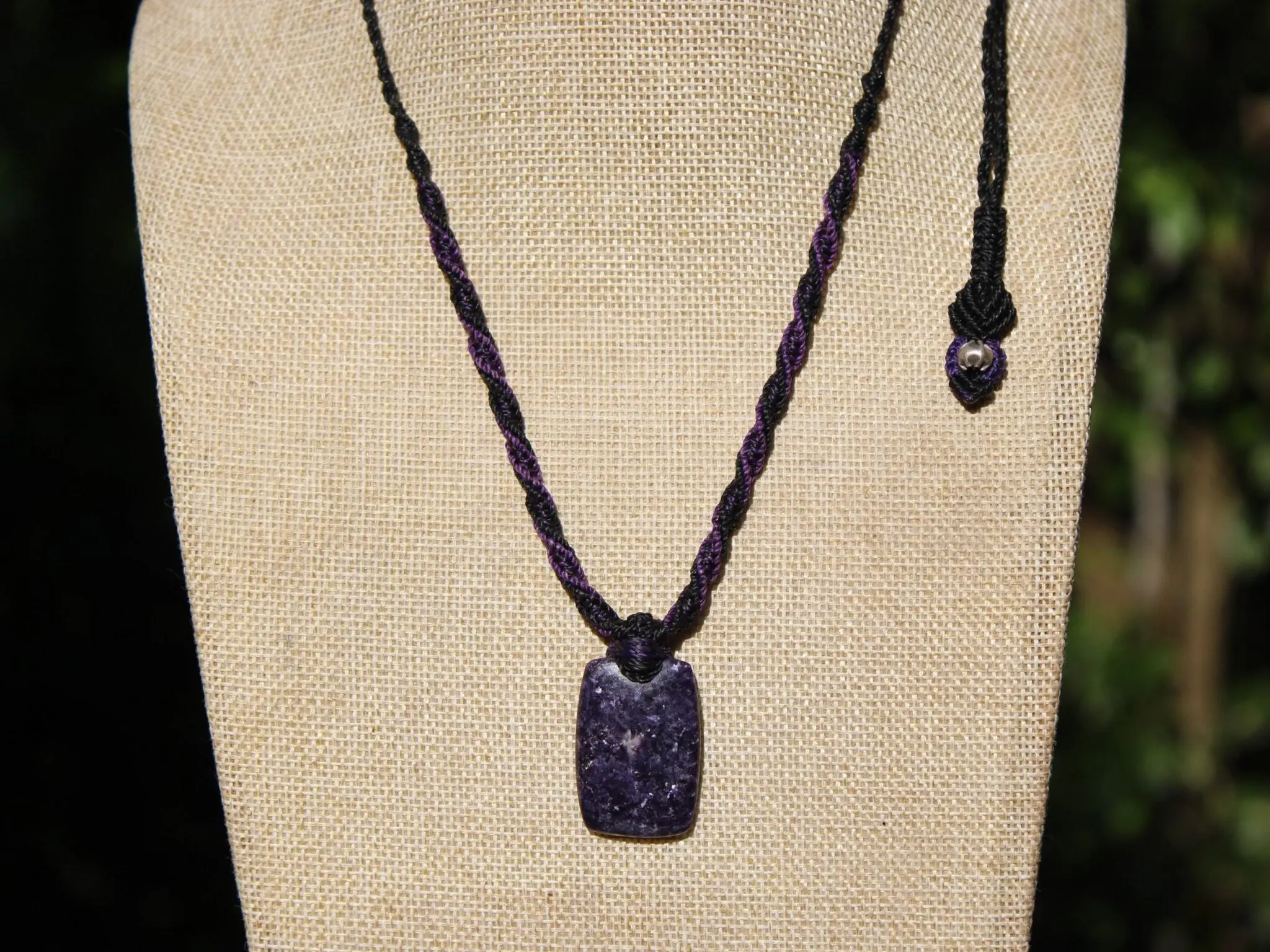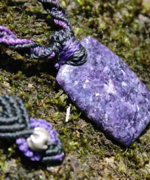This playful lepidolite crystal pendant has been handpolished by us here at Platypus Dreaming in Far North Queensland, Australia, and handwoven using ancient knot technique. It is one of the only stones we could find that comes from Victoria, Australia. This necklace can also be adjusted to a child size! – please get in touch.