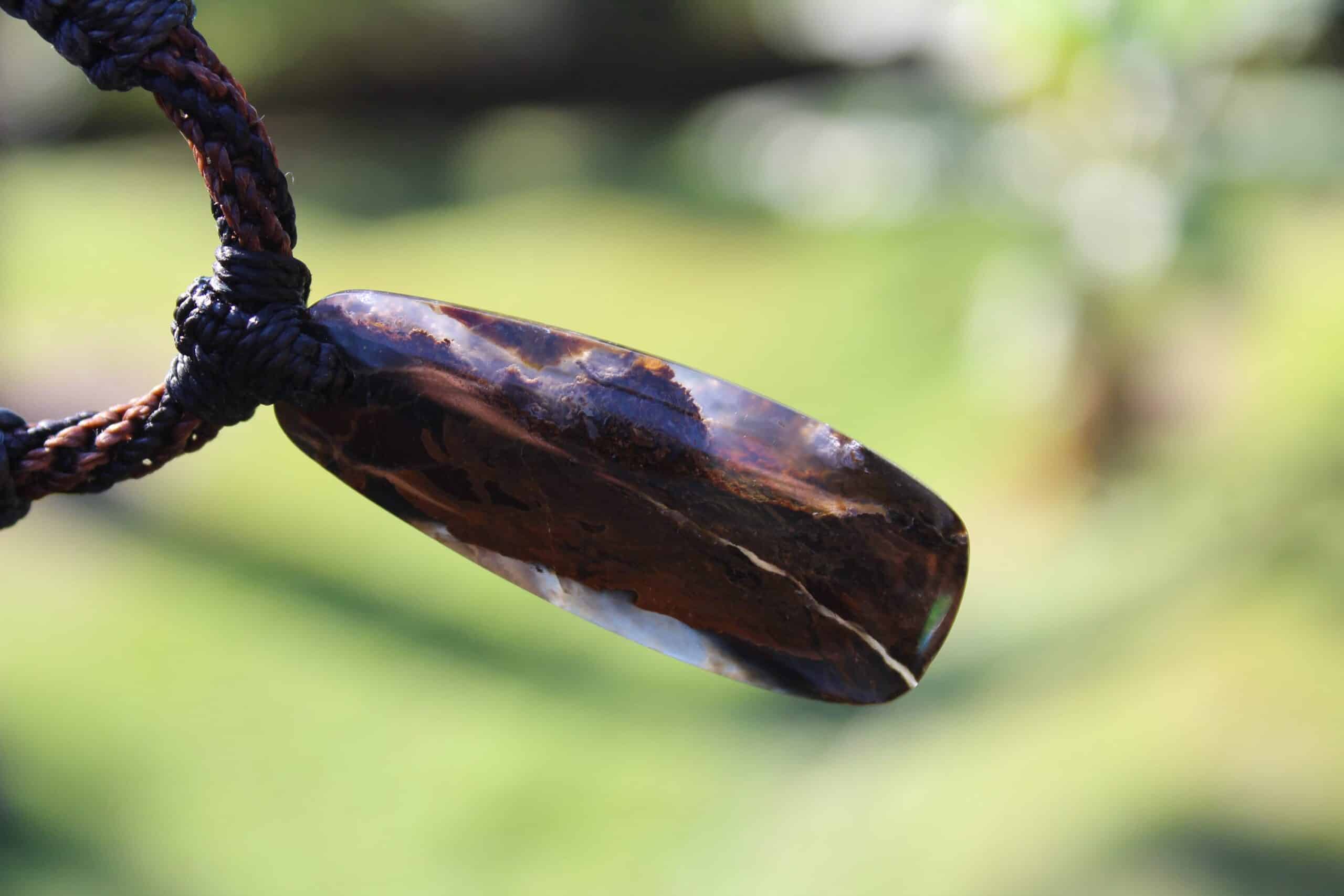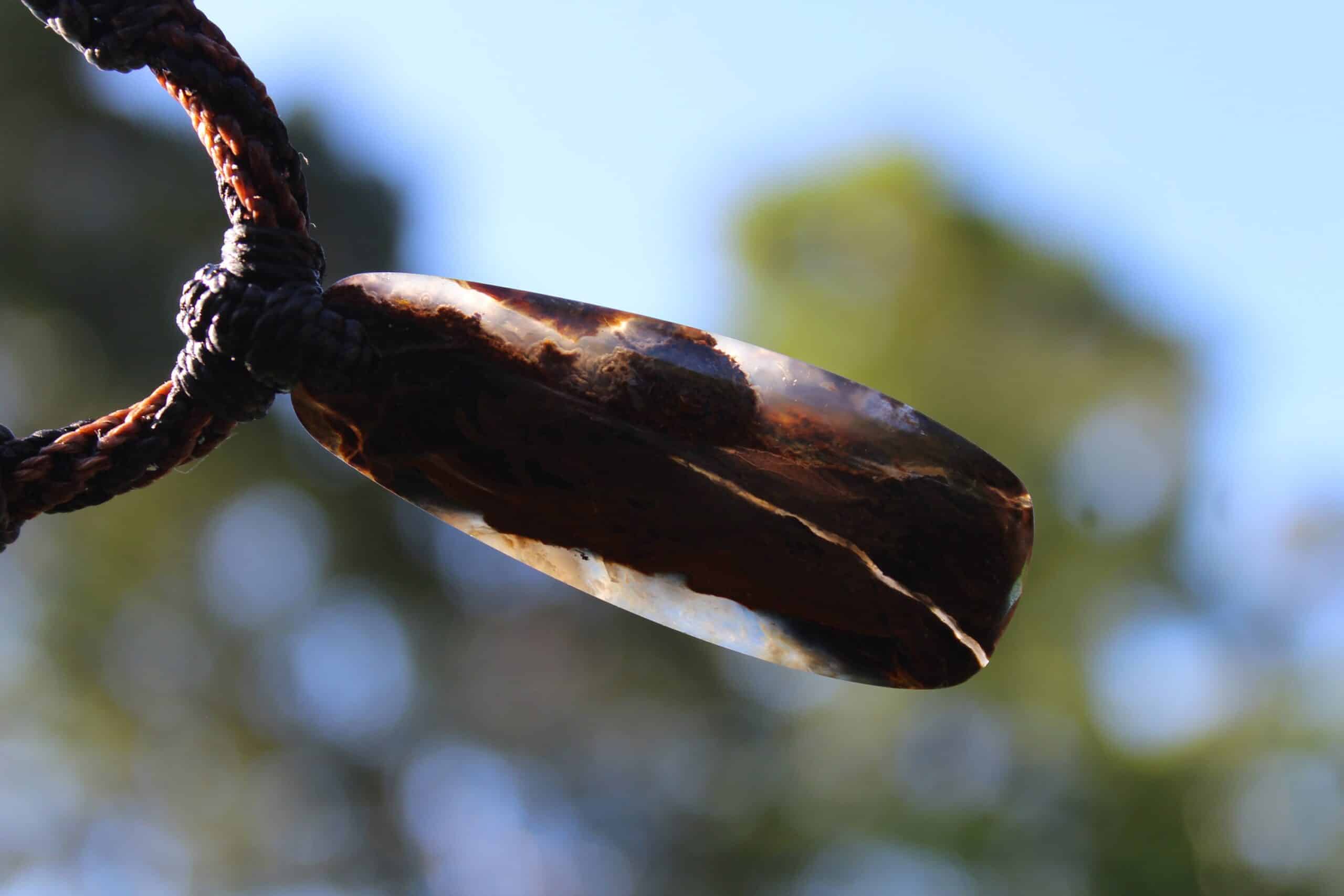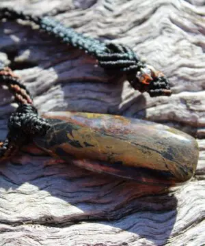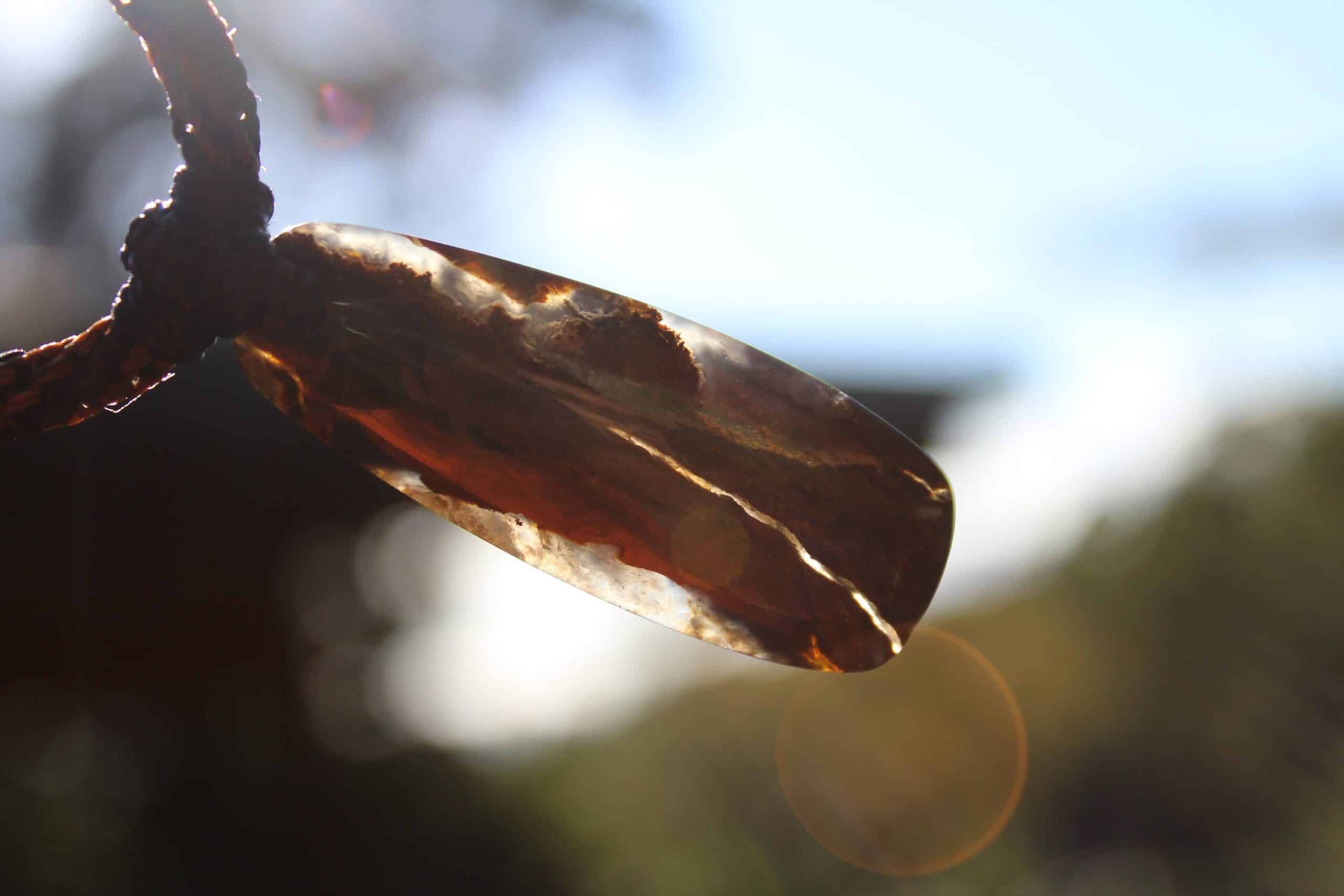 This is a super rare new found blue green opalised wood crystal talisman, handcrafted by us here at Platypus Dreaming in Far North Queensland, Australia. This incredible mineral was only discovered in 2018, near the slopes of three volcanoes in Indonesia’s West Java Province. What the miners actually found was an ancient petrified forest (how cool is that?), which had been pushed over by the deluge of “stuff” (pyroclastic flow) from a volcanic explosion. Then, over the ages, the wood was fossilized and preserved by opaline silica. The water in that silica was very rich in dissolved copper, iron, and manganese. Those copper and manganese deposits are now found inside this blue opal. This talisman also features a 1000 pure silver tribal bead that has been hand-cut and chiseled using traditional techniques.