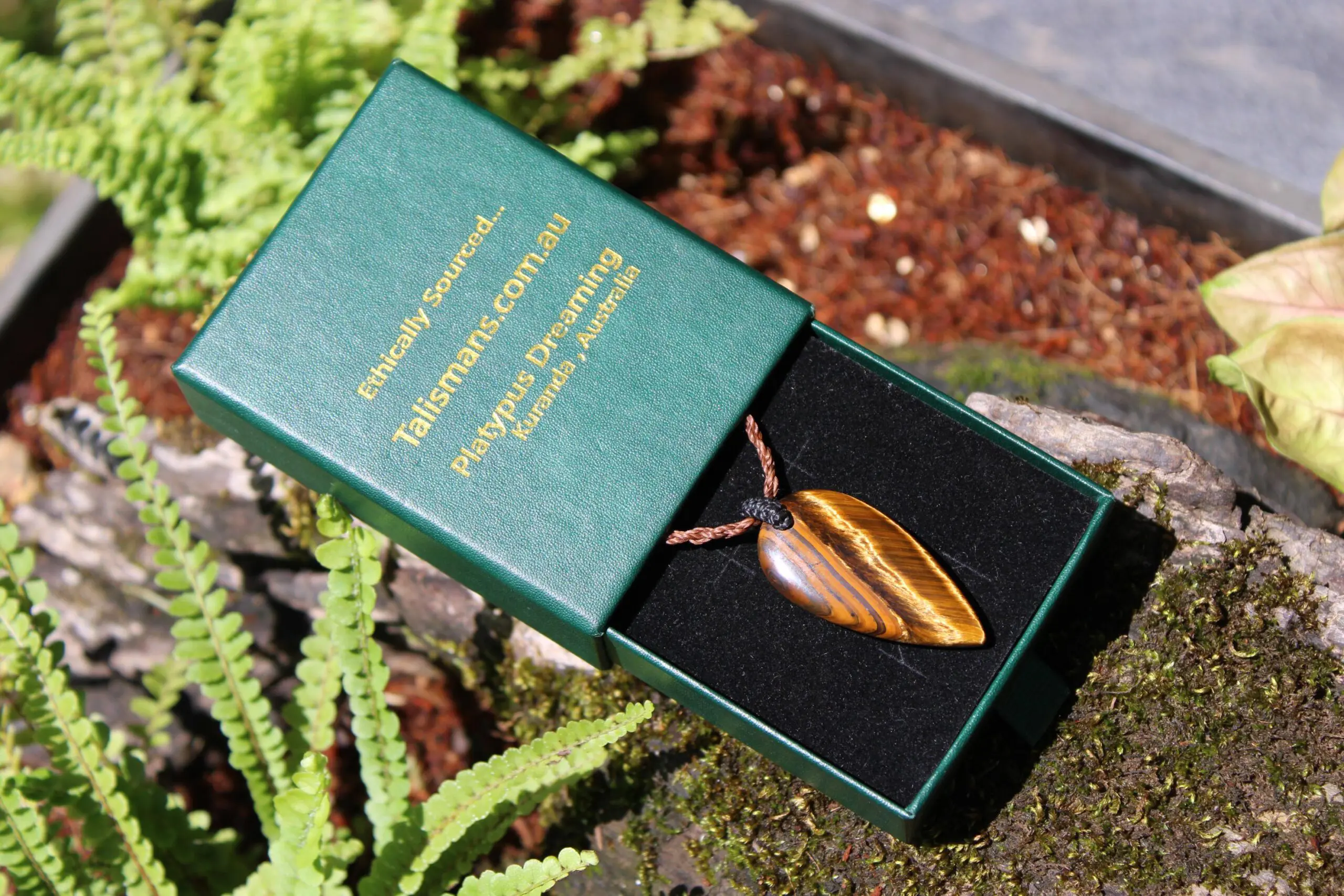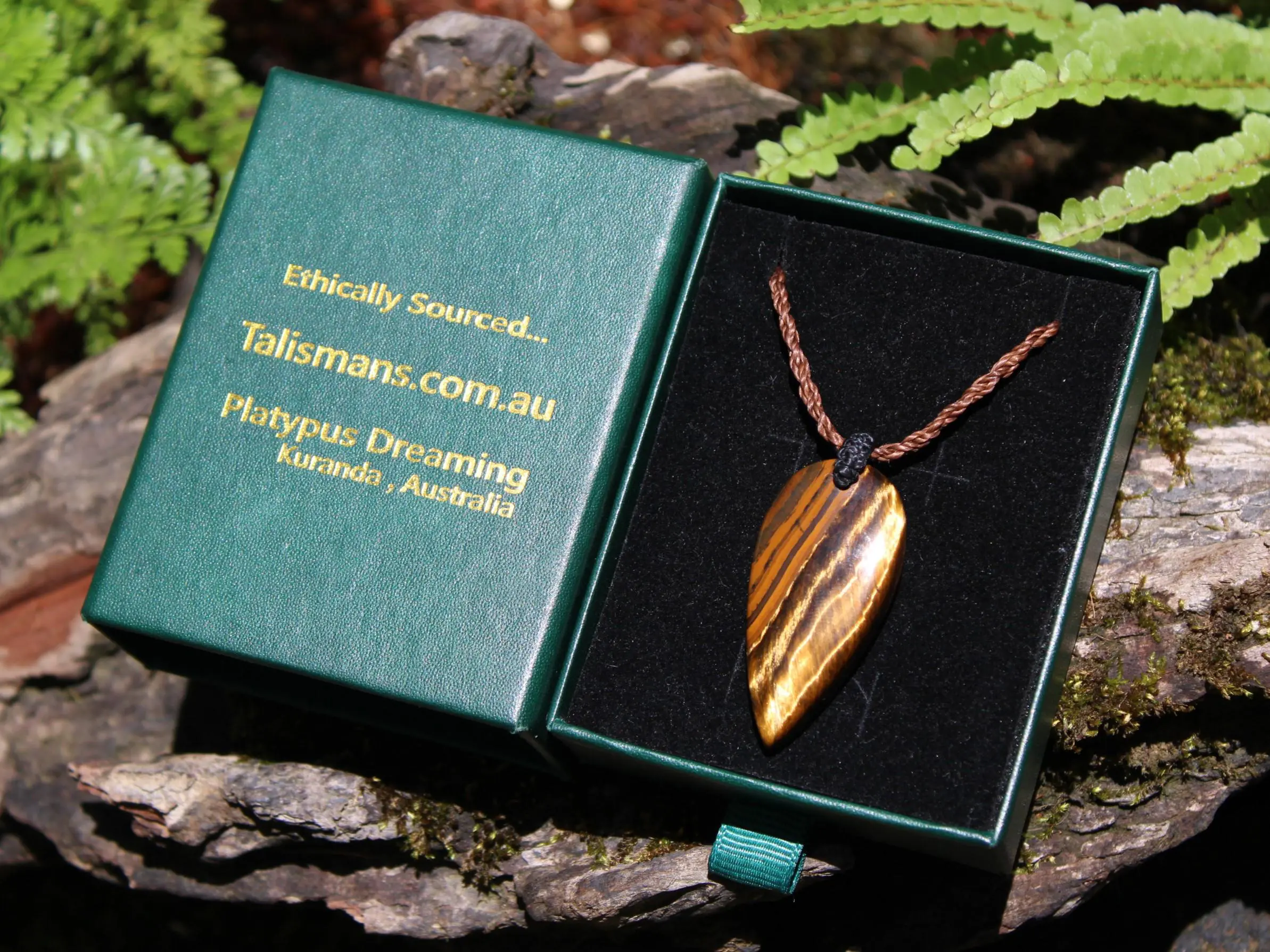 This powerful Tiger Eye crystal talisman has been hand polished and handcrafted by artisans here at Platypus Dreaming in the luscious rainforests of Far North Queensland, Australia. This Tiger Eye is some of the highest quality we have been able to source, and comes from the Pilbara region of Western Australia, in one of the most isolated places on Earth. This jewel boulder tends to occur in raw pieces that show the most magnificent geometric patterns.