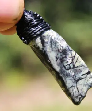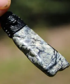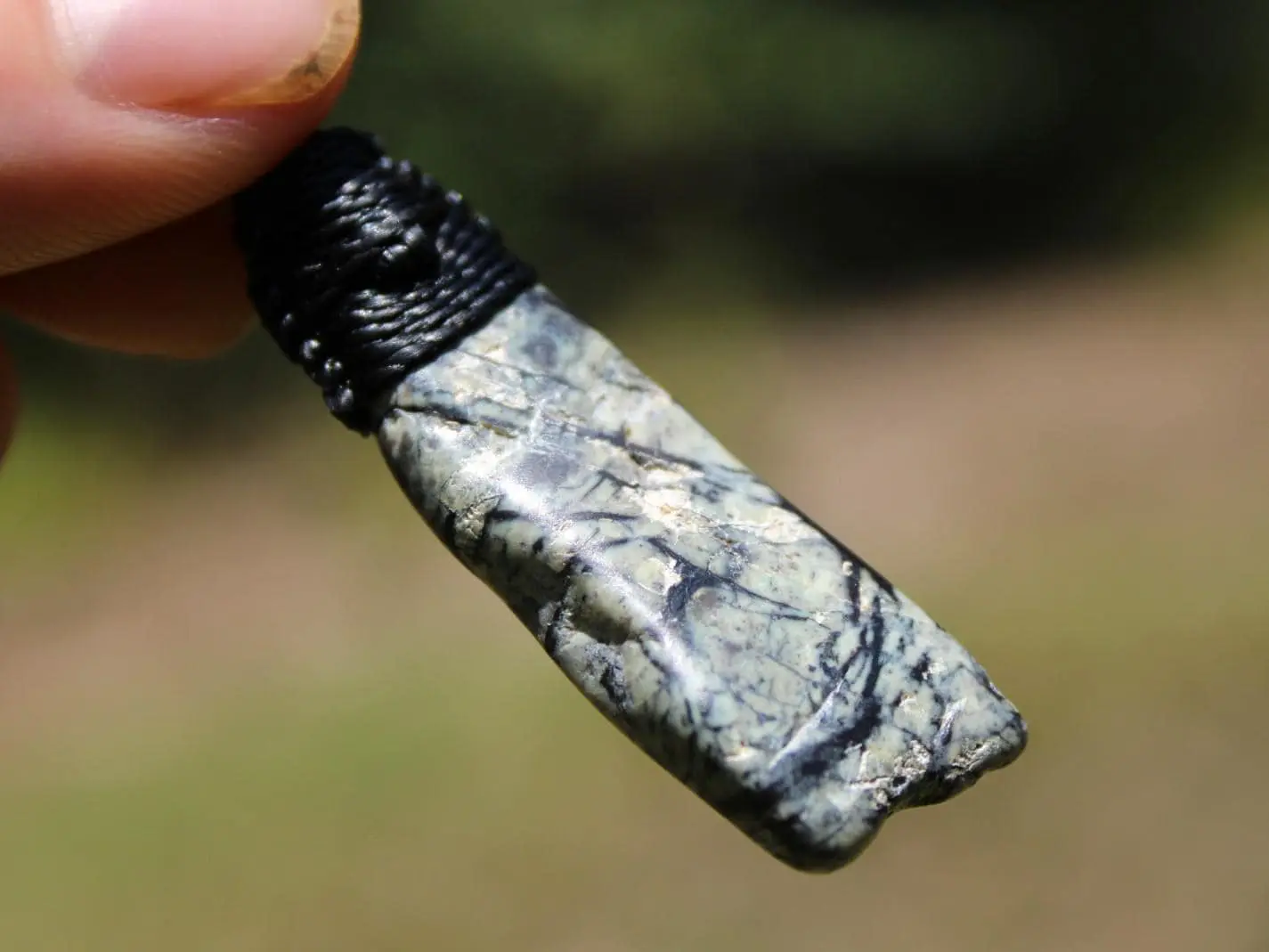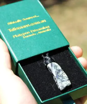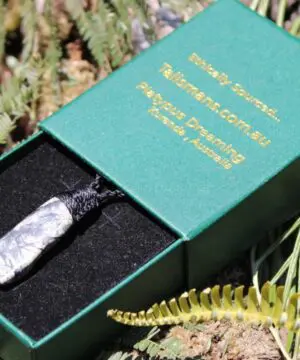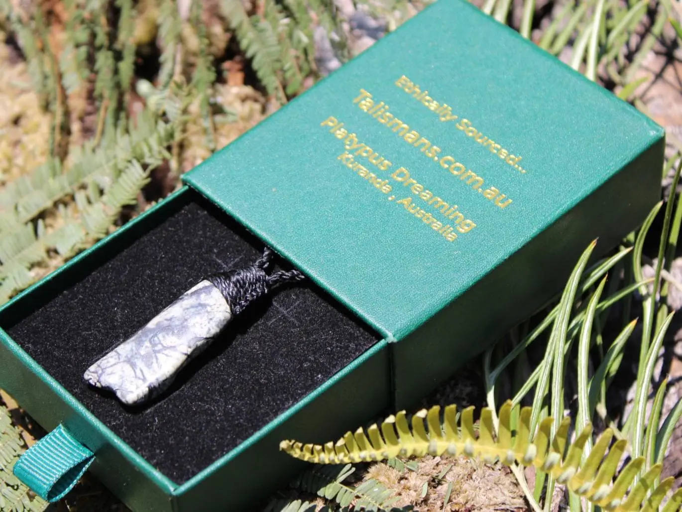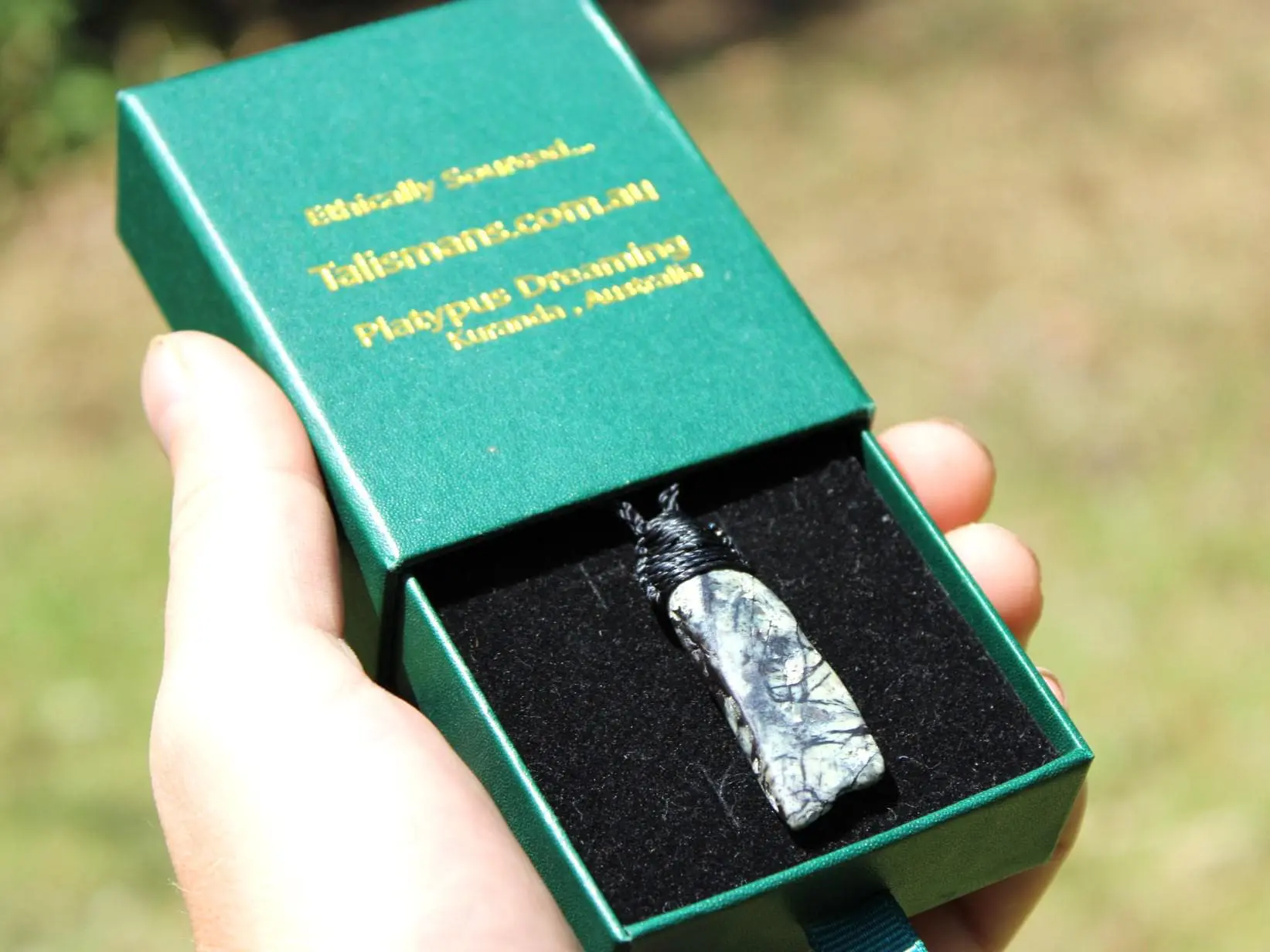 This enchanting rhyolite rainforest jasper crystal talisman has been handcrafted by us here at Platypus Dreaming, in Far North Queensland, Australia. The rhyolite is some of the highest quality on Earth. It originates from the Mt. Hay volcano area in Queensland, Australia, where minerals and and siliceous material have replaced ancient lava pockets. It was first mined commercially in the late 1960s and continues to be a popular gemstone with cutters and collectors around the world. The Rhyolites of the Mt Hay volcanic, which are dated at around 120 millions years old, occur in varying shades of green, brown, red and cream. This talisman features a 1000 pure silver tribal bead that has been hand-cut and chiseled using traditional techniques.