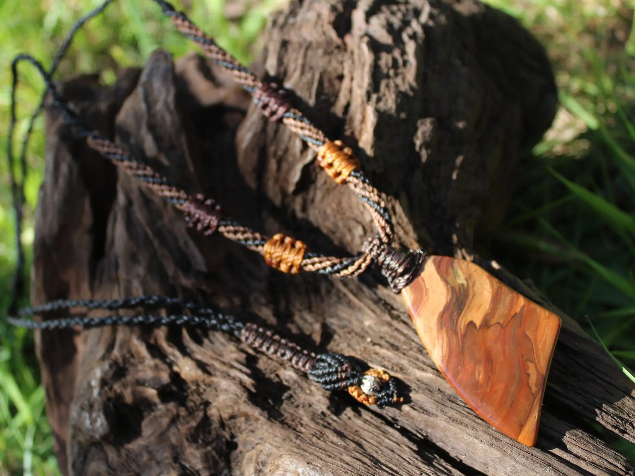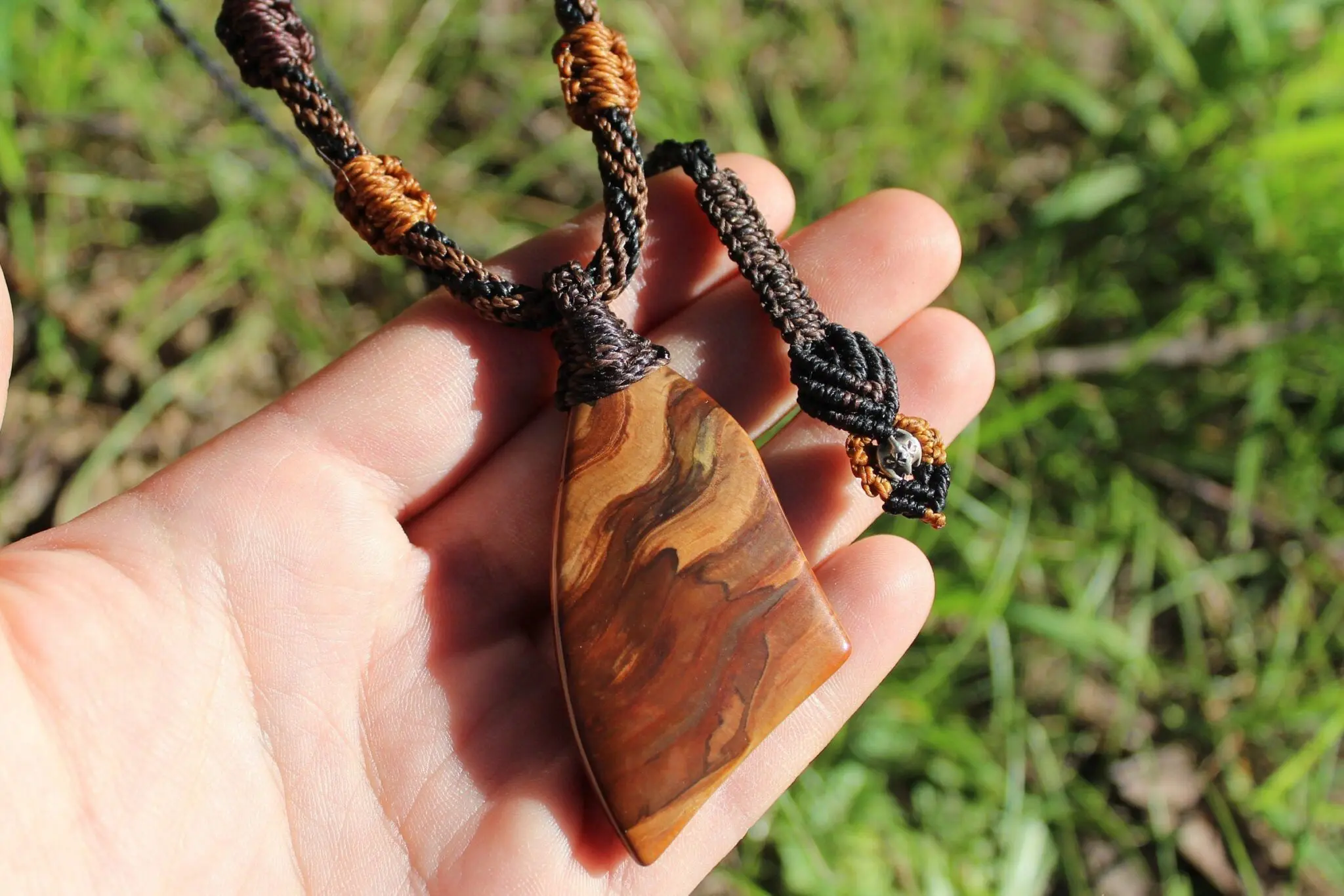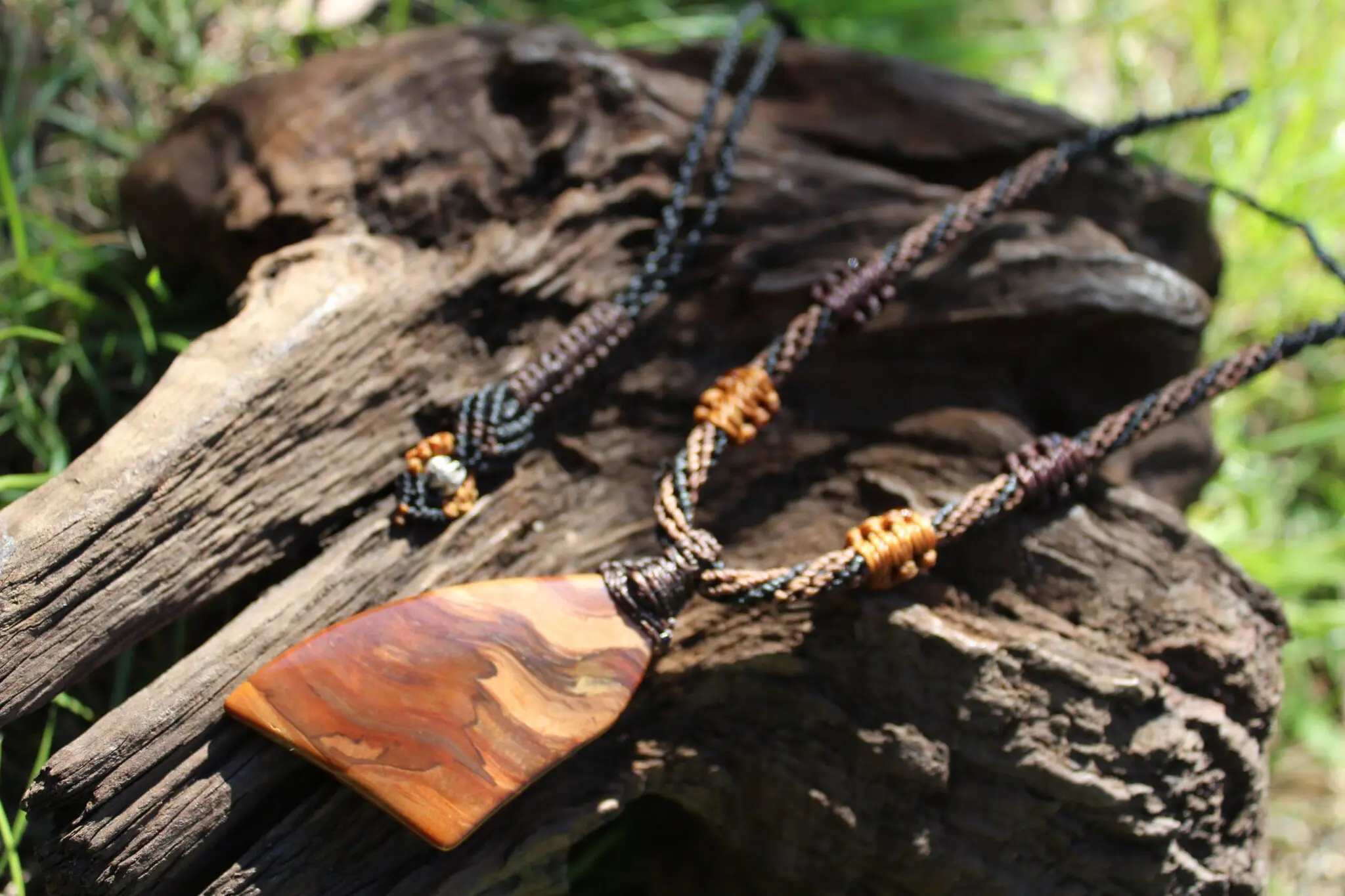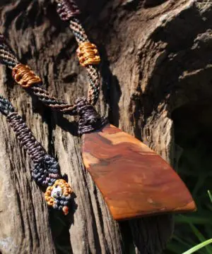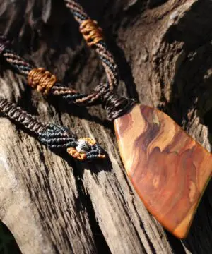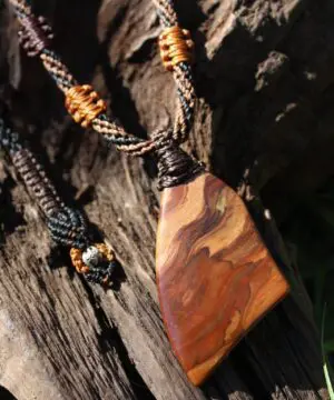 This earthy ribbon stone jasper crystal talisman has been handcrafted by us here at Platypus Dreaming in the luscious rainforests of Far North Queensland, Australia. This incredible stone is completely natural and has not been altered in any way – those incredible patterns emerge at the lapidary wheel from the raw earth. Ribbon Stone Jasper is found in the Kimberly region of Western Australia – one of the most isolated and wild regions on Earth. This stone was sourced directly from the person who hand dug the stone out of the earth themselves. This talisman features a 1000 pure silver tribal bead that has been hand-cut and chiseled using traditional techniques.