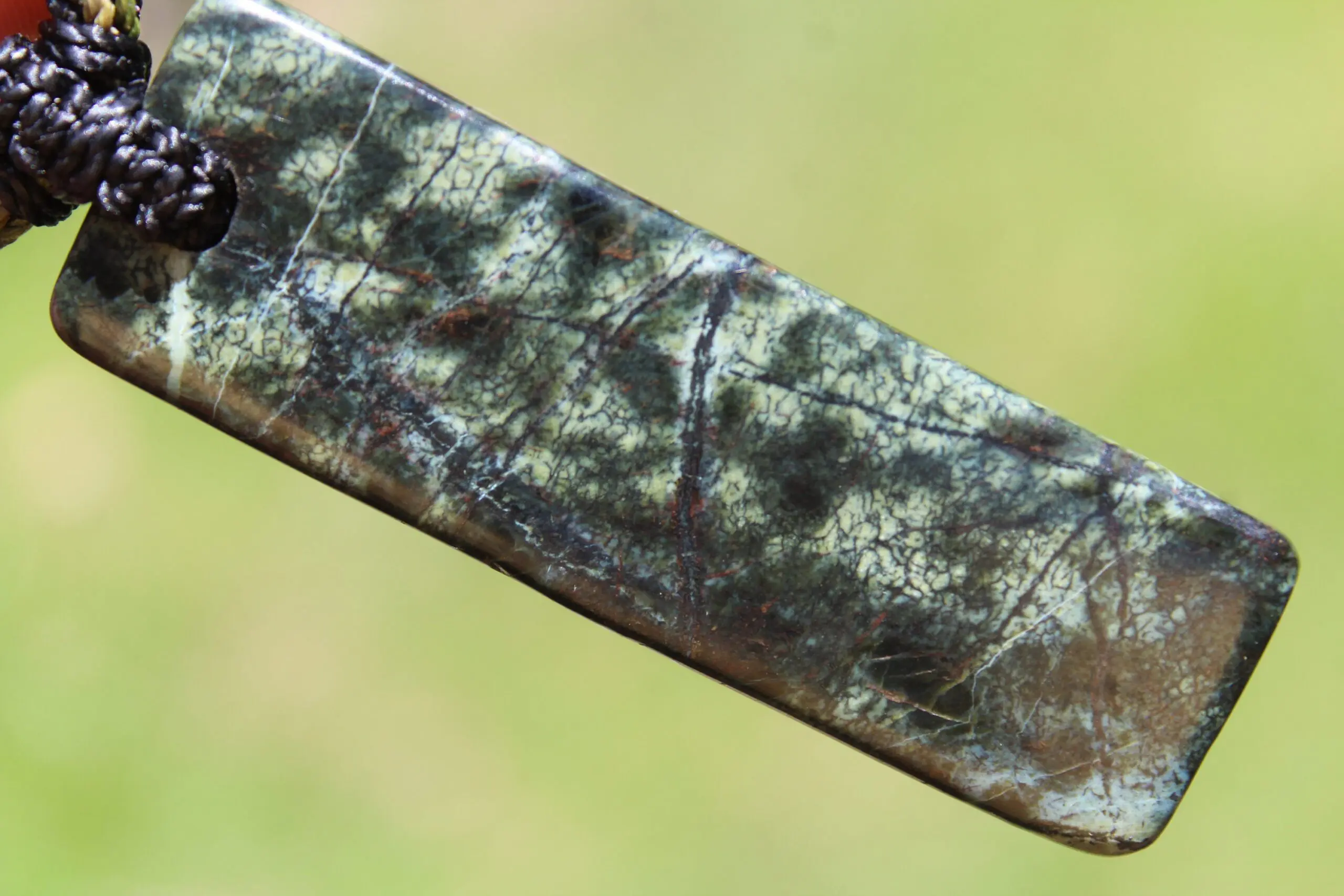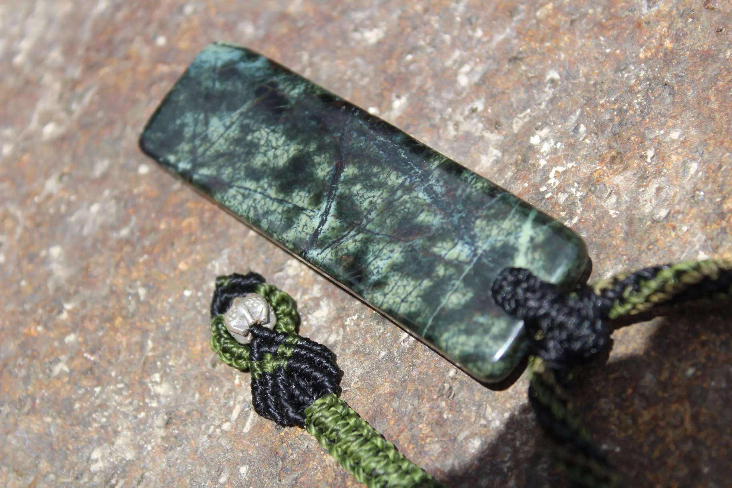 This enchanting royal rhyolite rainforest jasper crystal talisman has been handcrafted by us here at Platypus Dreaming, in Far North Queensland, Australia. The rhyolite is some of the highest quality on Earth. It originates from the Mt. Hay volcano area in Queensland, Australia, where minerals and and siliceous material have replaced ancient lava pockets. It was first mined commercially in the late 1960s and continues to be a popular gemstone with cutters and collectors around the world. The Rhyolites of the Mt Hay volcanic, which are dated at around 120 millions years old, occur in varying shades of green, brown, red and cream. This talisman features a 1000 pure silver tribal bead that has been hand-cut and chiseled using traditional techniques.