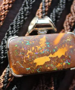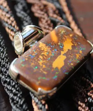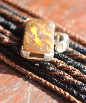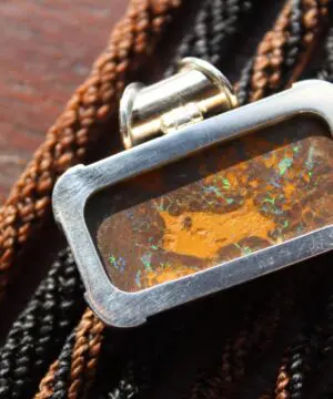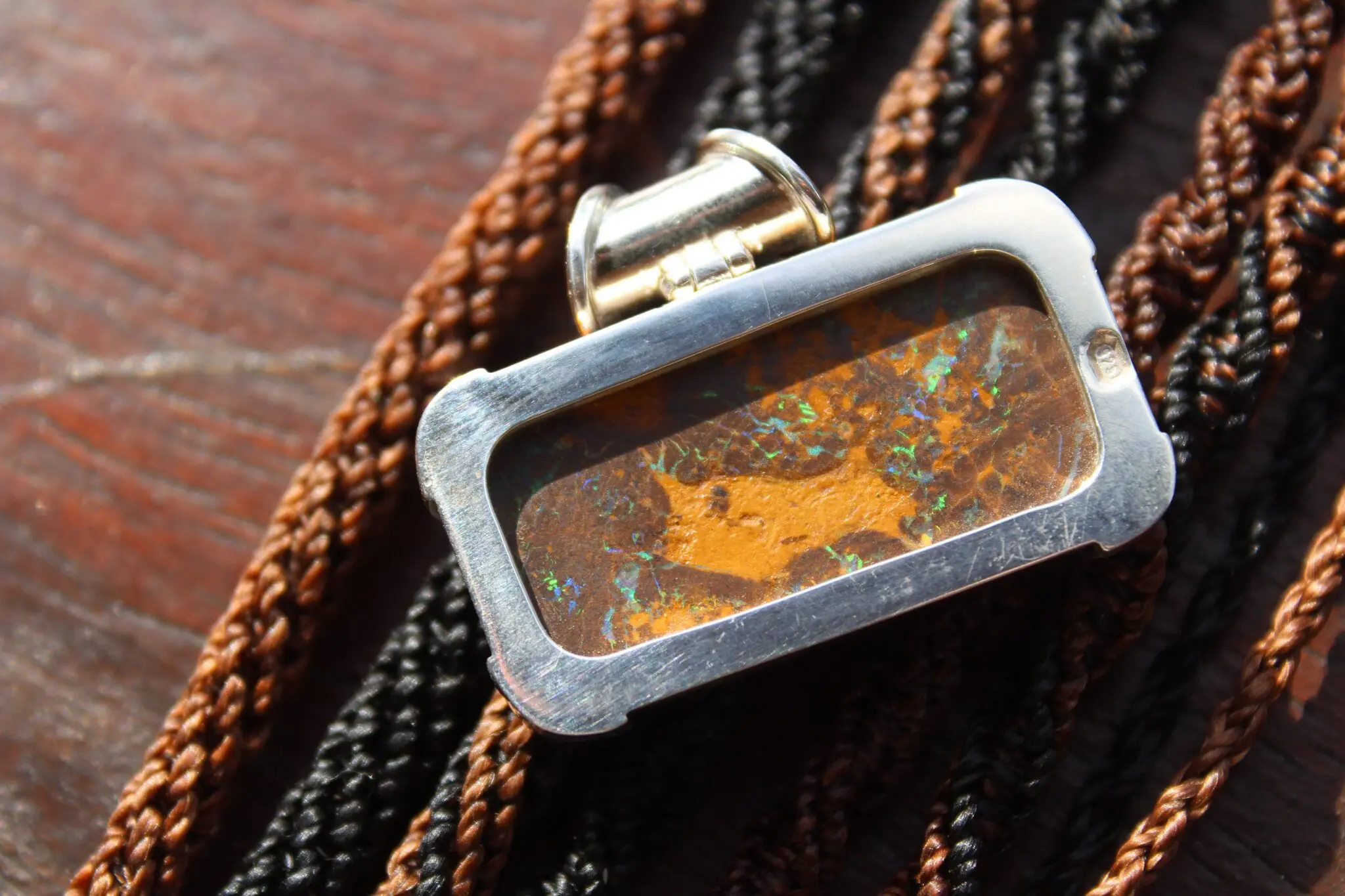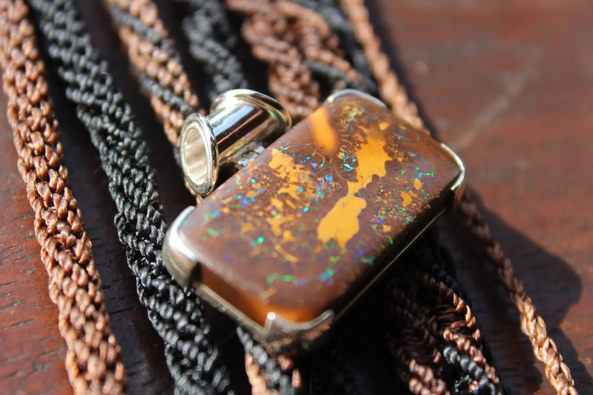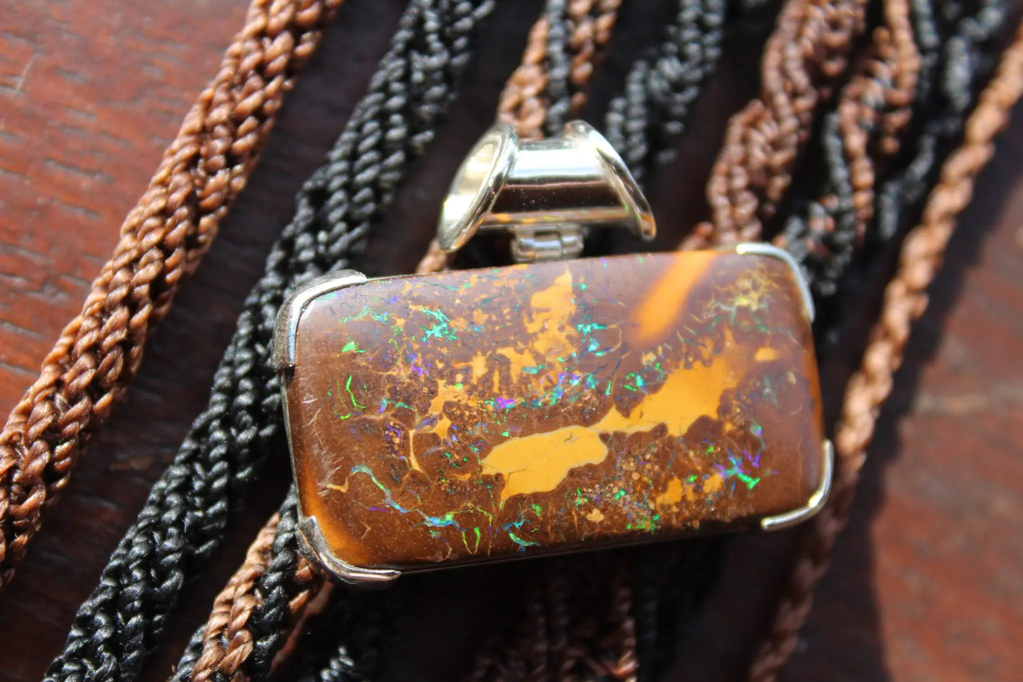 SOLID AUSTRALIAN POLISHED BOULDER OPAL WITH 925 FINE SILVER AND MACRAME ENDING. UNISEX. ONE OF A KIND NECKLACE…FREE STANDARD SHIPPING..