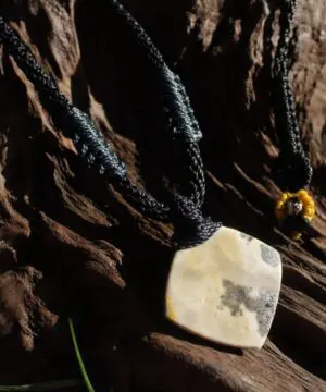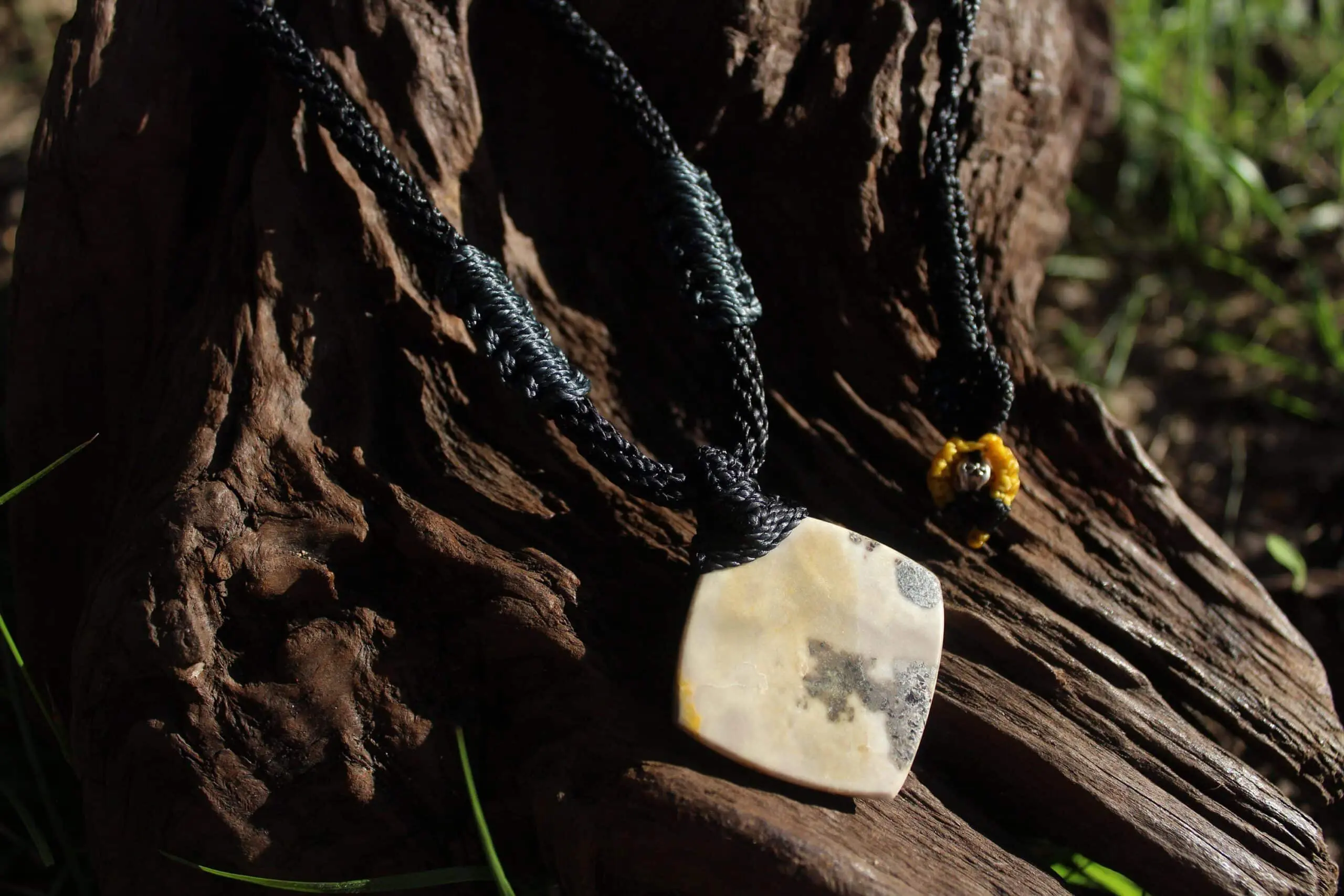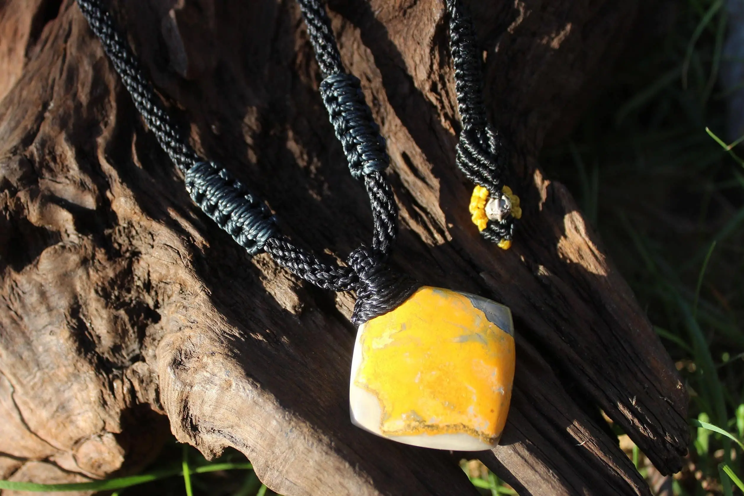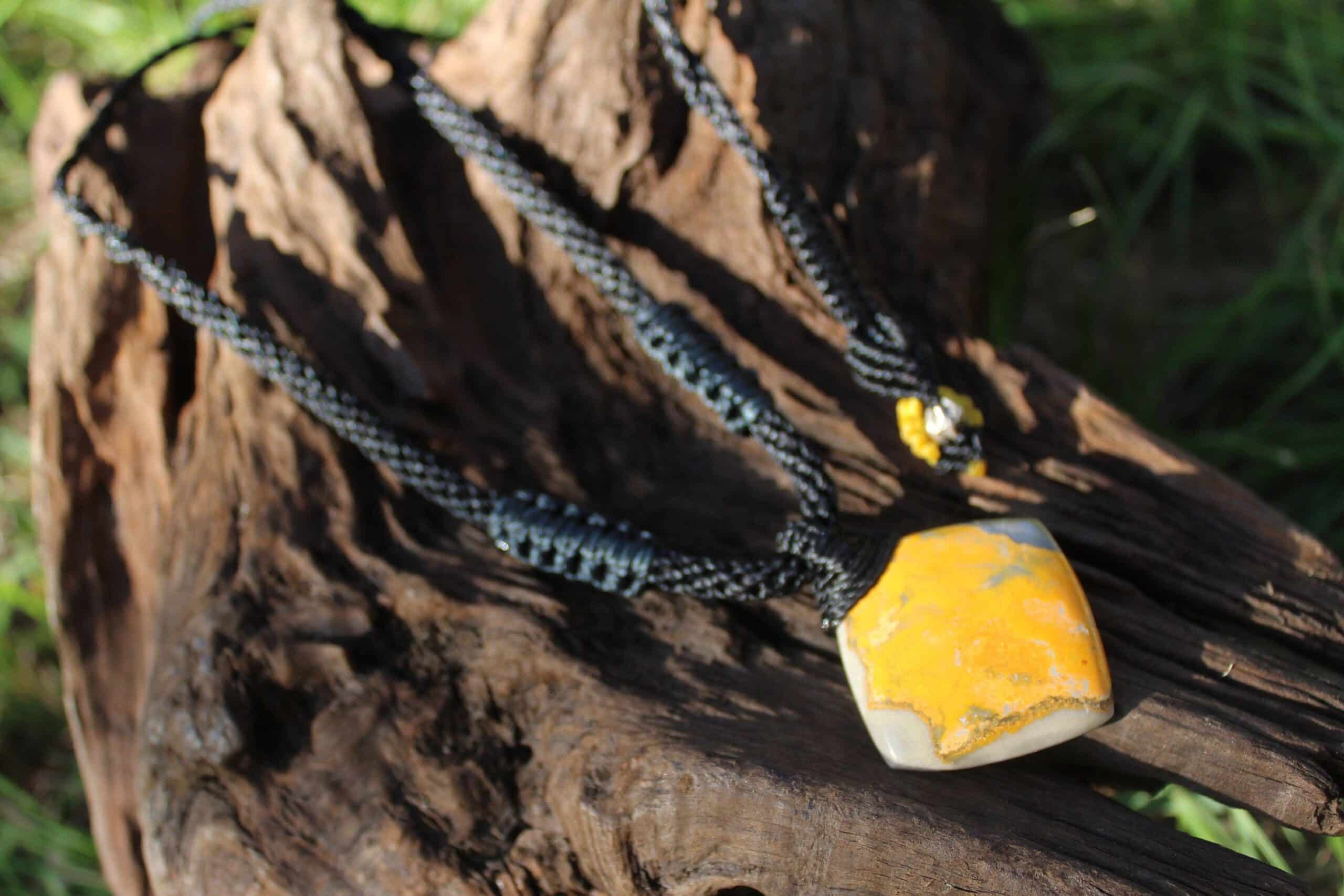 This is a AAA+ quality Bumble Bee Jasper crystal talisman with stunning deep colours of yellow, brown and white. The meaning of its name relates to the fact that the colors and swirls resemble the colors on bumble bees. It has been handcrafted by us here at Platypus Dreaming, in Far North Queensland, Australia.. Jasper is a strong earth energy stone, that embodies within it the strong energy of the volcano from which it was birthed. This talisman also features a 1000 pure silver tribal bead that has been hand-cut and chiseled using traditional techniques.