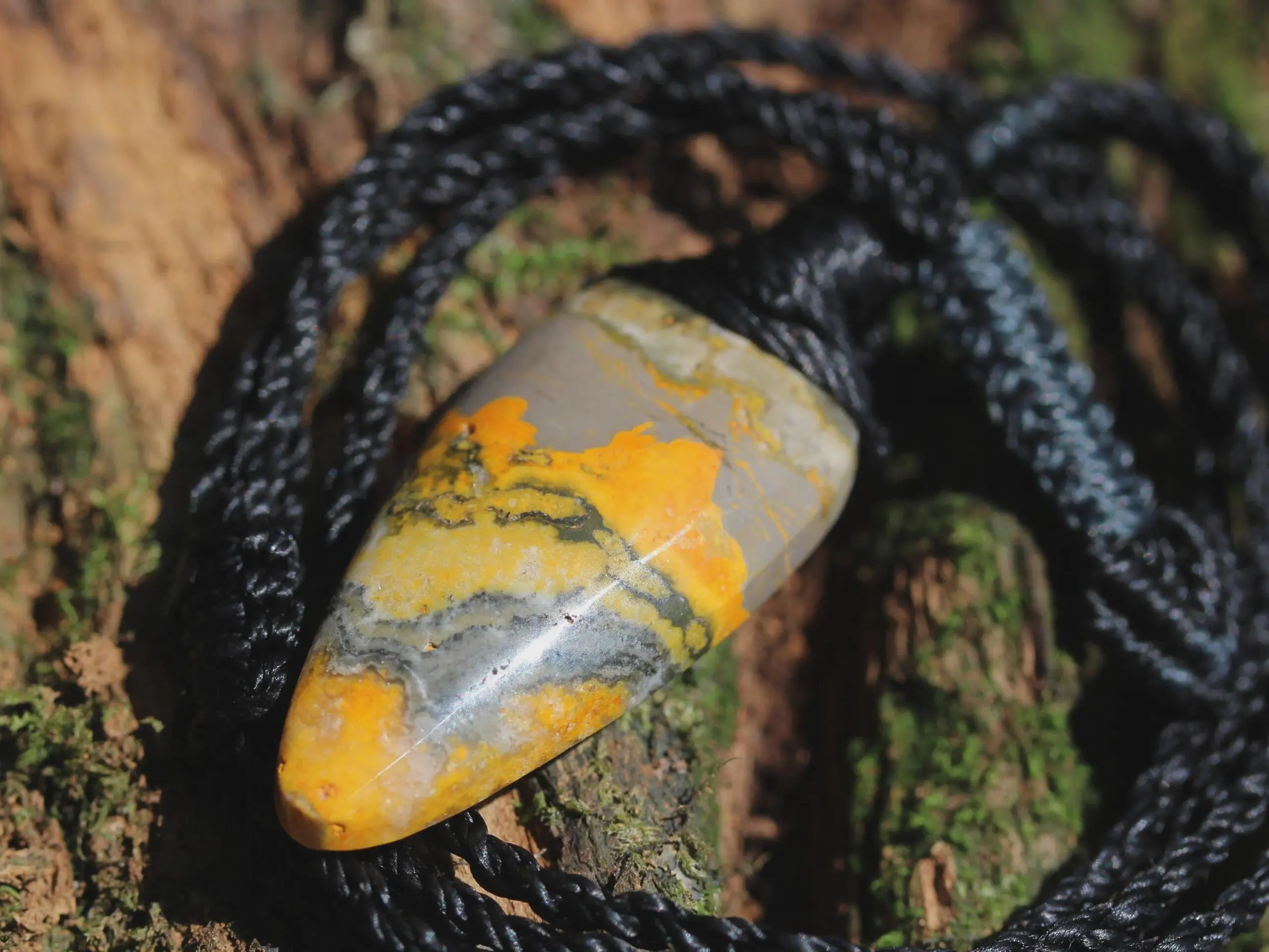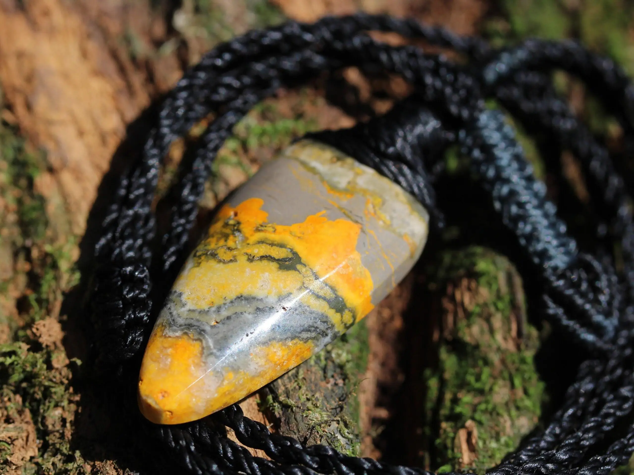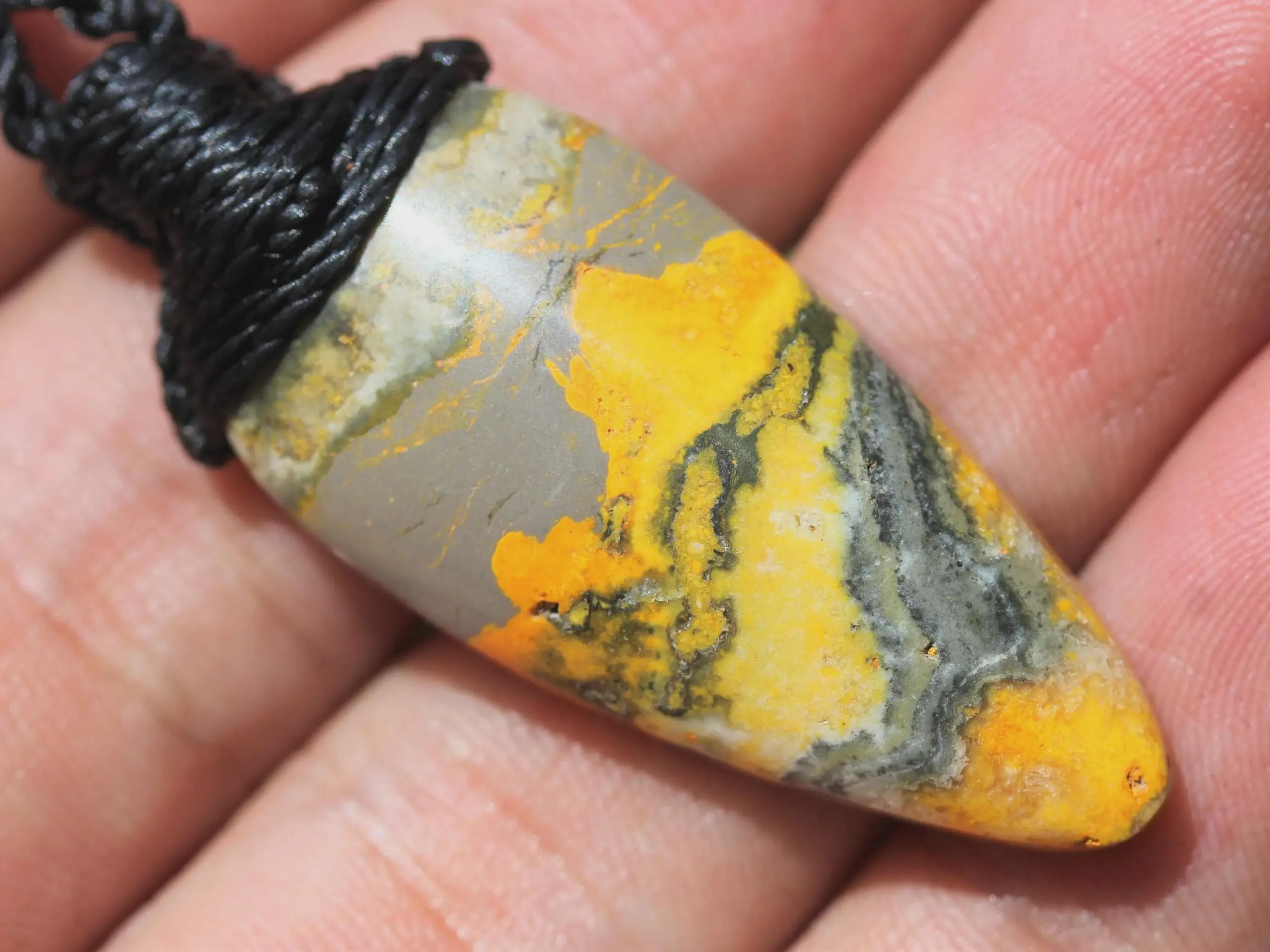 This is a AAA+ quality Bumble Bee Jasper crystal talisman with stunning deep colours of yellow, brown and white. The meaning of its name relates to the fact that the colors and swirls resemble the colors on bumble bees. It has been handcrafted by us here at Platypus Dreaming, in Far North Queensland, Australia. This stone is said to be a mixture of a number of minerals,ash from the volcano. These stones come from the island of West Java in Indonesia, and were hand dug in 2017. Jasper is a strong earth energy stone, that embodies within it the strong energy of the volcano from which it was birthed.