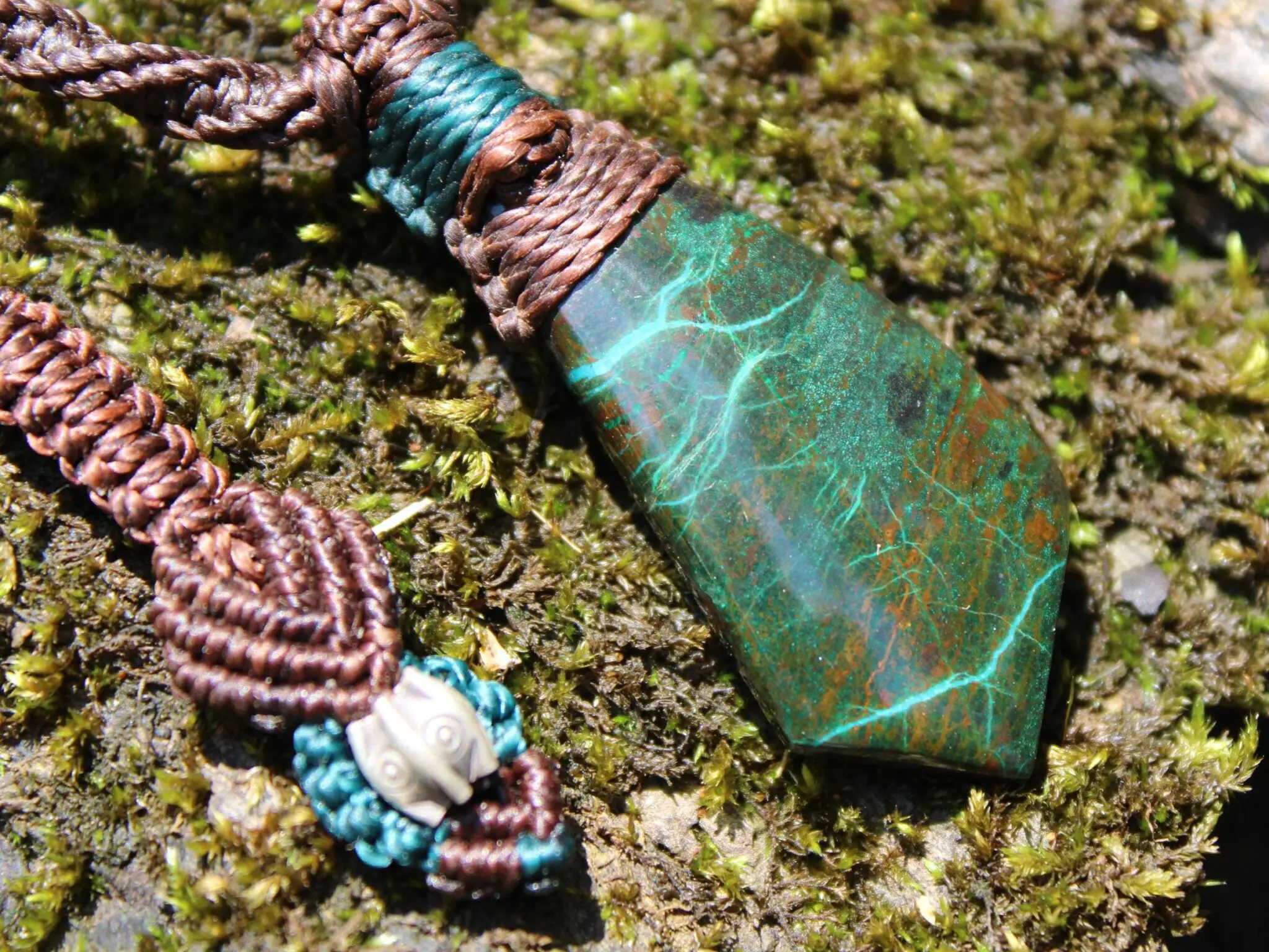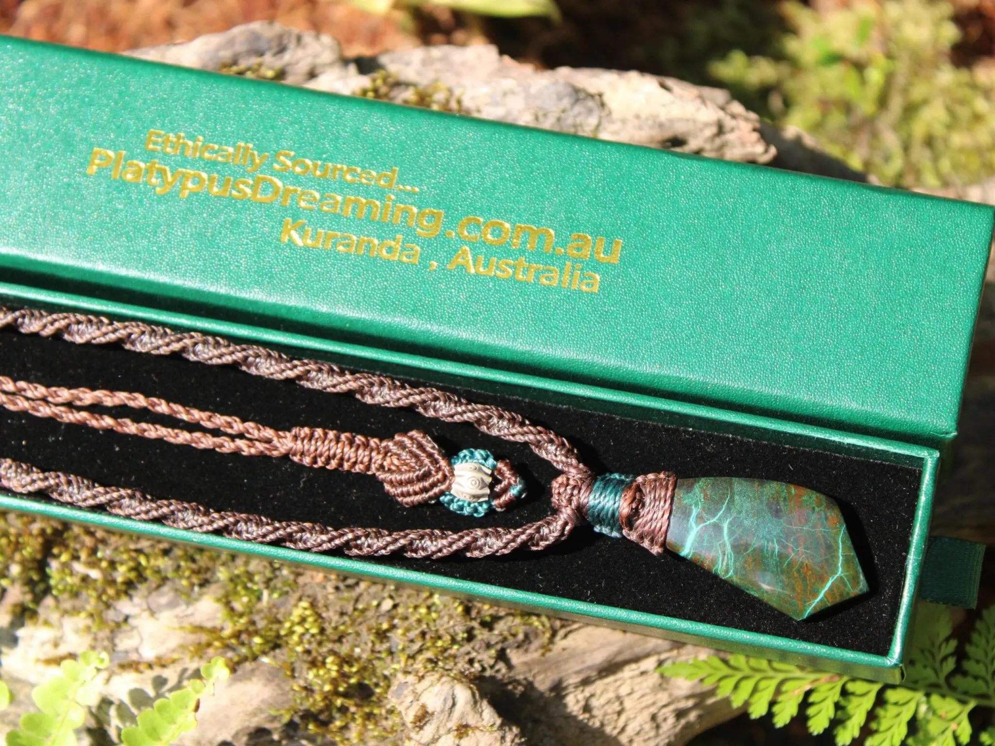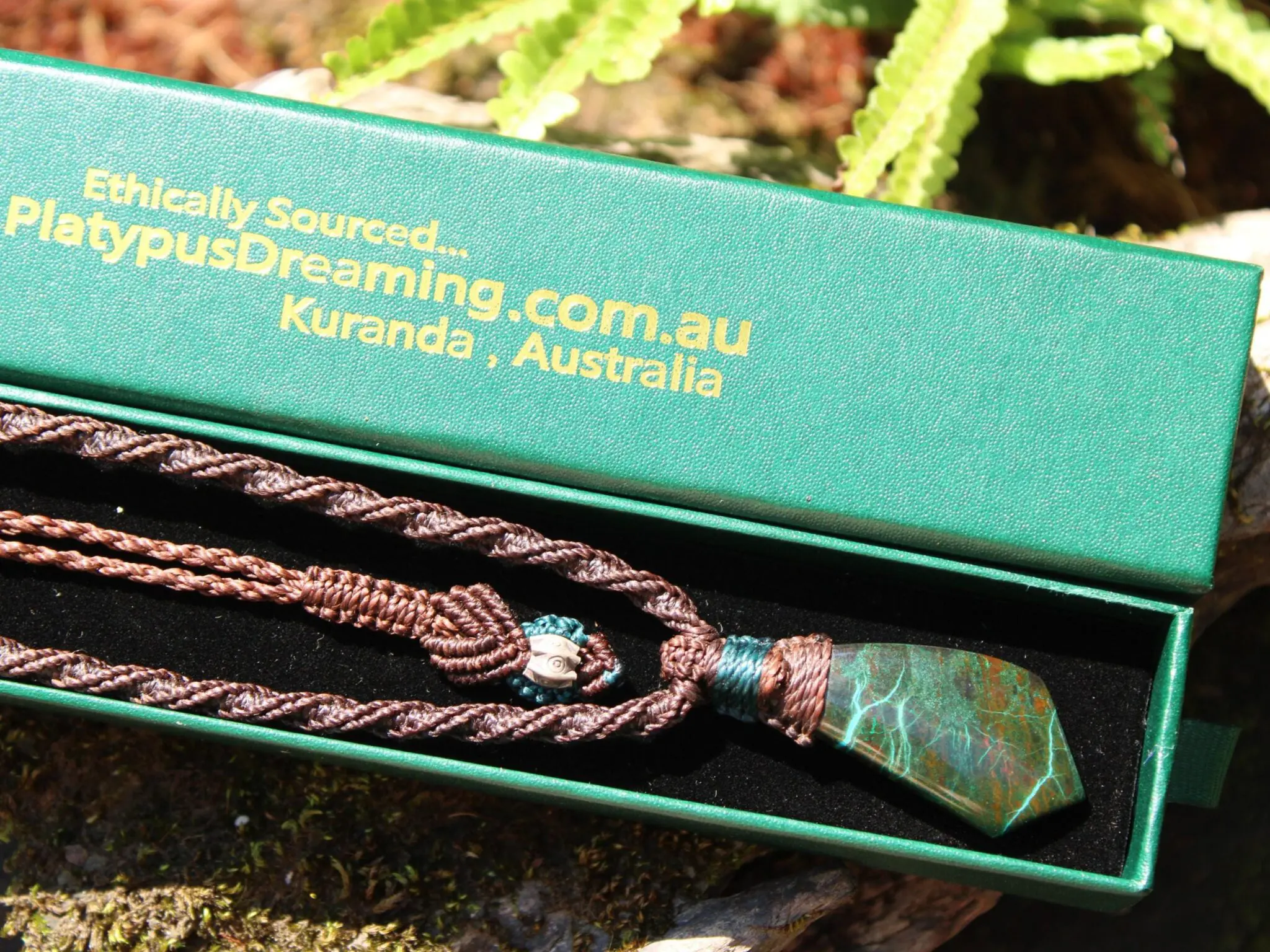 This is a powerful and rare Australian Chrysocolla crystal talisman, handcrafted by us here at Platypus Dreaming in the lush rainforests of Far North Queensland, Australia.