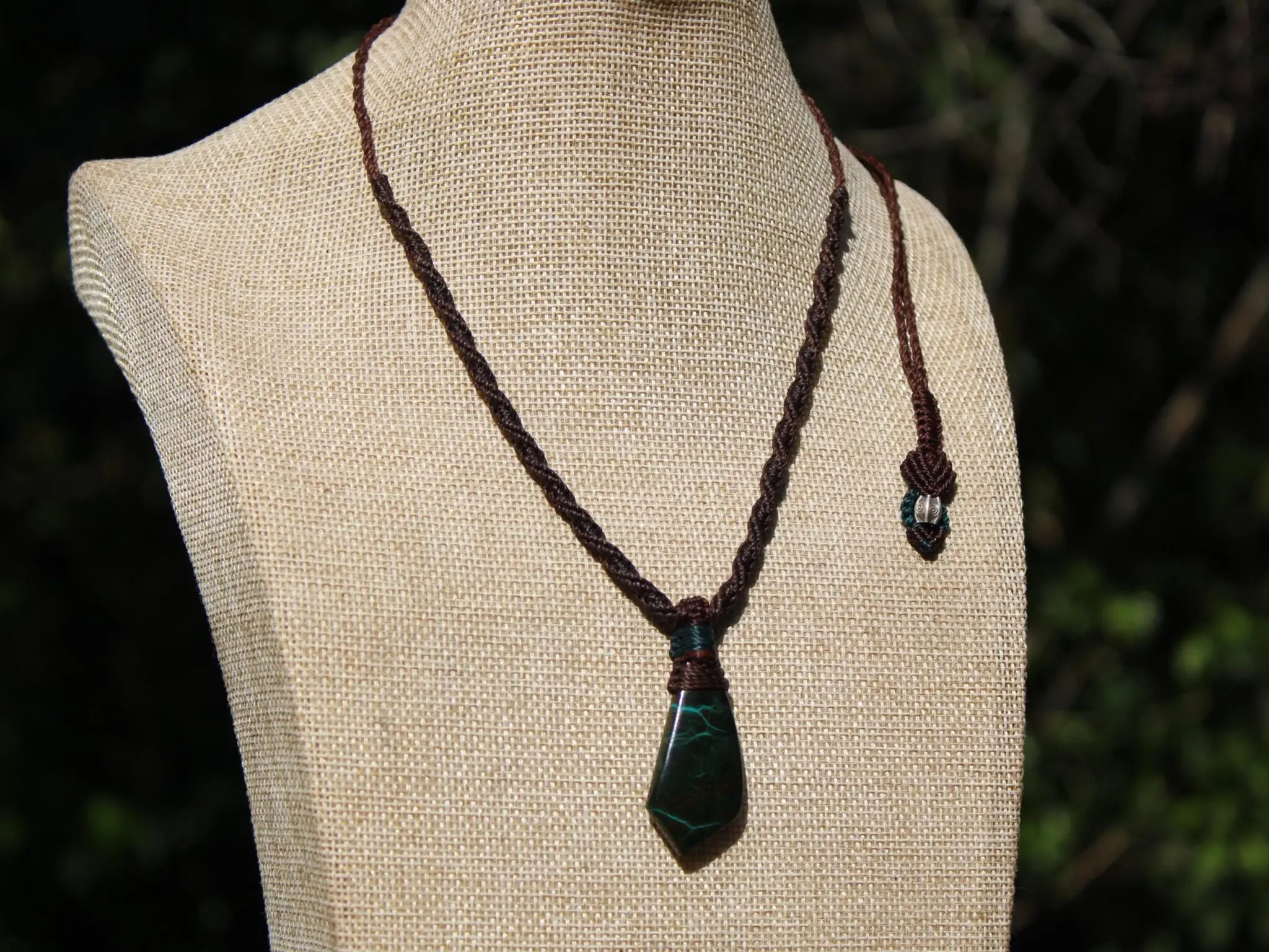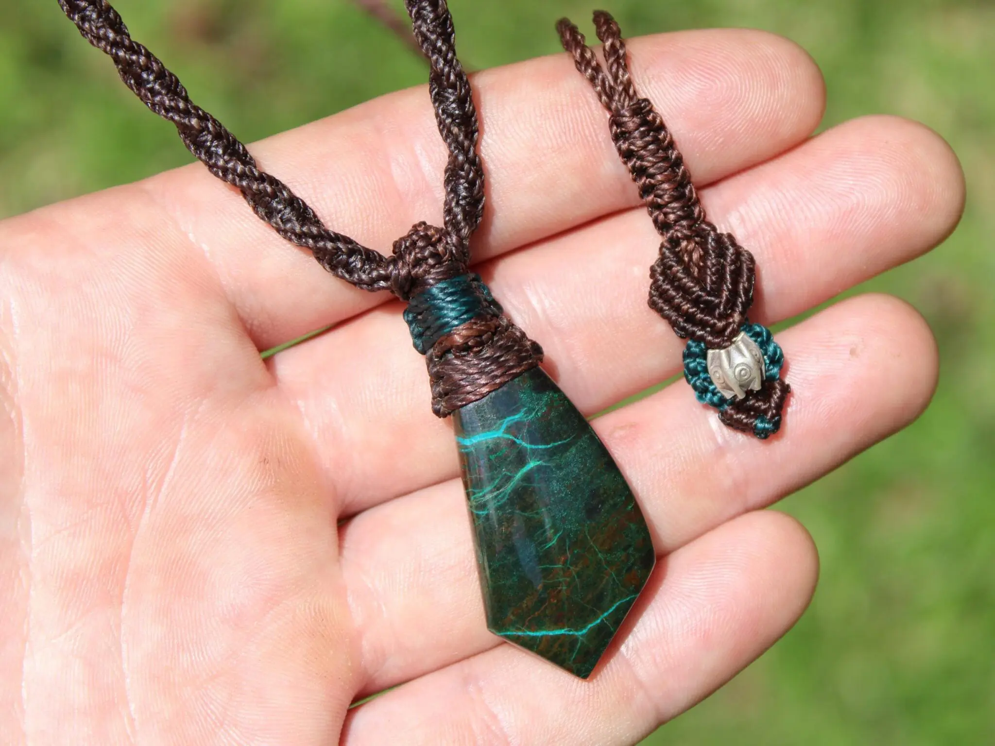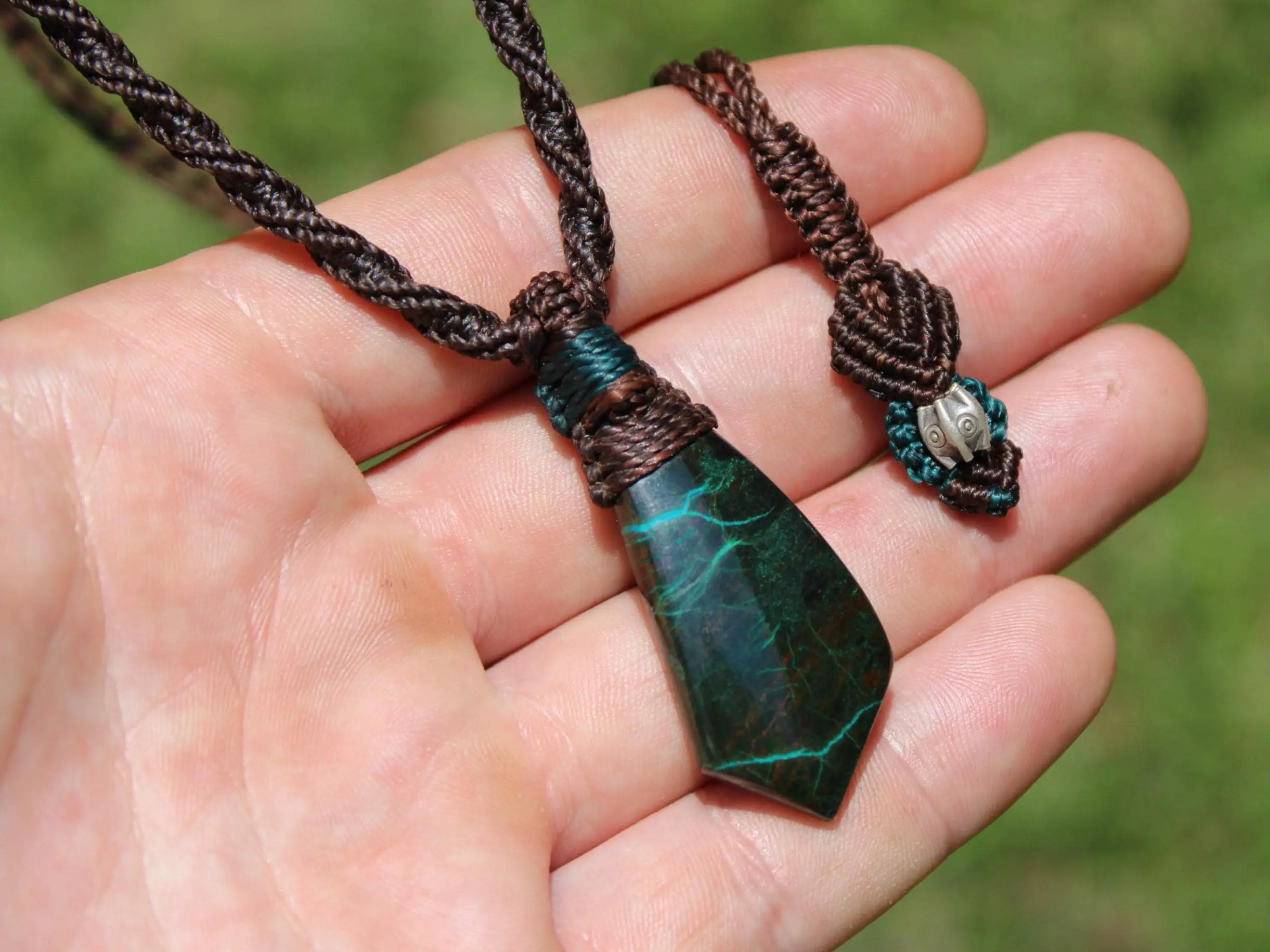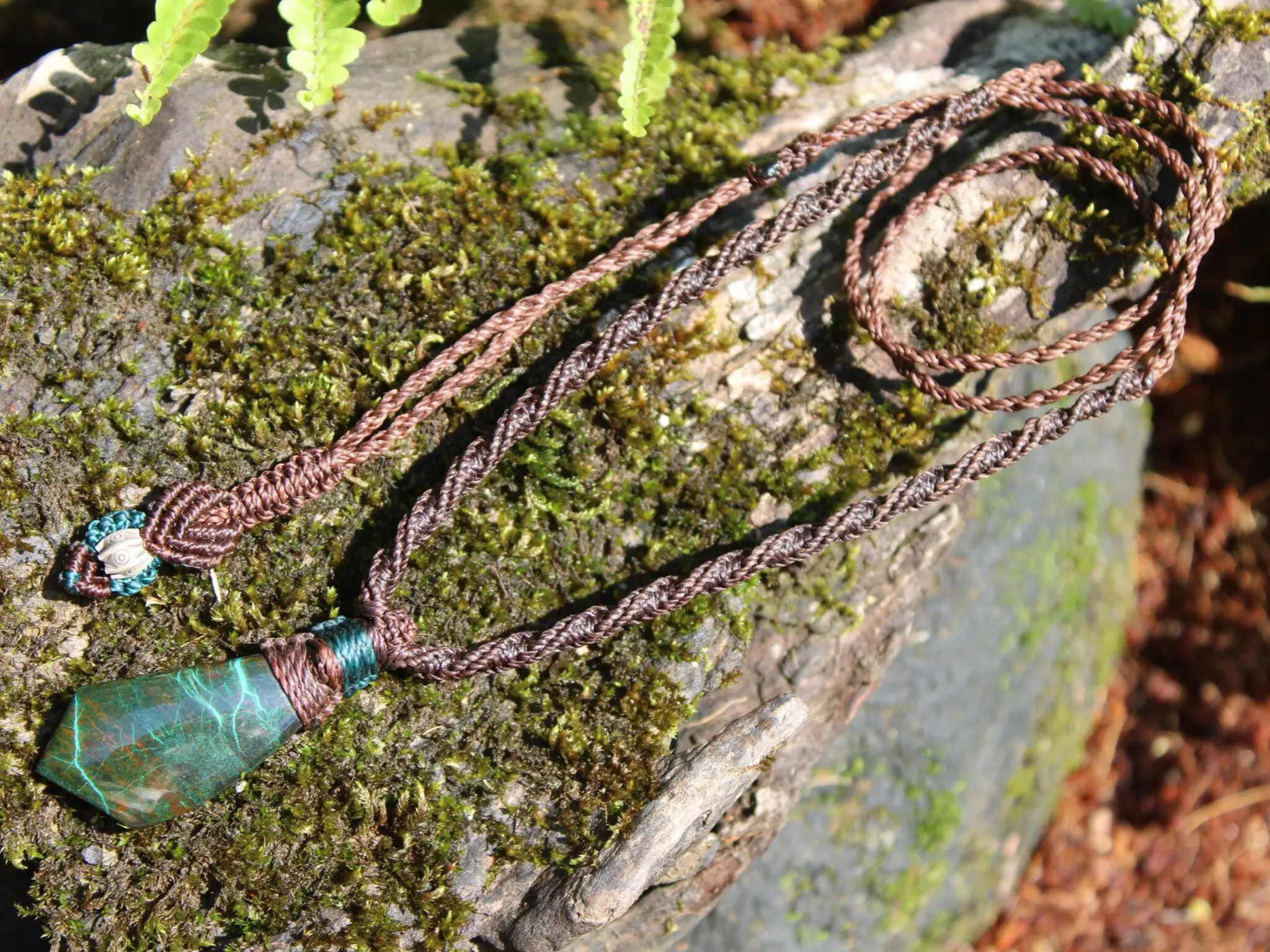 Each necklace is a collaboration of love and craftsmanship — the stone was hand-cut and polished by my husband, while I handwove the macramé cord using an ancient knot technique. Together, the energy of this piece shines with care, devotion, and intention.
