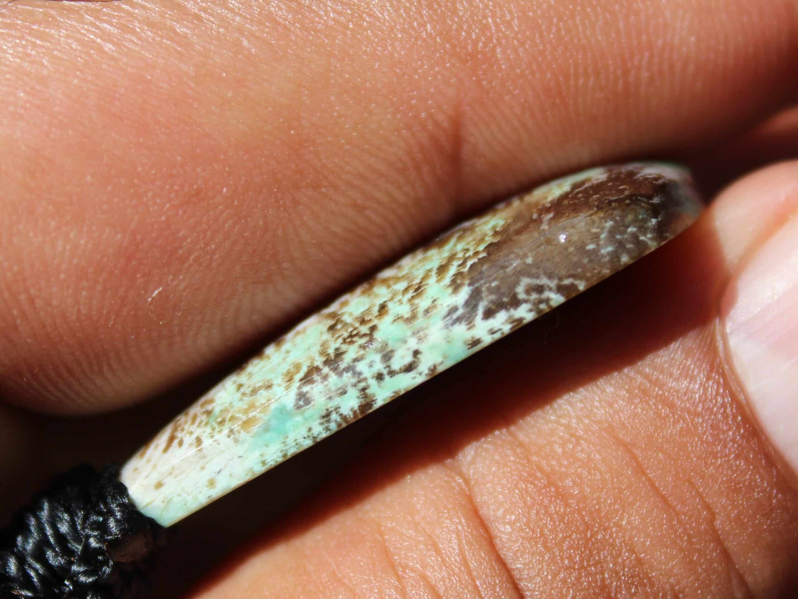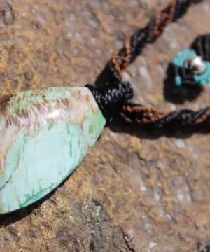 This is a handmade one-of-a-kind Australian handcrafted talisman, featuring an exceptionally rare piece of colla wood. Colla wood is a transparent opalised wood, comprised of chrysocolla, azurite, sulfur, and malachite. These incredible minerals infuse in the wood, over time. It is exceptionally hard – and difficult to break. This talisman features a 1000 pure silver tribal bead that has been hand-cut and chiseled using traditional methods.