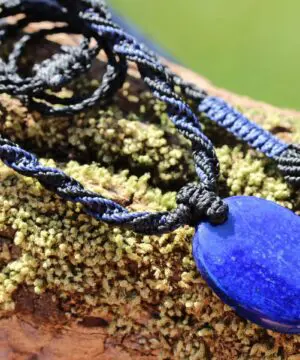 This divine lapiz lazuli crystal talisman has been handcrafted by us here at Platypus Dreaming in the luscious rainforests of Far North Queensland, Australia. It has a magnificent polish and vibrant sheen. This lapiz also has pyrite inside which gives off the beautiful gold looking colour. The vibrant lapiz has been ethically sourced from a small family business in Afghanistan – which we sourced years ago while travelling. This talisman features a 1000 pure silver tribal bead that has been hand-cut and chiseled using traditional techniques.