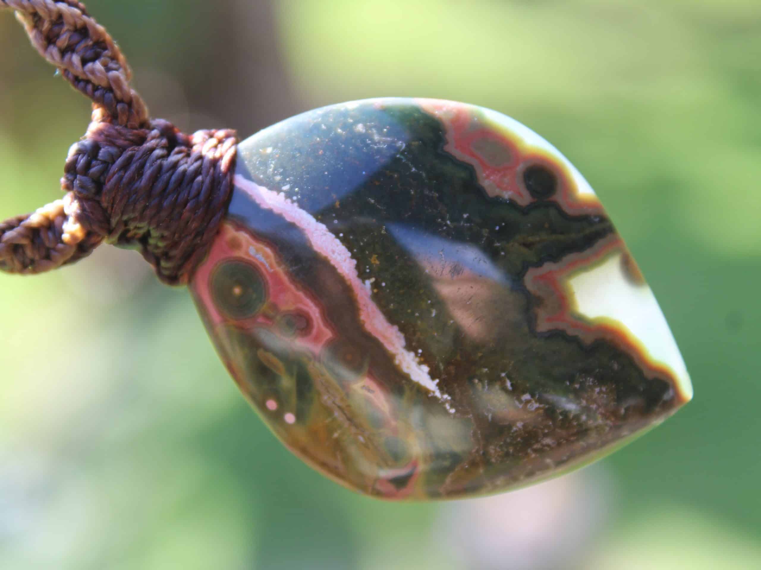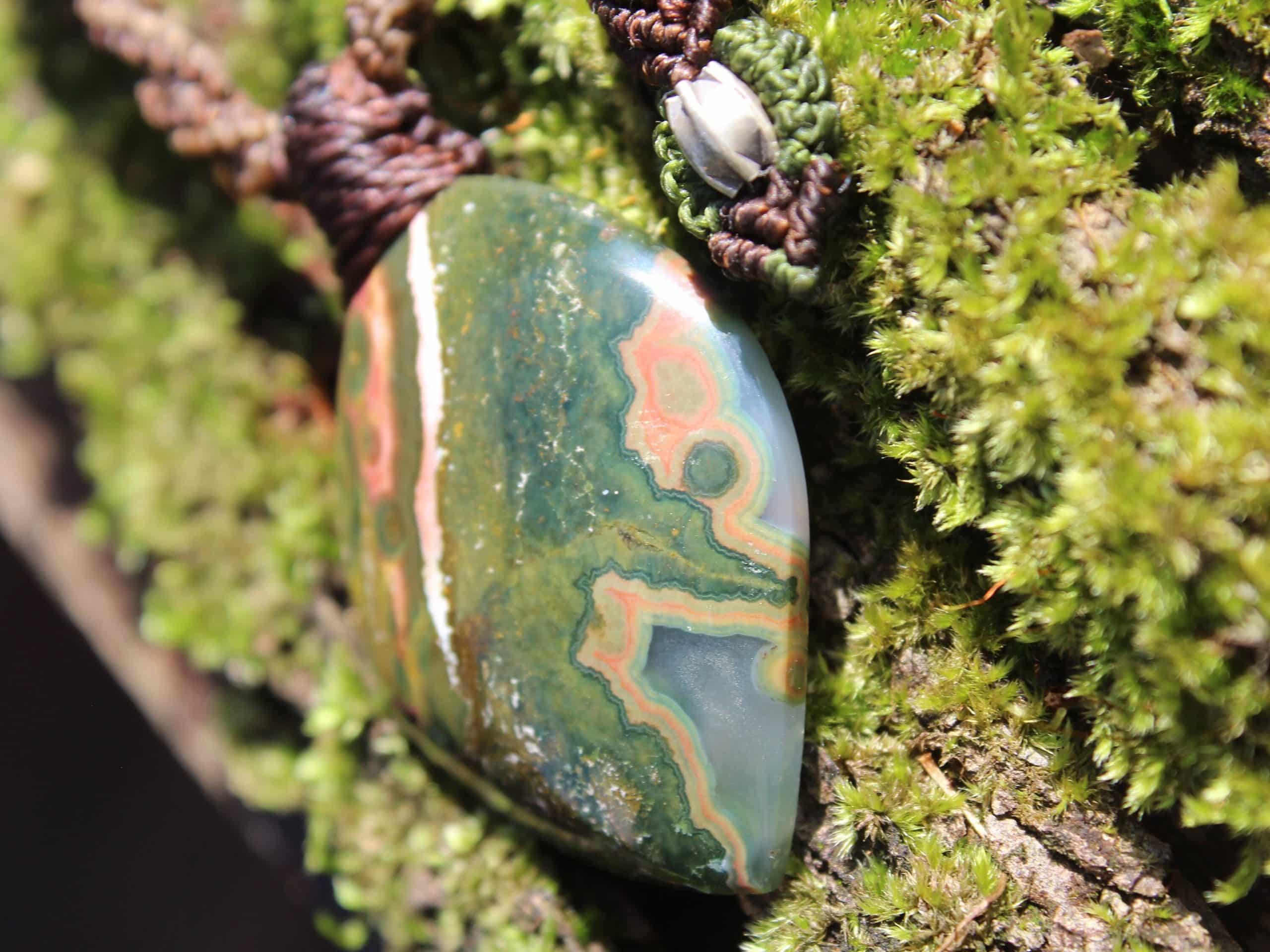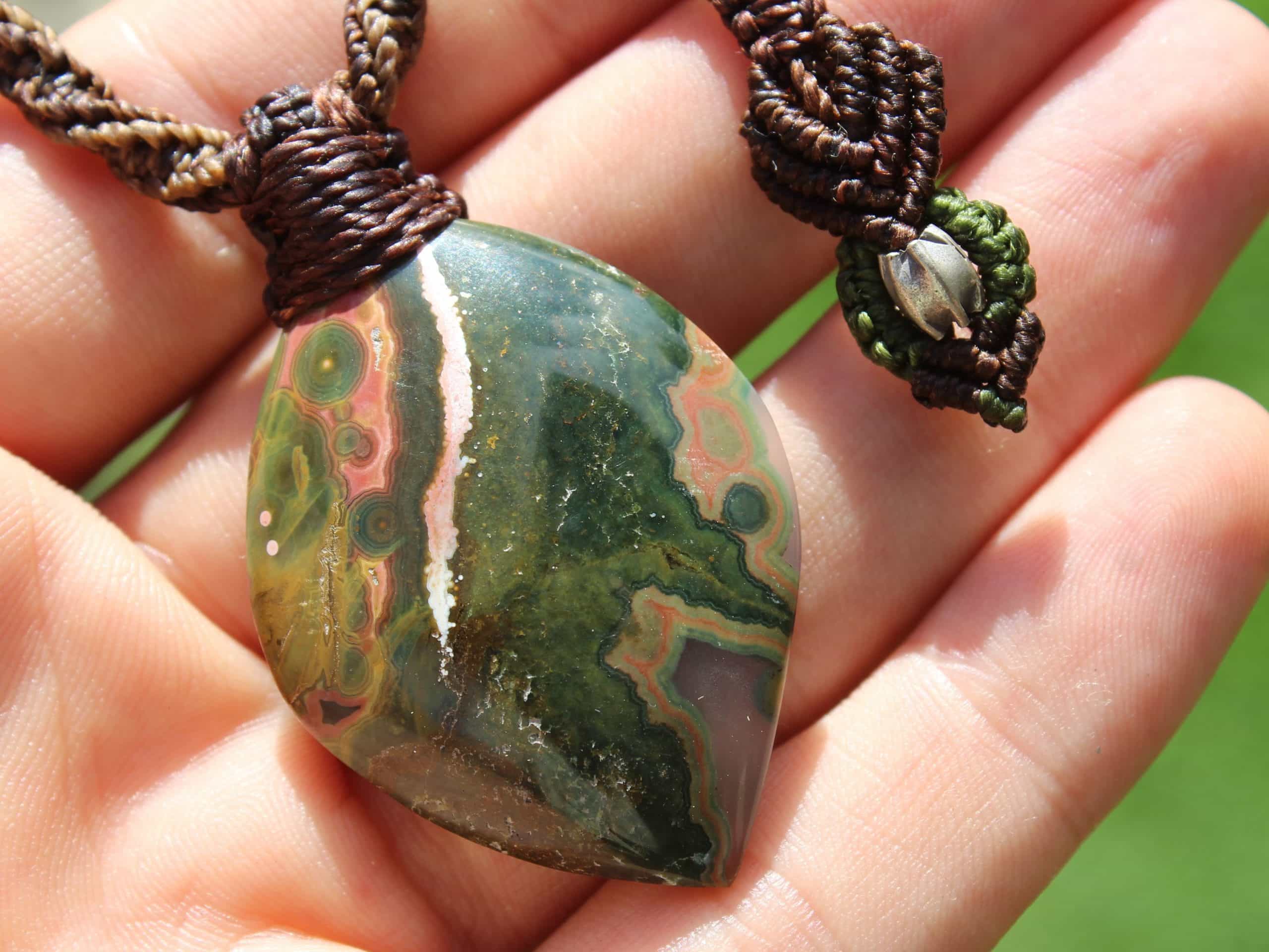Ocean Jasper was named for its location as well as its resemblance to the foam of the ocean as it recedes back into the ocean, with its wavy patterns of green-gray, white, cream, beige, brown, pink and maroon.