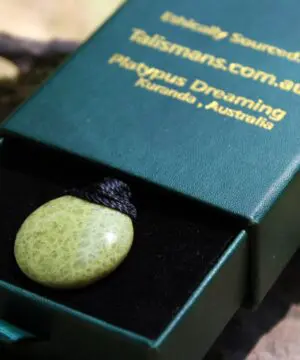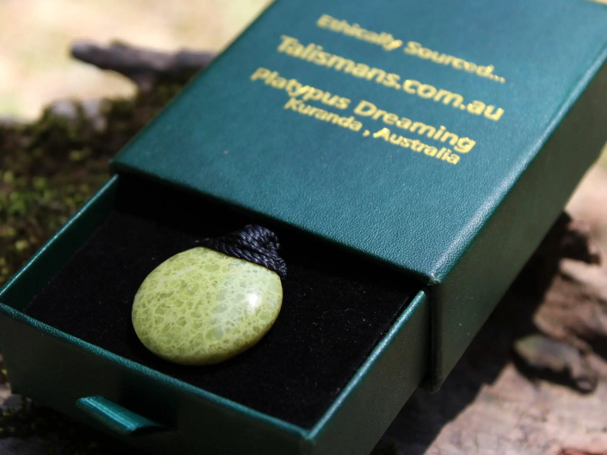 This is a very new found stone- a beautiful Green Opal, handcrafted by us here at Platypus Dreaming in the luscious rainforests of Far North Queensland, Australia. The stone itself is from Madagascar, and it has been cut and polished by us. We were very excited by this interesting opal variation. This talisman features a 1000 pure silver tribal bead that has been hand-cut and chiseled using traditional techniques.