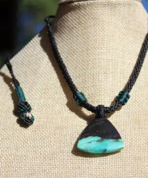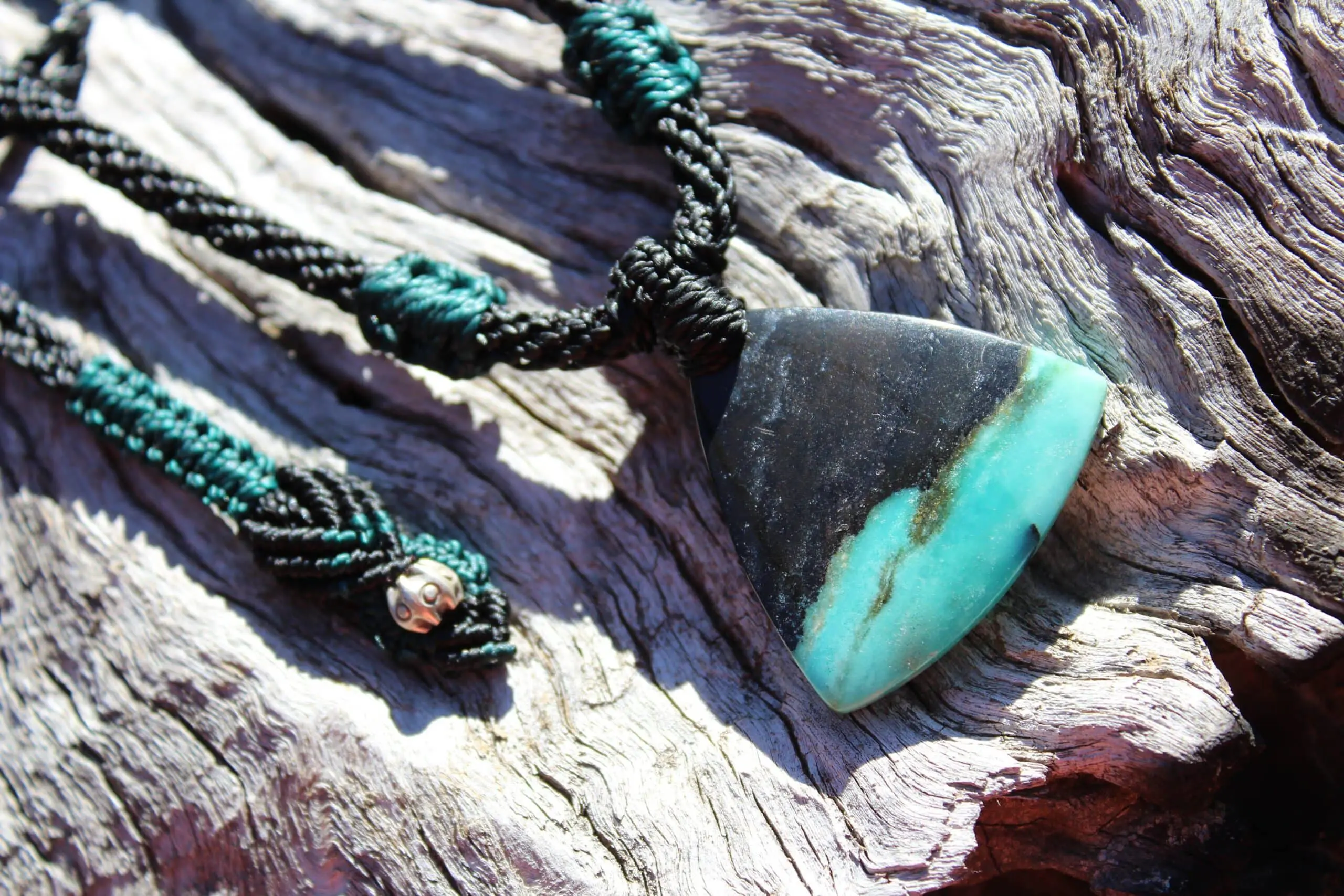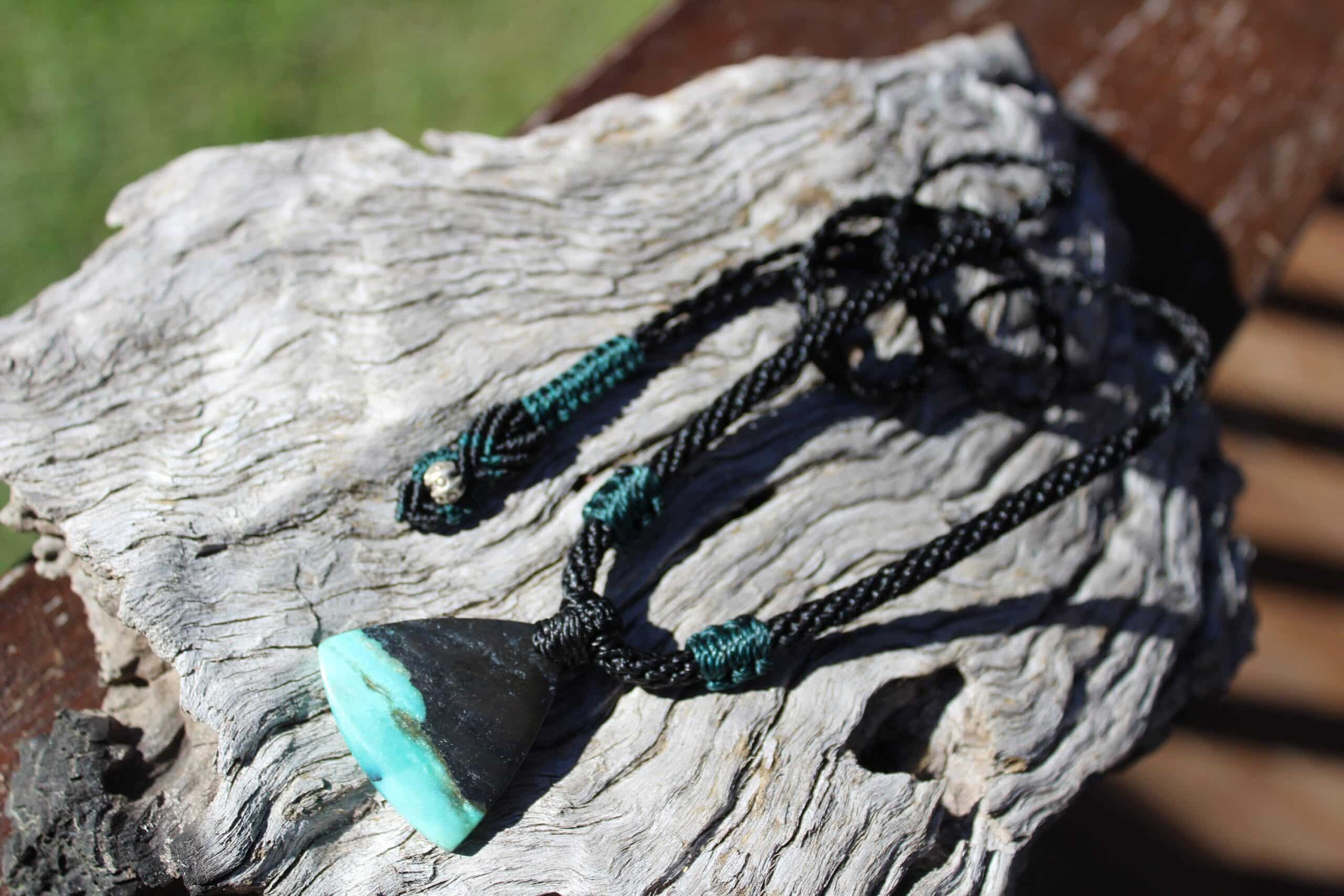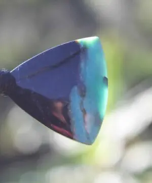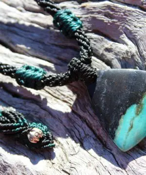 This is a super rare new found blue green opalised wood crystal talisman, handcrafted by us here at Platypus Dreaming in Far North Queensland, Australia. This incredible mineral was only discovered in 2018, near the slopes of three volcanoes in Indonesia’s West Java Province. What the miners actually found was an ancient petrified forest (how cool is that?), which had been pushed over by the deluge of “stuff” (pyroclastic flow) from a volcanic explosion. Then, over the ages, the wood was fossilized and preserved by opaline silica. The water in that silica was very rich in dissolved copper, iron, and manganese. Those copper and manganese deposits are now found inside this blue opal. This talisman also features a 1000 pure silver tribal bead that has been hand-cut and chiseled using traditional techniques.