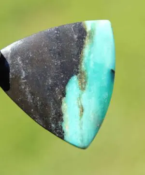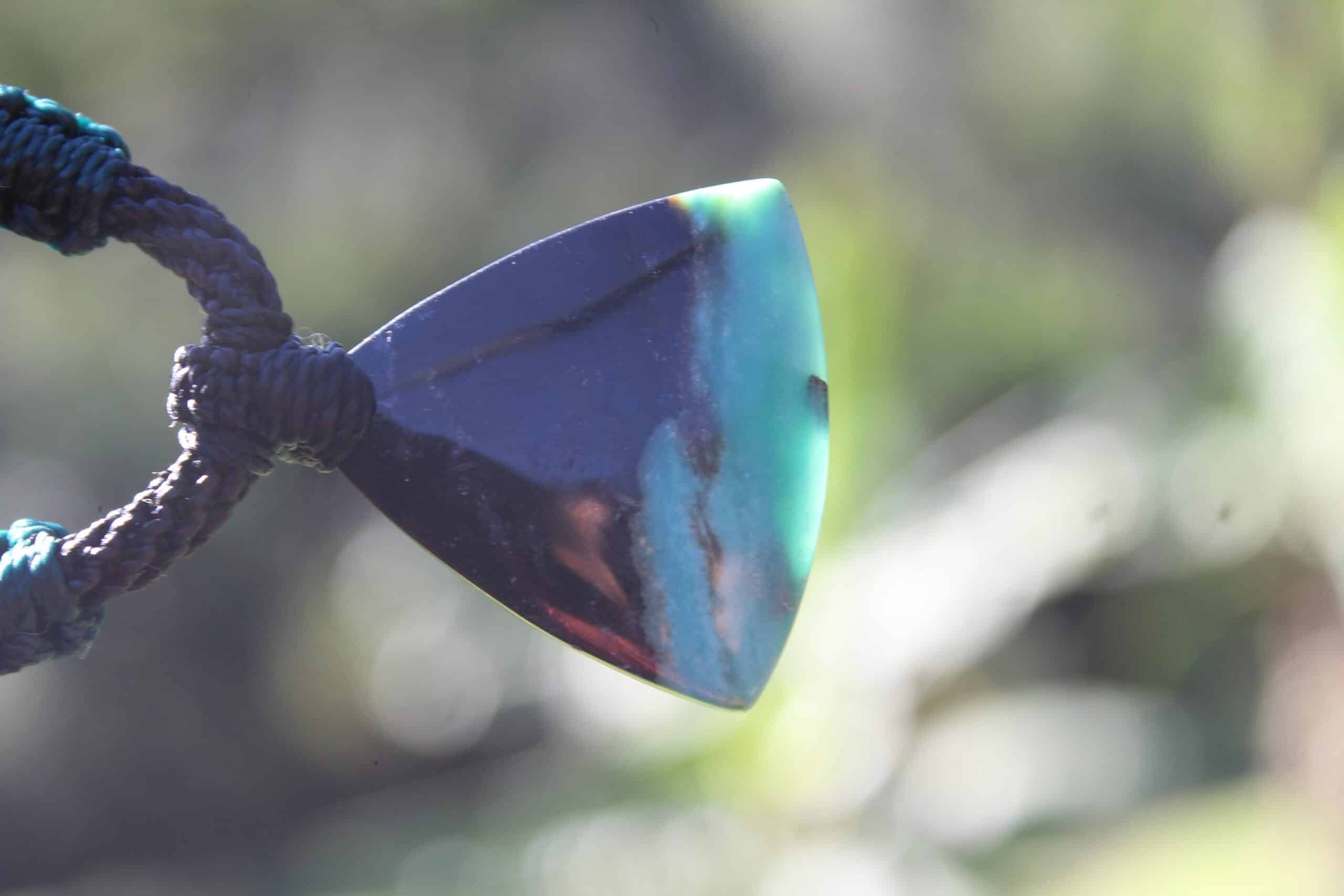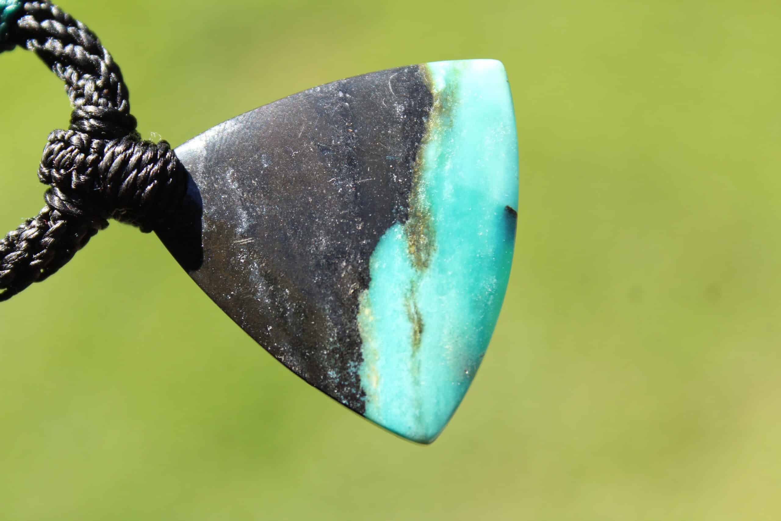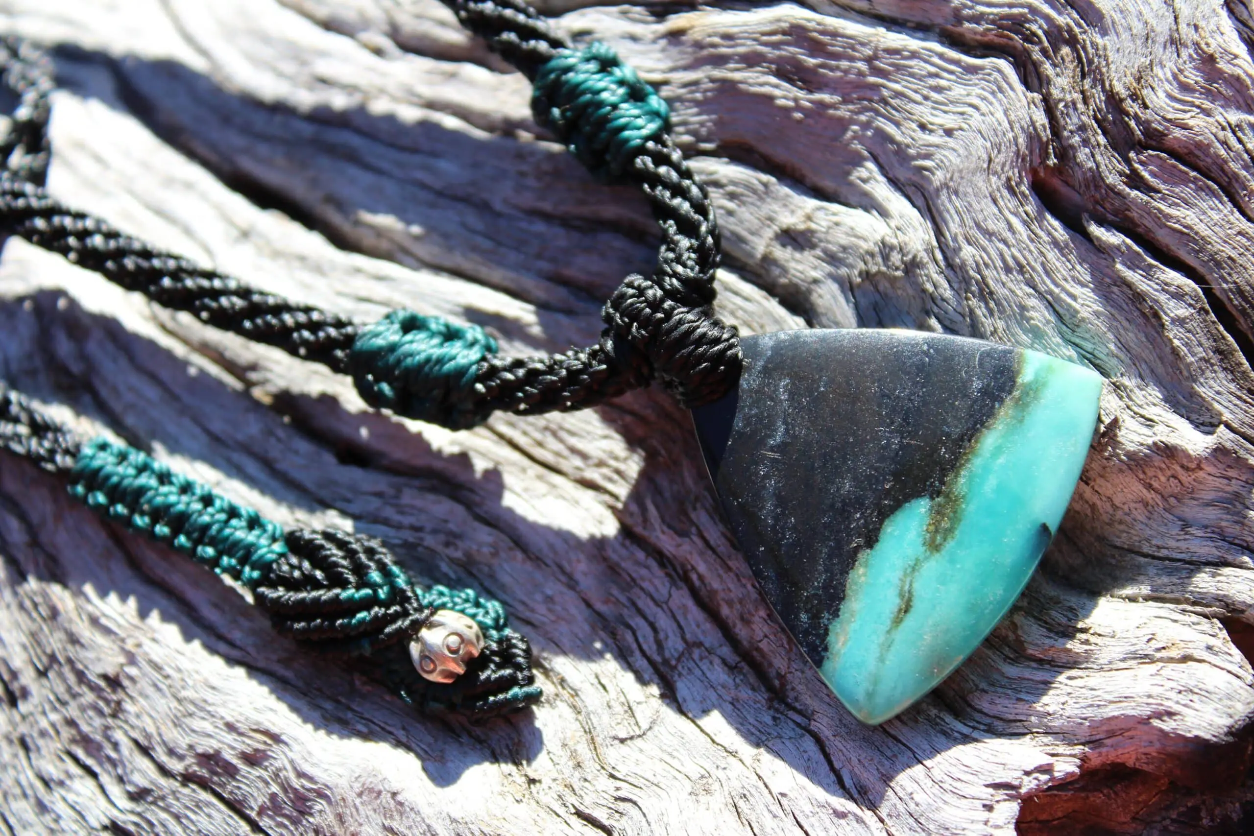 This is a super rare new found blue green opalised wood crystal talisman, handcrafted by us here at Platypus Dreaming in Far North Queensland, Australia. This incredible mineral was only discovered in 2018, near the slopes of three volcanoes in Indonesia’s West Java Province. What the miners actually found was an ancient petrified forest (how cool is that?), which had been pushed over by the deluge of “stuff” (pyroclastic flow) from a volcanic explosion. Then, over the ages, the wood was fossilized and preserved by opaline silica. The water in that silica was very rich in dissolved copper, iron, and manganese. Those copper and manganese deposits are now found inside this blue opal. This talisman also features a 1000 pure silver tribal bead that has been hand-cut and chiseled using traditional techniques.
