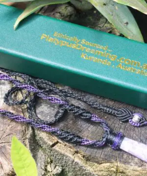 Each piece is a collaborative creation. We create everything from start to finish. We live in the oldest rainforest on Earth. Original name for Kuranda is Ngumbi, which is the local word for “platypus”. Be part of the platypus dreaming. All our rocks are consciously collected, cut and polished. Fair Trade. Plant and Solar Powered. Each piece involves 7 to 10 hours, handmade from source by a two person.