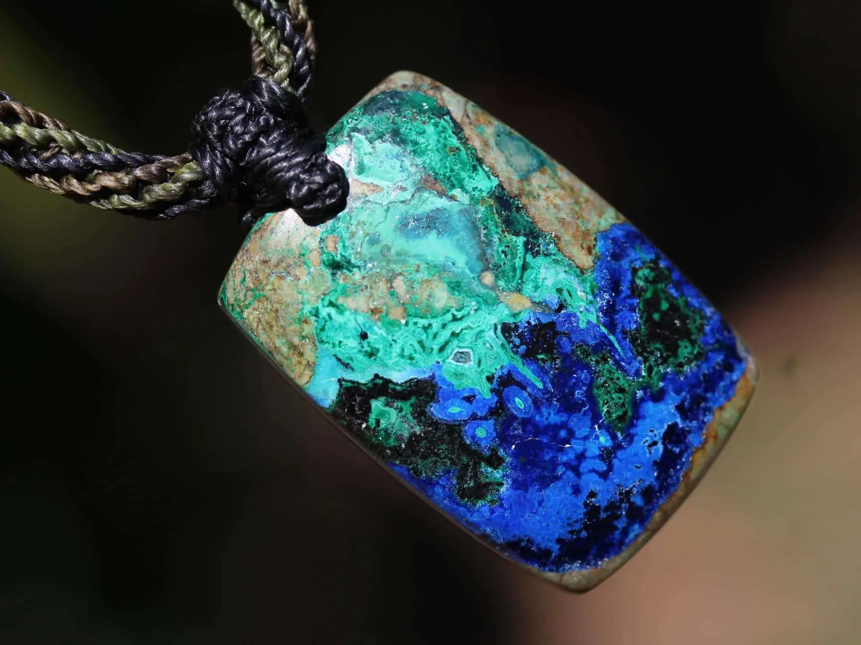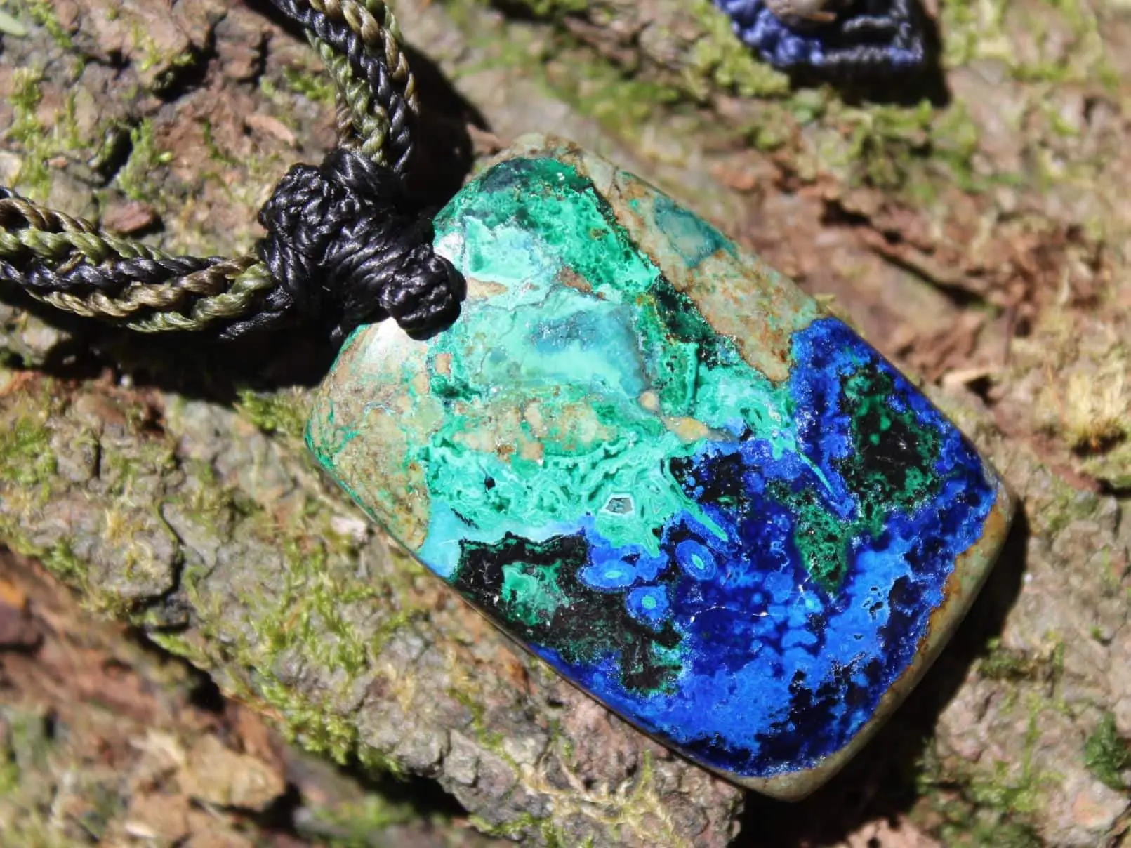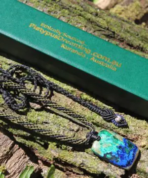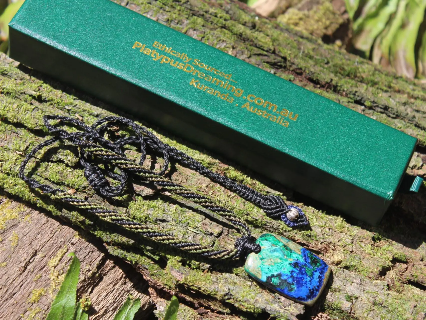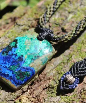 This divine large size Australian azurite crystal talisman has been handcrafted by us here at Platypus Dreaming in the luscious rainforests of Far North Queensland, Australia. This azurite is an incredible quality – and thick solid size! You can see all the elements blending together harmoniously in this unique piece. The azurite has been ethically sourced from a small family owner mine in Western Australia- making it ideal for crystal healing. This talisman features a 1000 pure silver tribal bead that has been hand-cut and chiseled using traditional techniques.