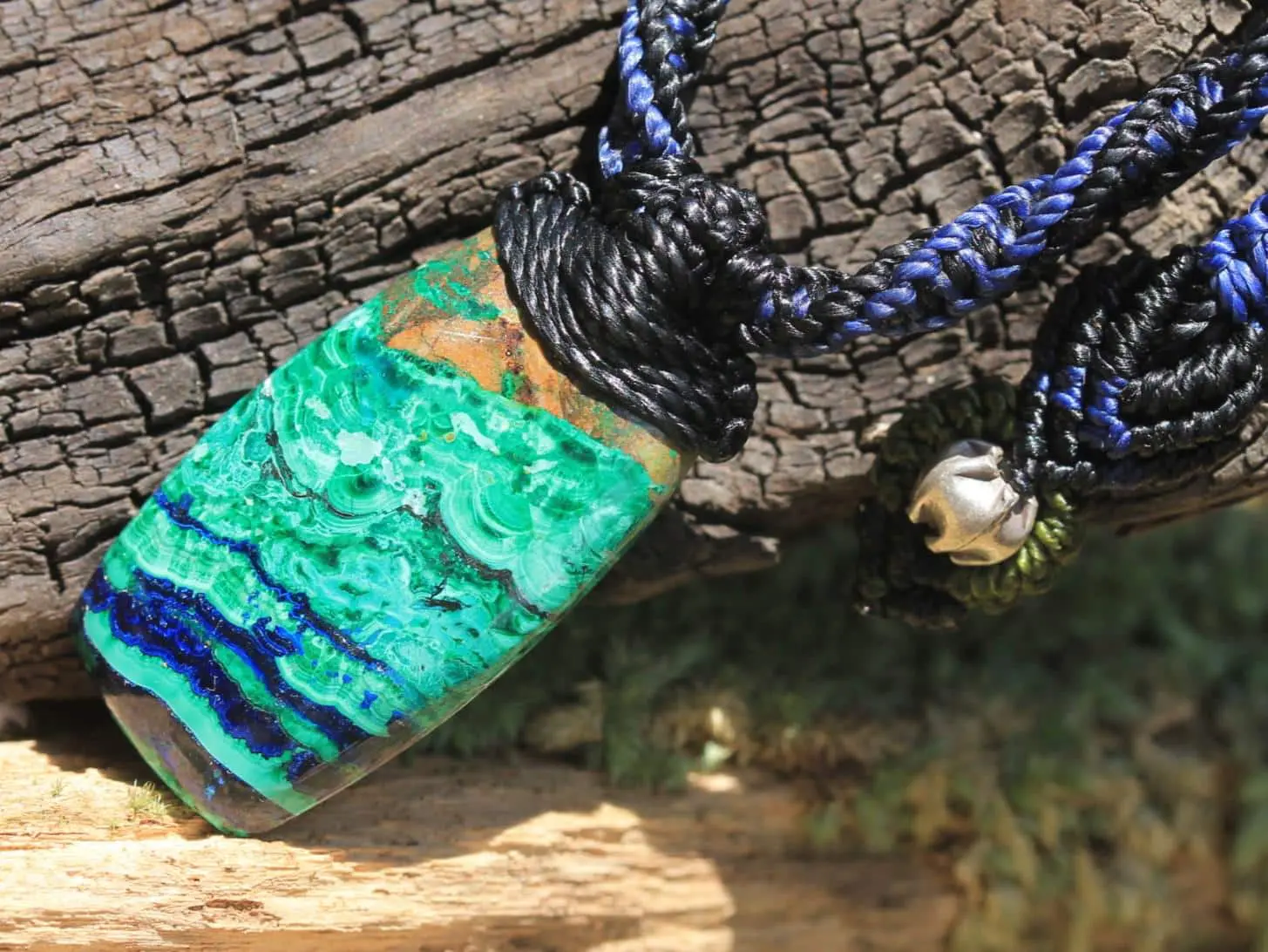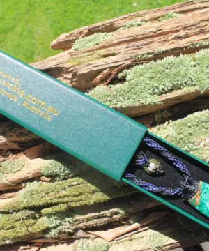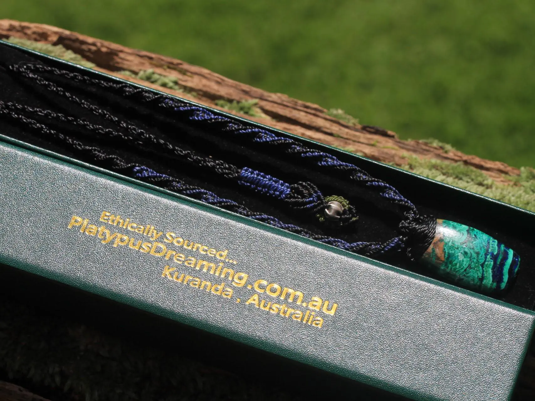 This divine azurite crystal talisman has been handcrafted by us here at Platypus Dreaming in the luscious rainforests of Far North Queensland, Australia. This azurite is an incredible quality – and thick solid size! You can see all the elements blending together harmoniously in this unique piece. The azurite has been ethically sourced from a small family owner copper mine in Peru – making it ideal for crystal healing. This talisman features a 1000 pure silver tribal bead that has been hand-cut and chiseled using traditional techniques.