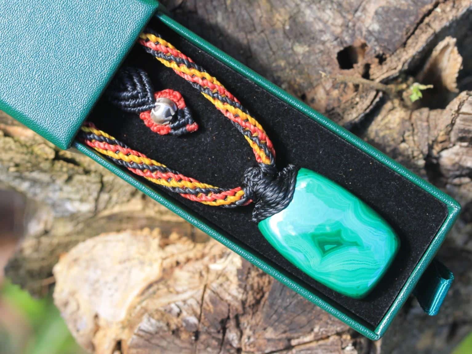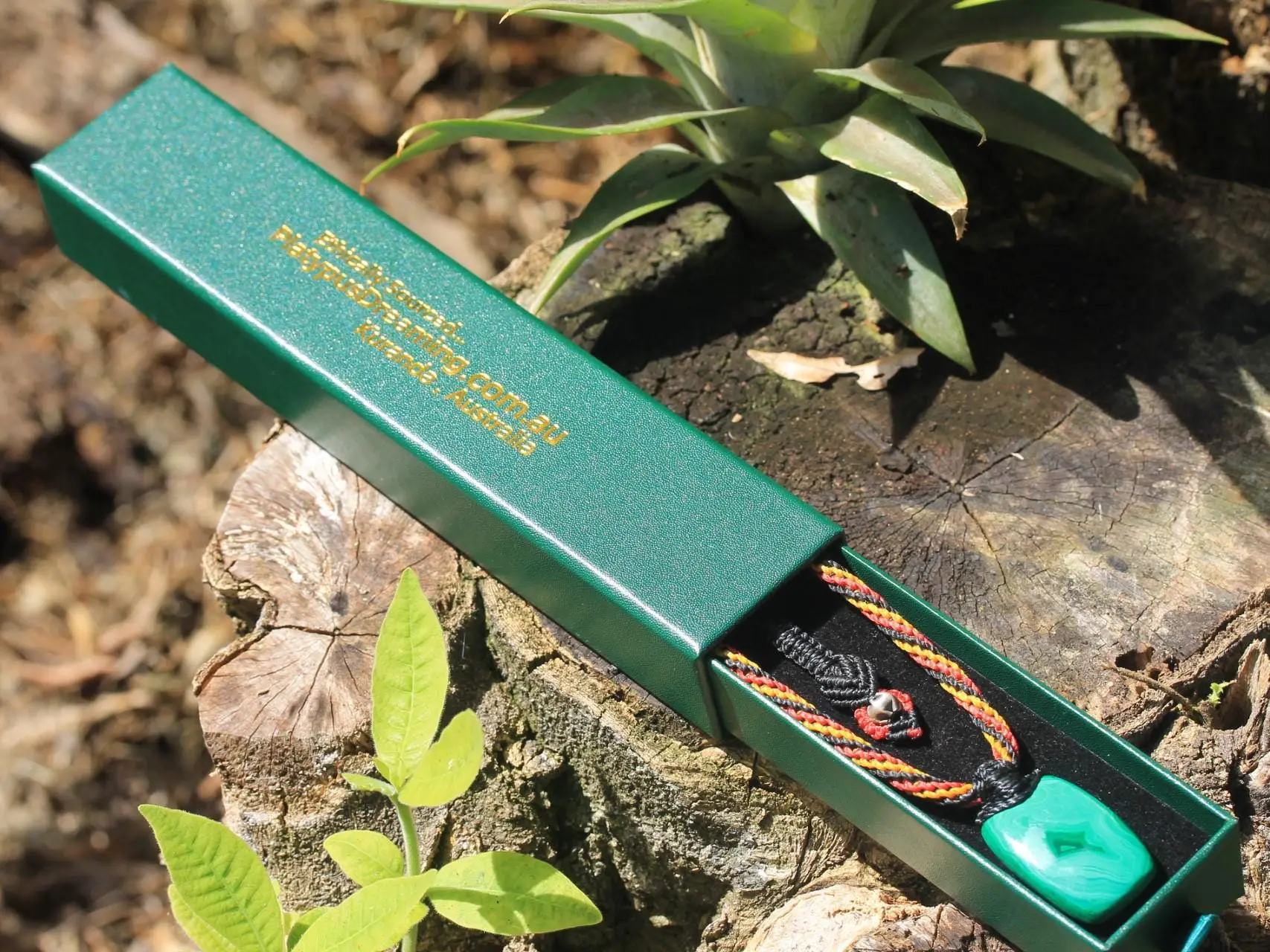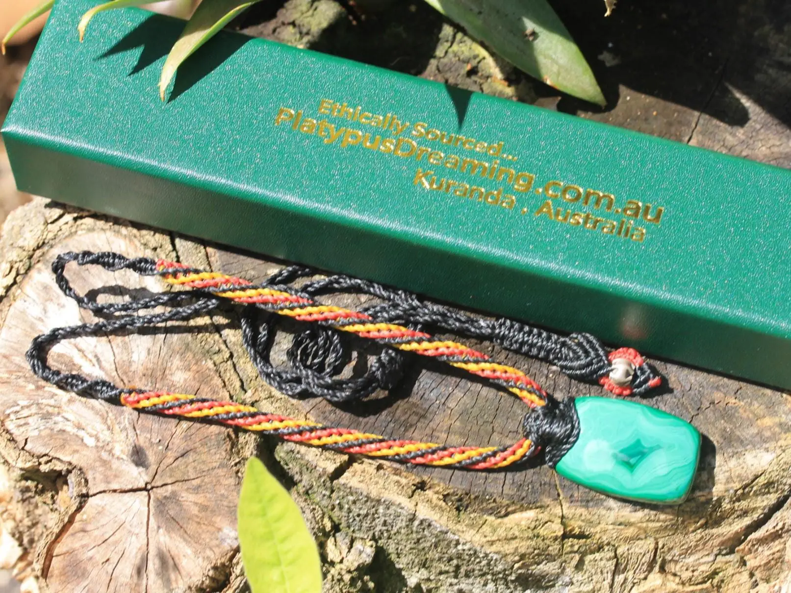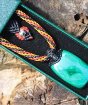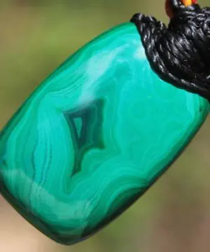 This is an AAA+ quality incredible Malachite crystal talisman. Some of the highest quality Malachite we have ever found! It has been handcrafted by us here at Platypus Dreaming. The stone itself is from the Congo, and was polished by us here in Far North Queensland, Australia. Malachite is a famous and very popular semi-precious stone. Its banded light and dark green designs are one-of-a-kind, and give it a unique ornamental quality unlike that of any other stone. This talisman also features a 1000 pure silver tribal bead that has been hand-cut and chiseled using traditional techniques.