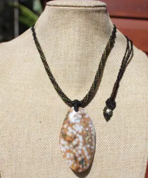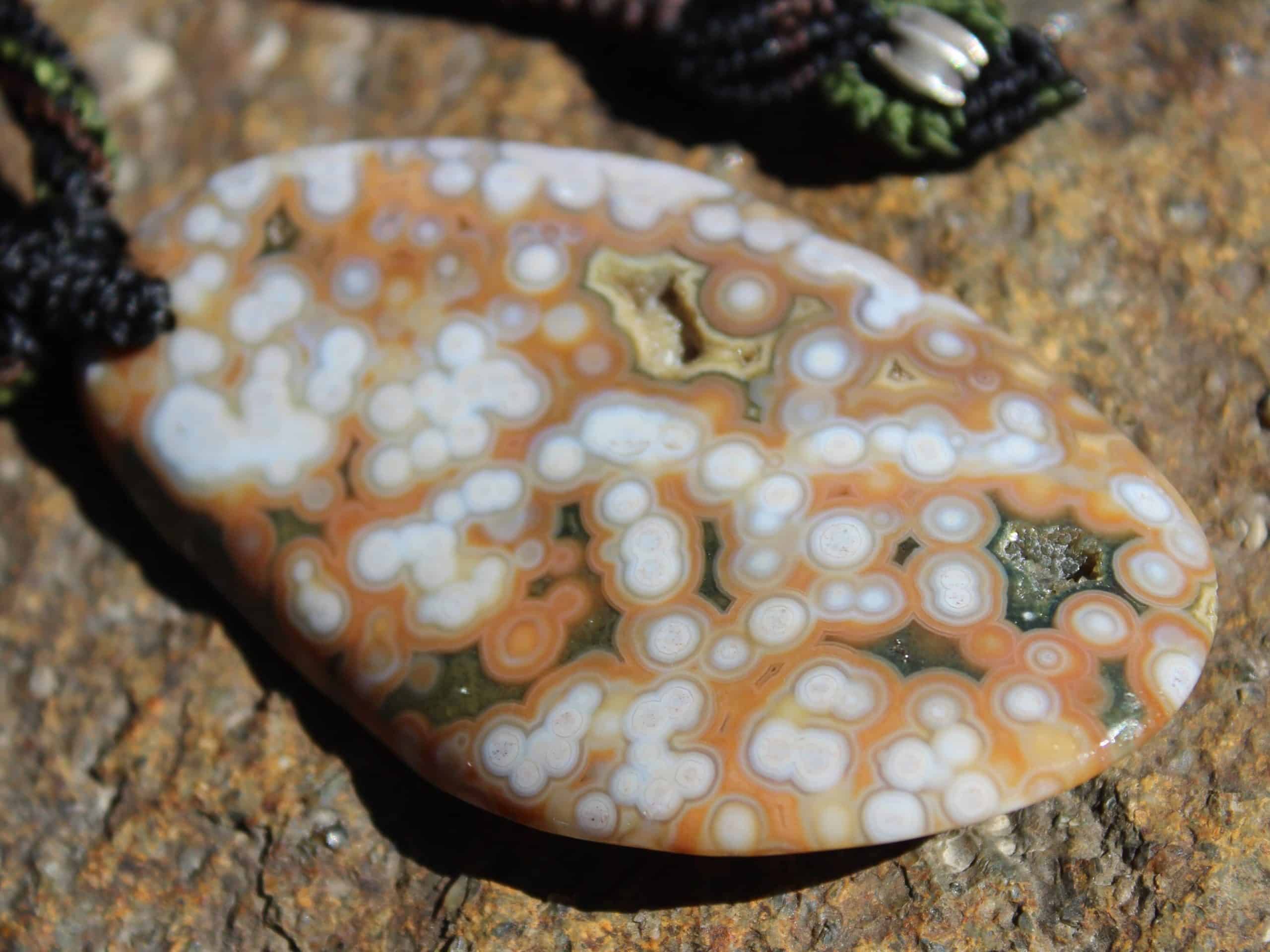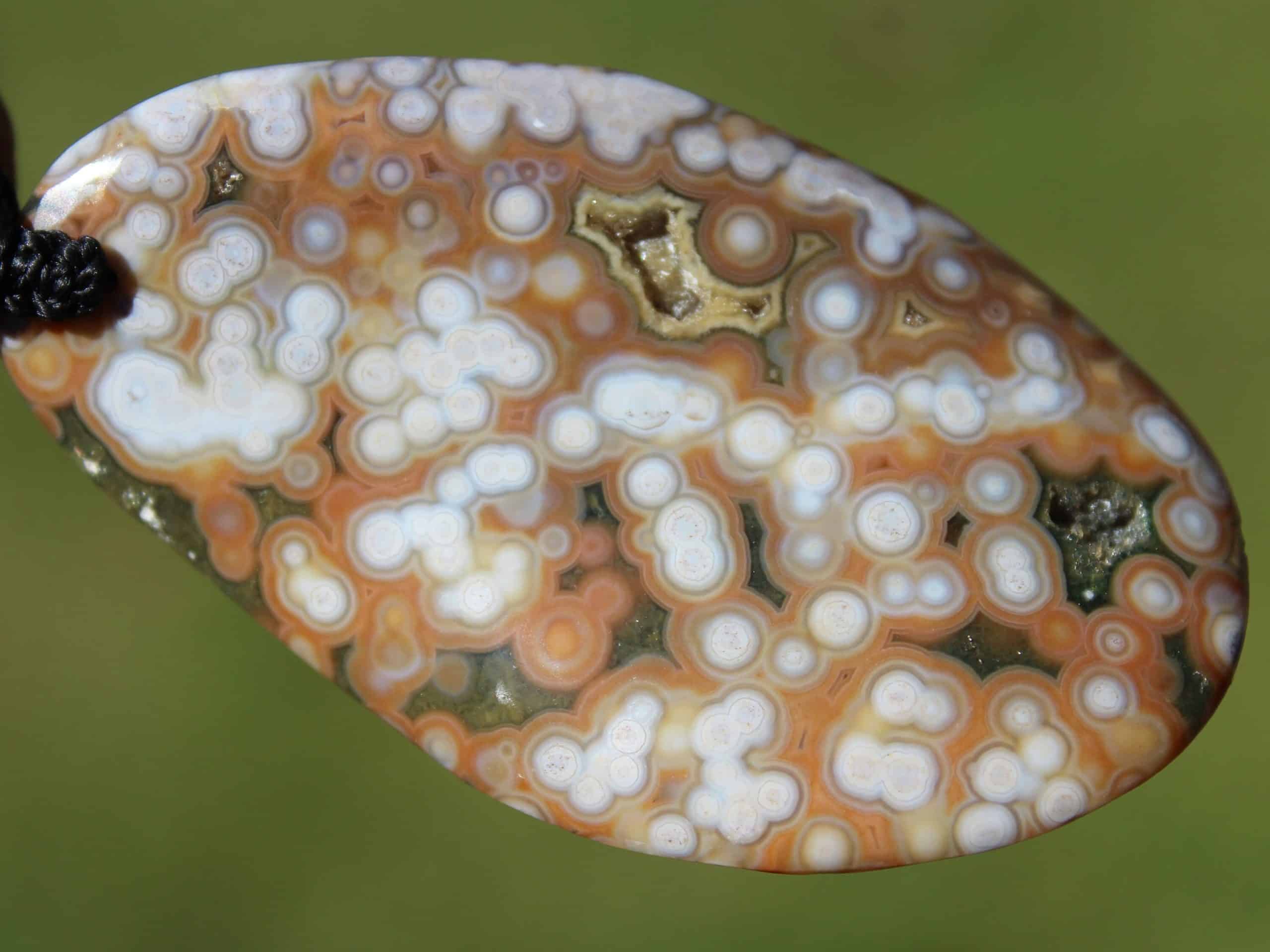 Ocean Jasper was named for its location as well as its resemblance to the foam of the ocean as it recedes back into the ocean, with its wavy patterns of green-gray, white, cream, beige, brown, pink and maroon.
