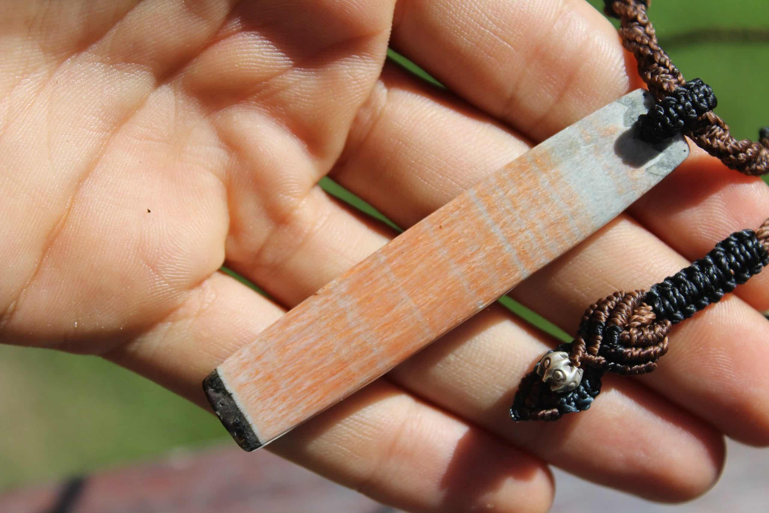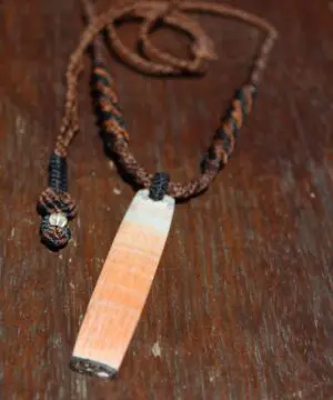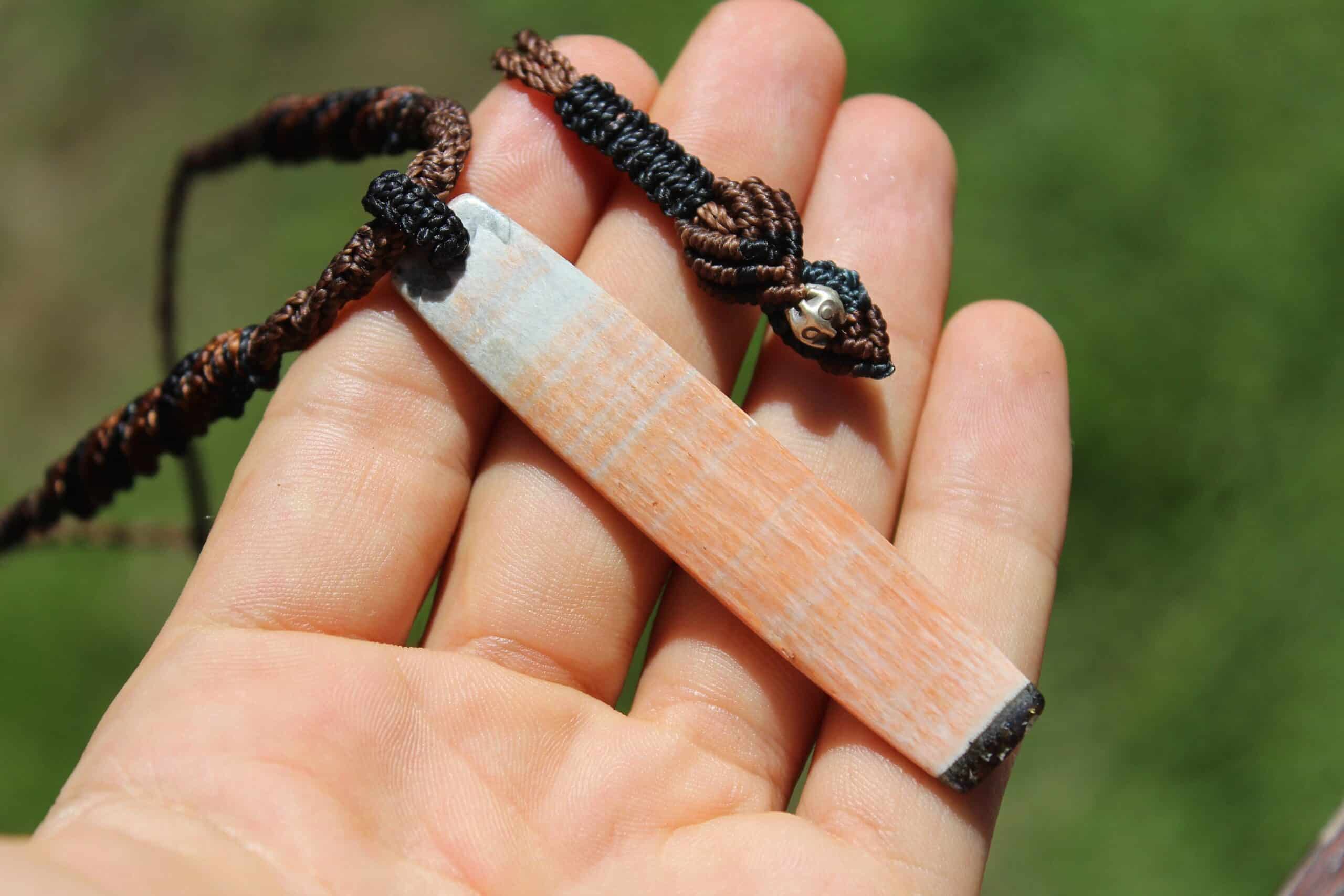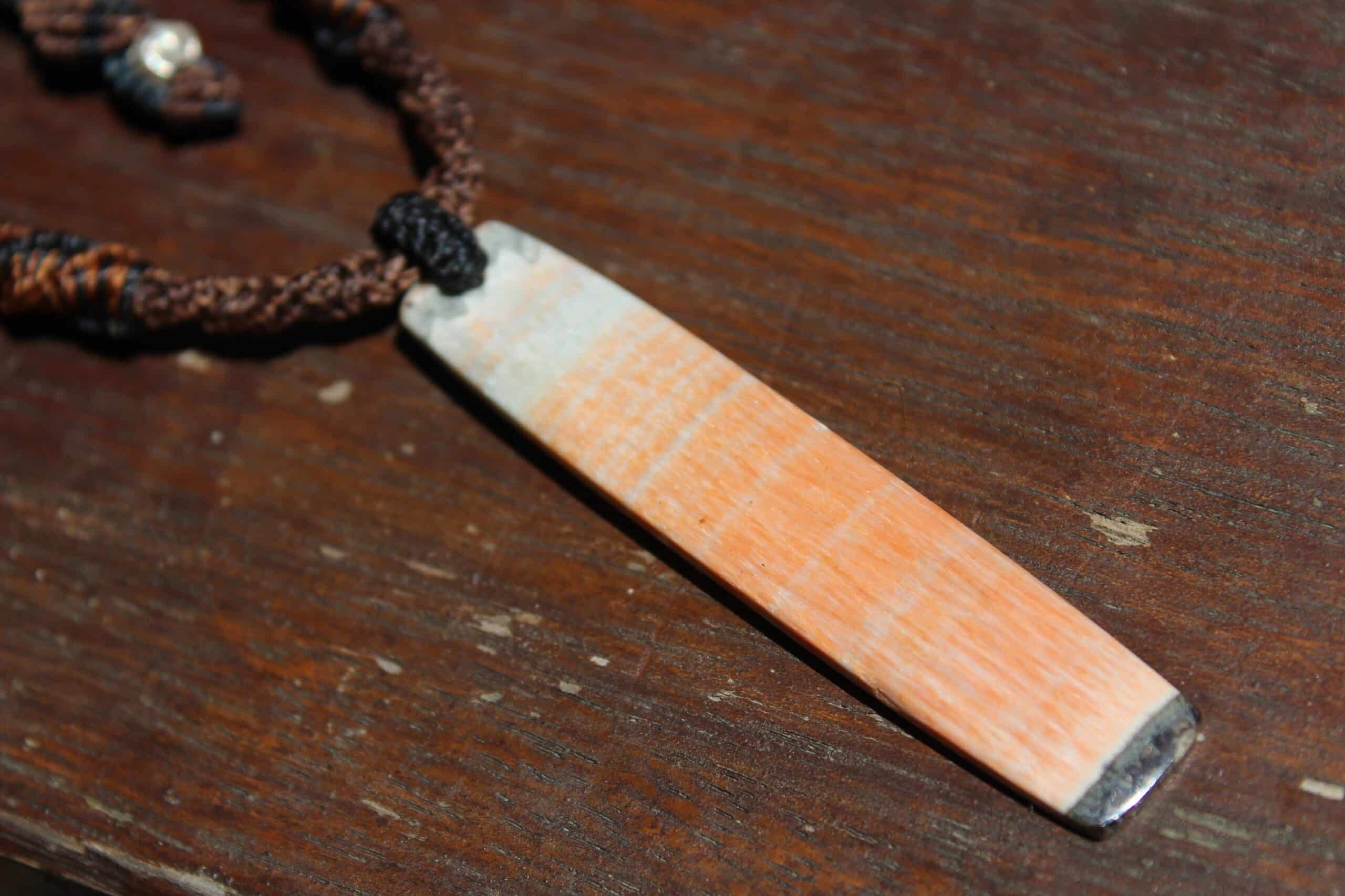 This is an exceptionally rare piece of Australian Celestobarite! While Barite is found all over Earth… the Australian variety is exceedingly rare, hence the high price it fetches, even at wholesale! This unique piece was hand collected from Tasmania, Australia. Celestobarite is a combination stone containing barium and strontium sulfates. It is salmon pink, pink/orange colored fibrous stone often with grey/blue banding. It combines the energies of Celestite (Celestine) and Barites (Barytes). Features a handcrafted 1000 pure silver bead.