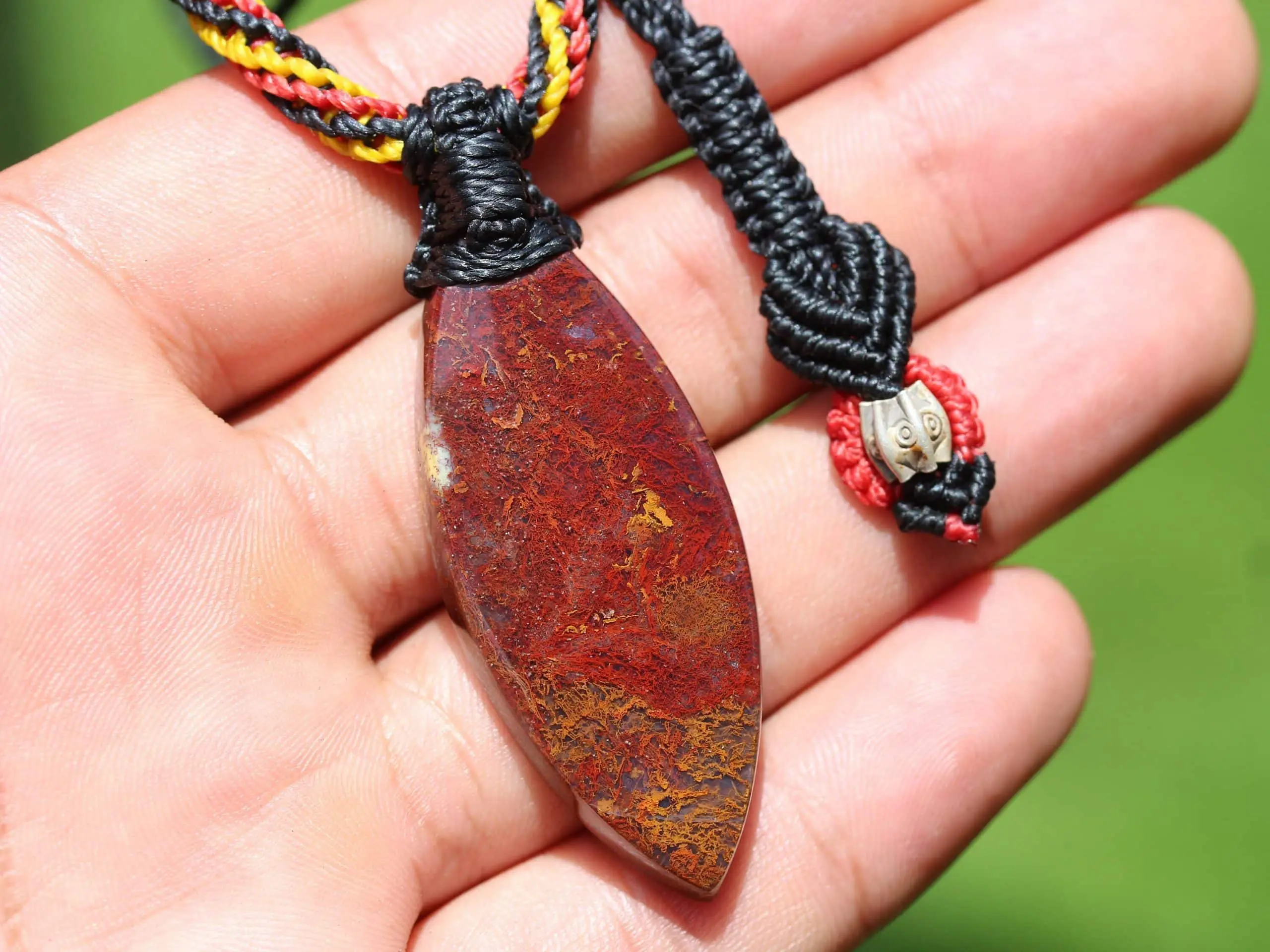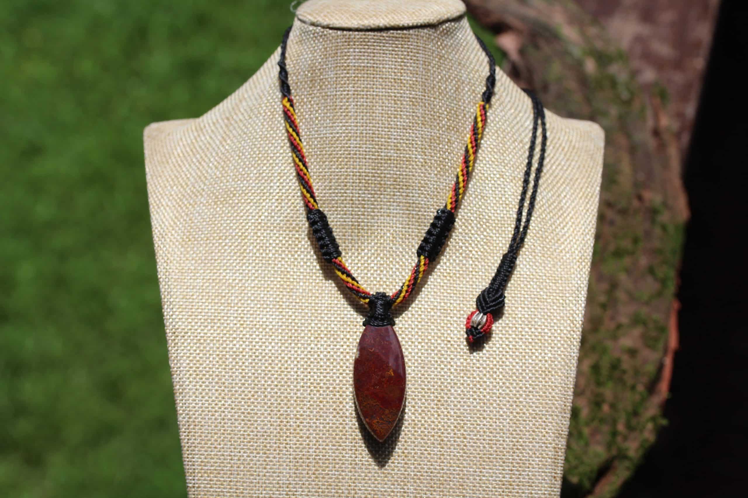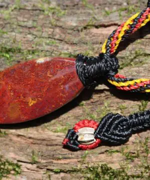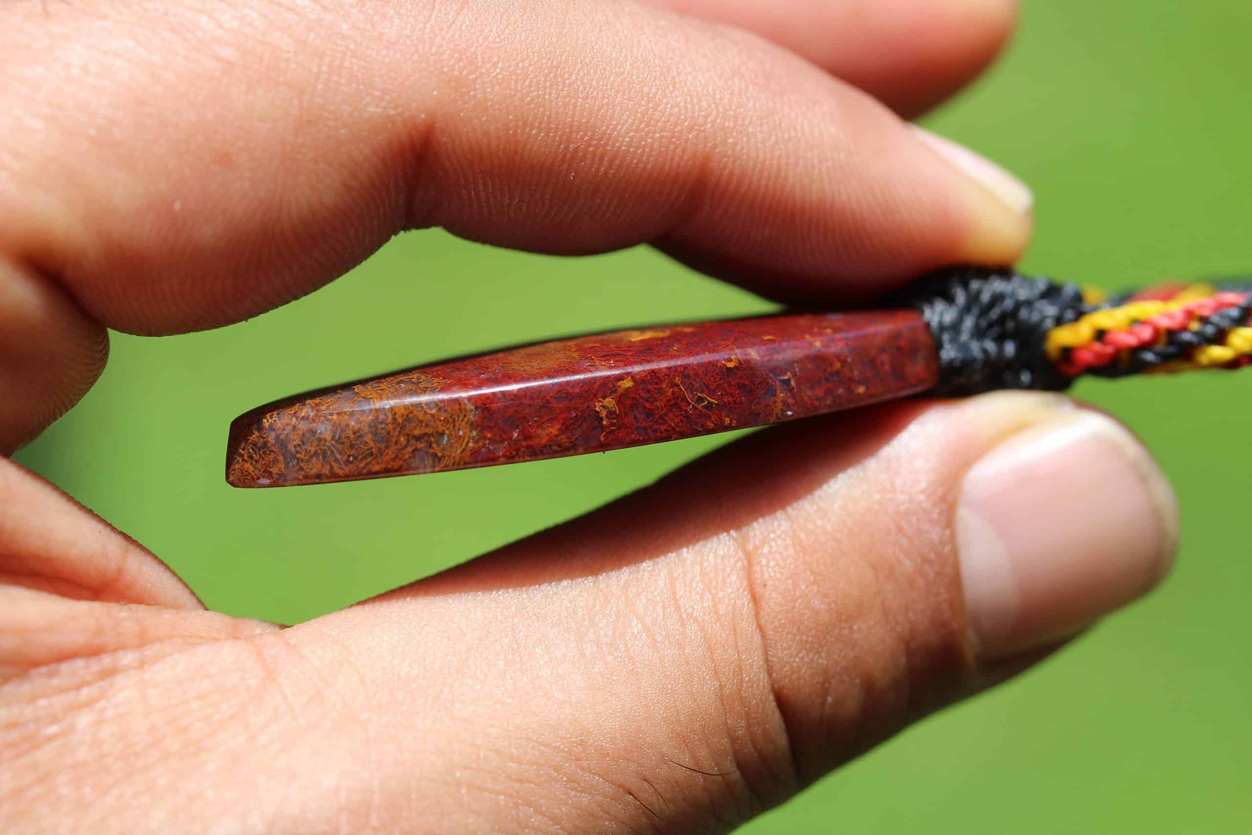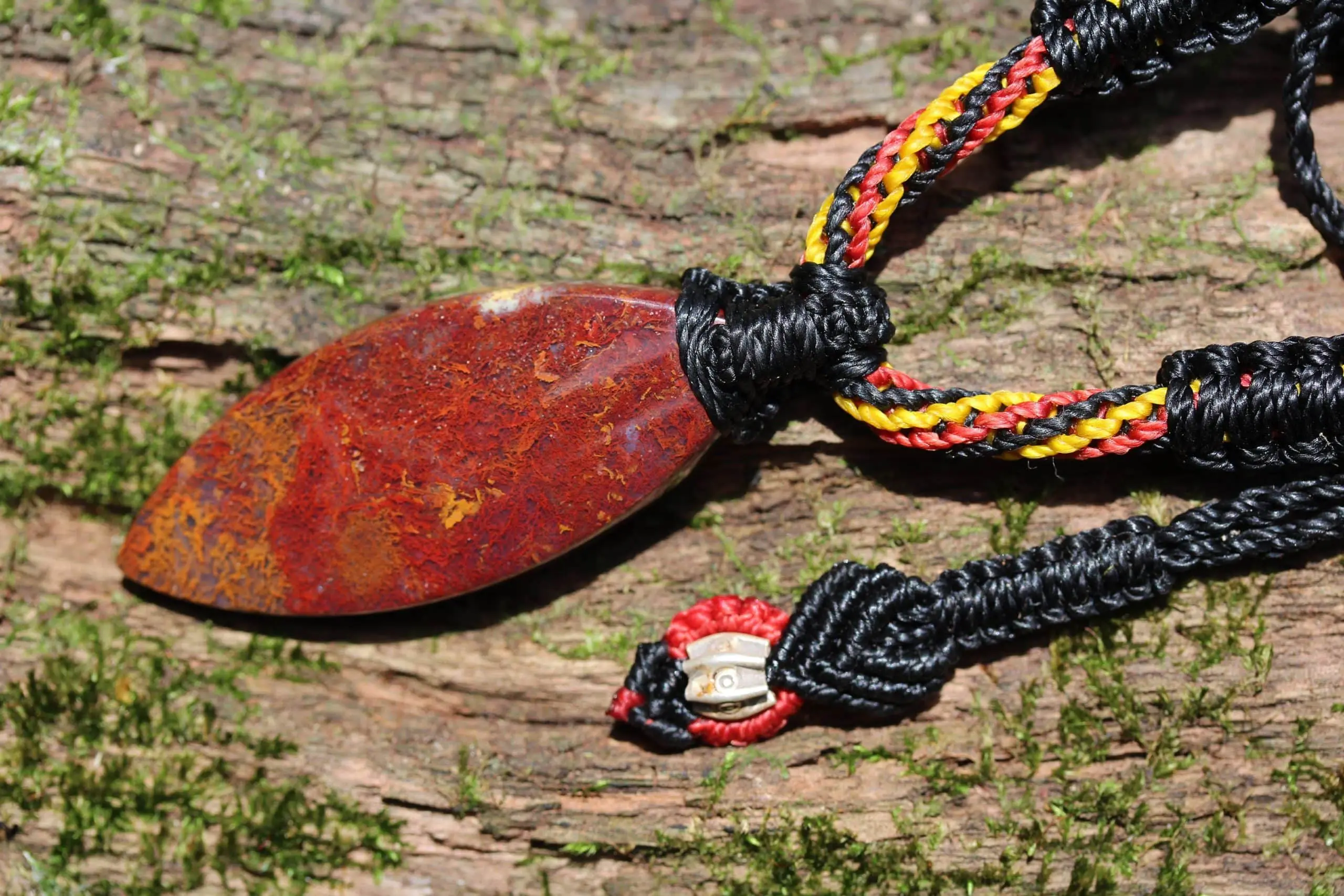 This is a unique and playful red moss agate talisman, handcrafted by us here at Platypus Dreaming in the luscious rainforests of Far North Queensland, Australia. The stone has been cut and polished from raw material and is fair trade and ethically sourced. The moss agate has been sourced from Java Island from a small family business. This creation is inspired by First Nations people – Australia. Black represents the people, yellow represents the sun – giver of life and protector. Red represents the red earth, the red ochre used in ceremonies and First Nation peoples' spiritual connection to the land. This talisman features a 1000 pure silver tribal bead that has been hand-cut and chiseled using traditional techniques.