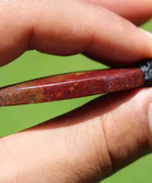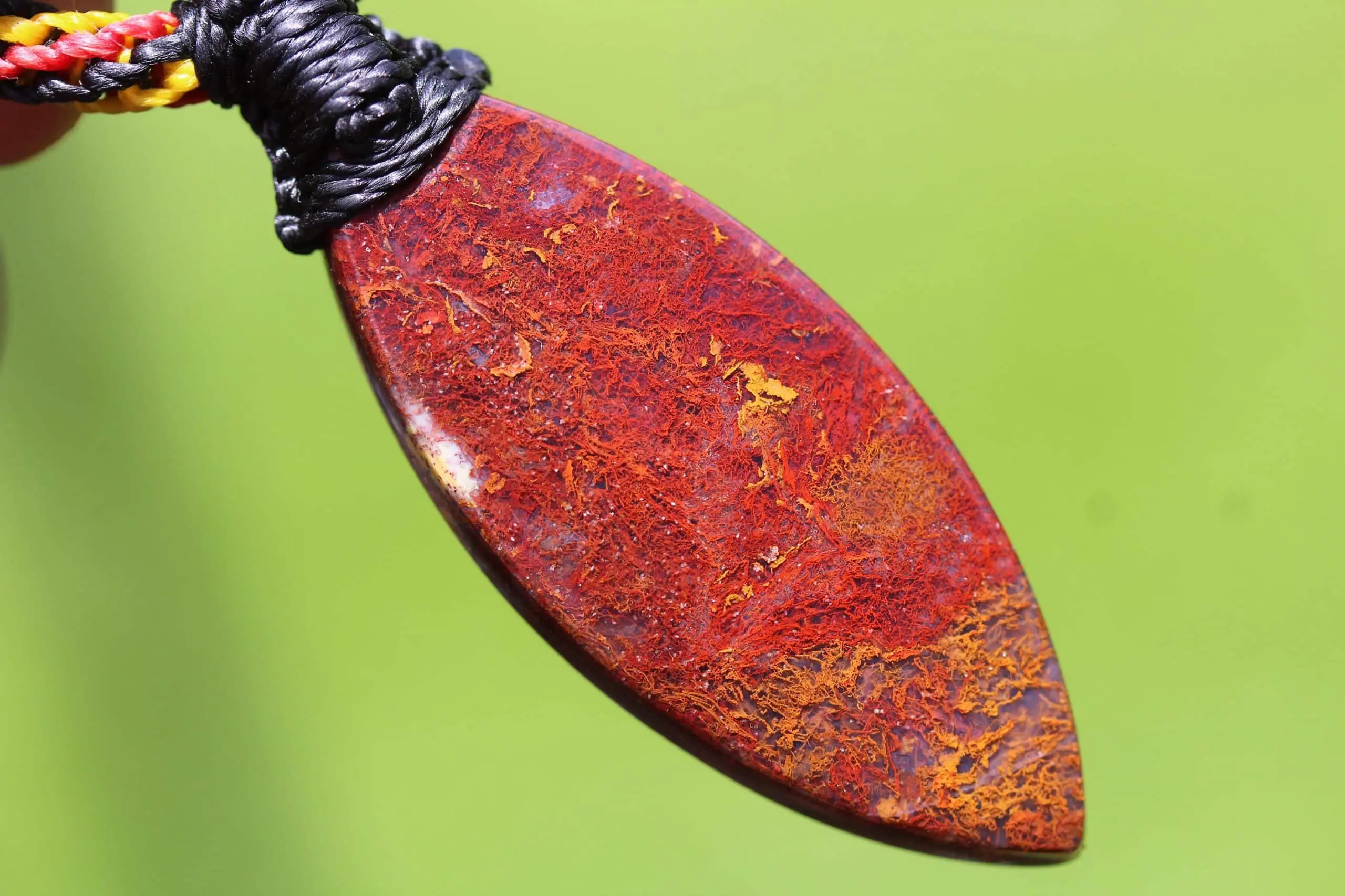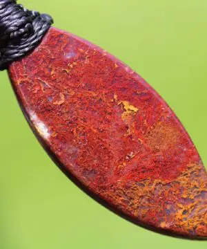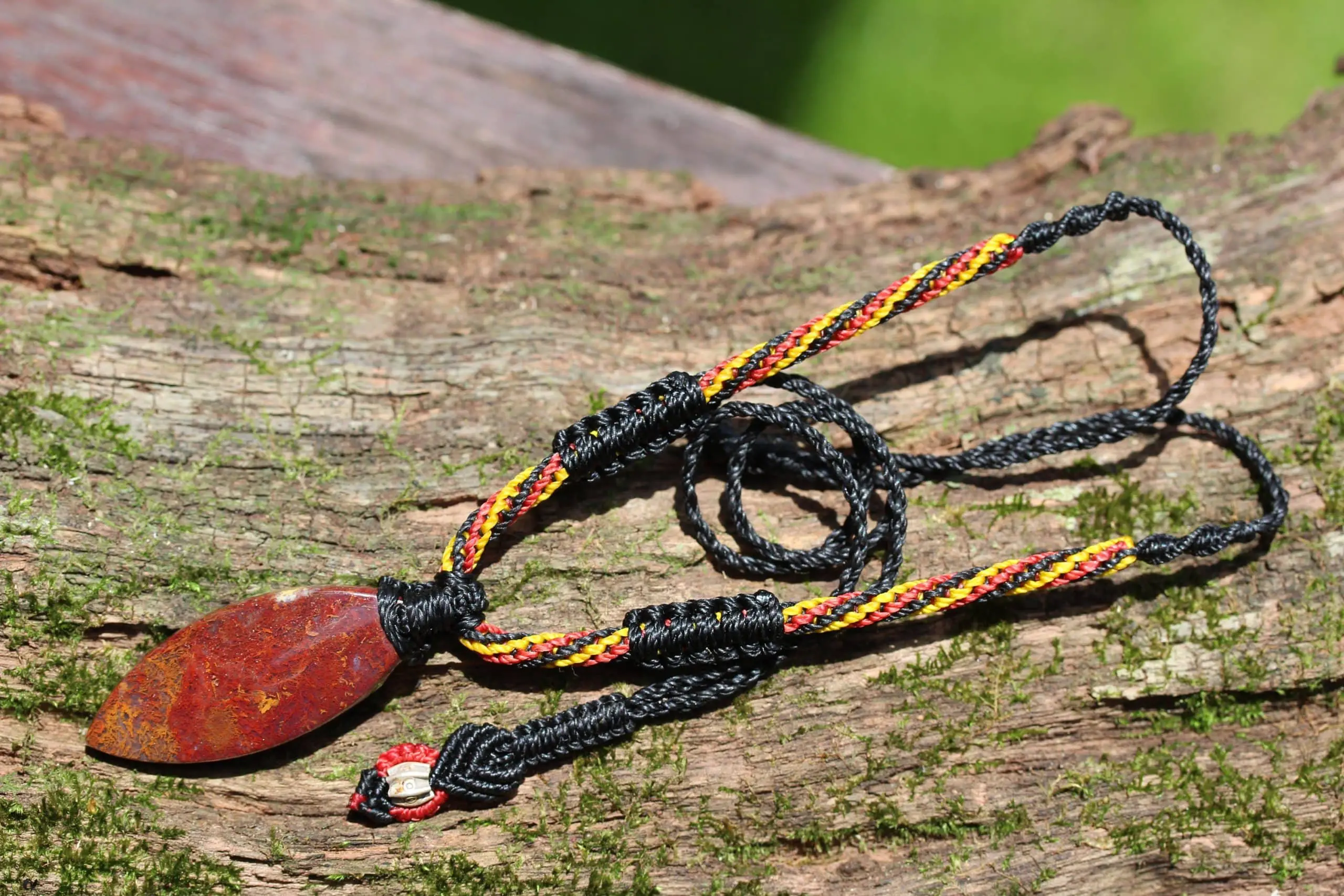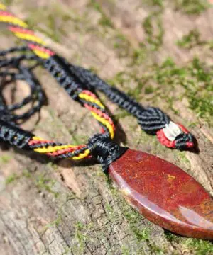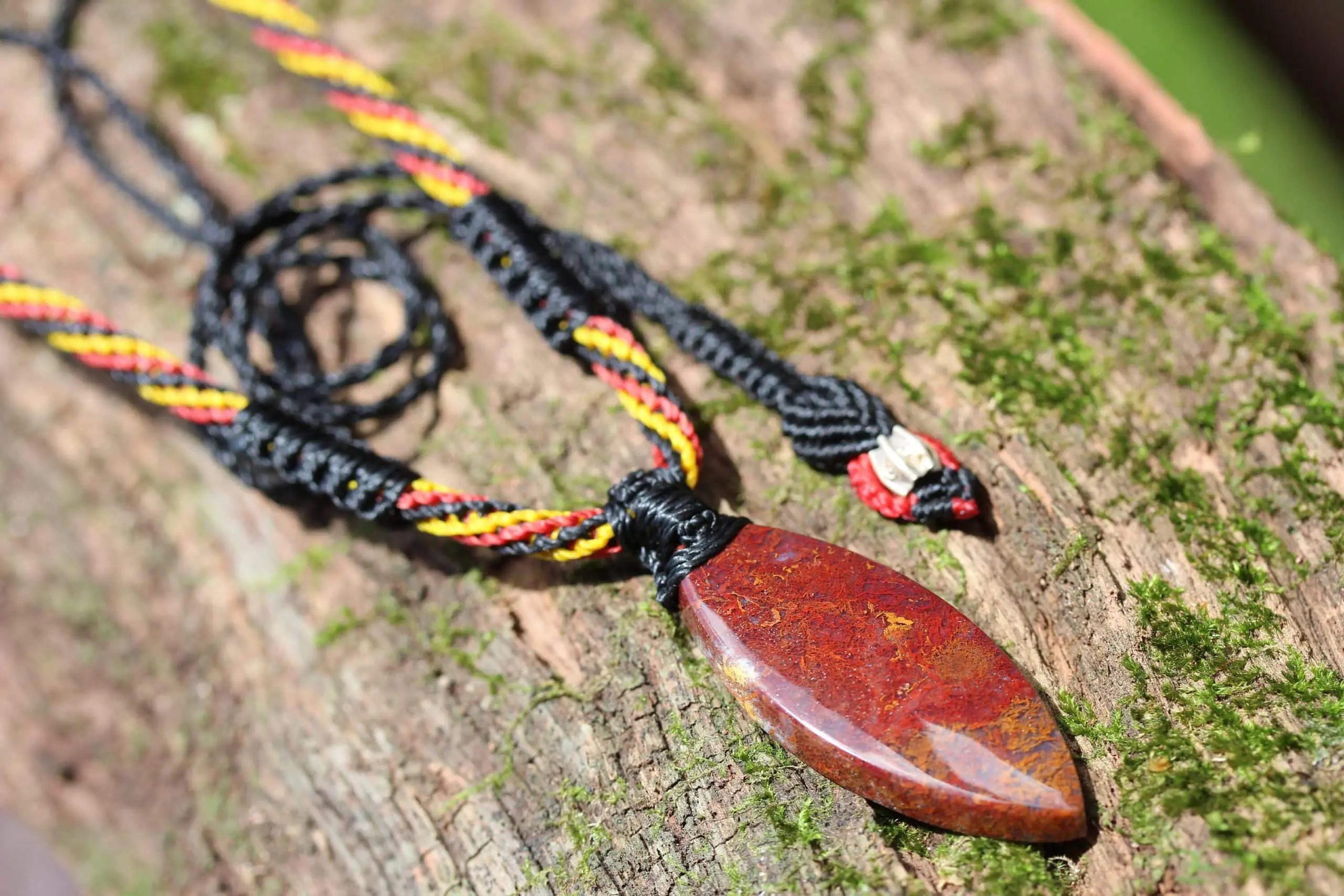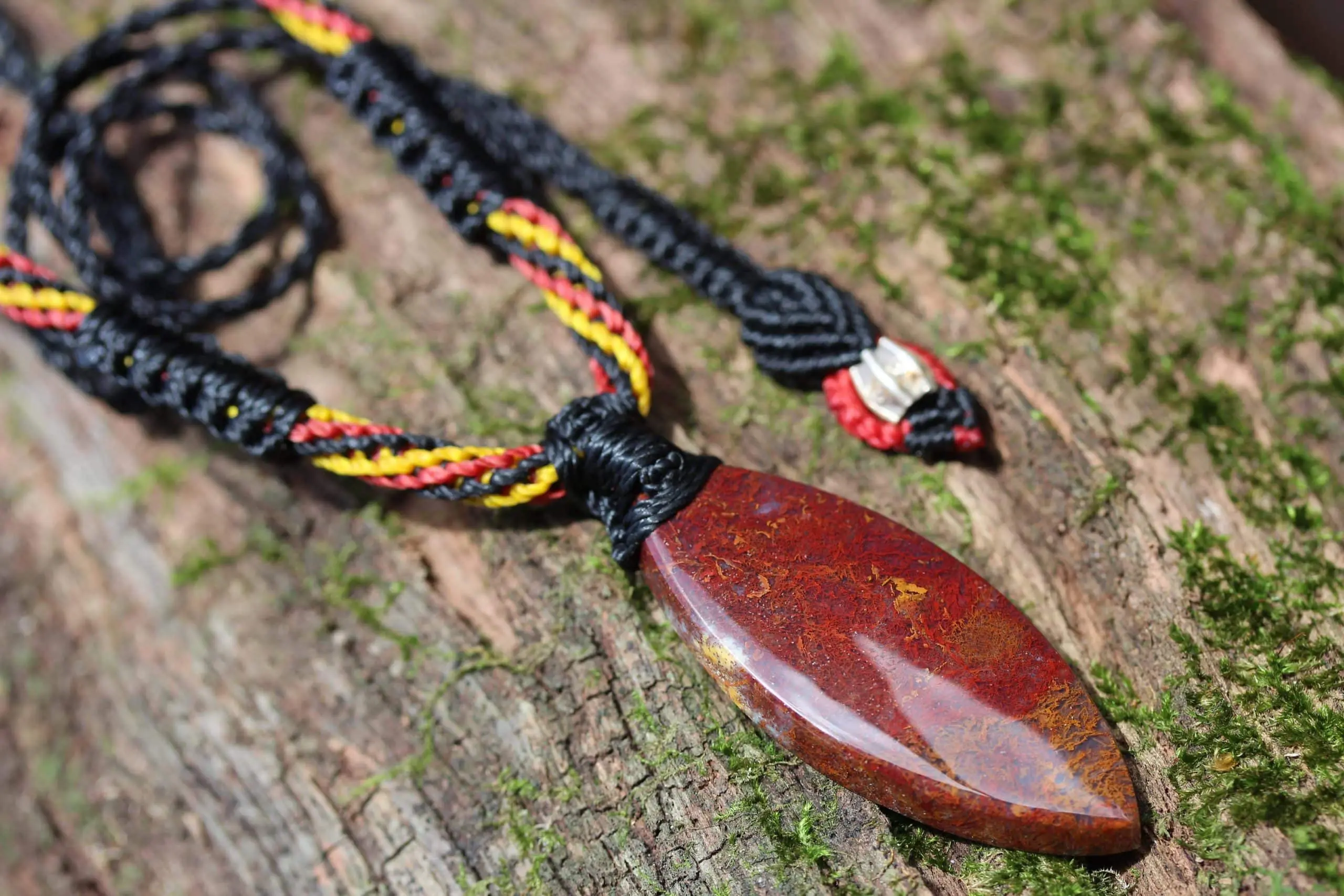 This is a unique and playful red moss agate talisman, handcrafted by us here at Platypus Dreaming in the luscious rainforests of Far North Queensland, Australia. The stone has been cut and polished from raw material and is fair trade and ethically sourced. The moss agate has been sourced from Java Island from a small family business. This creation is inspired by First Nations people – Australia. Black represents the people, yellow represents the sun – giver of life and protector. Red represents the red earth, the red ochre used in ceremonies and First Nation peoples' spiritual connection to the land. This talisman features a 1000 pure silver tribal bead that has been hand-cut and chiseled using traditional techniques.