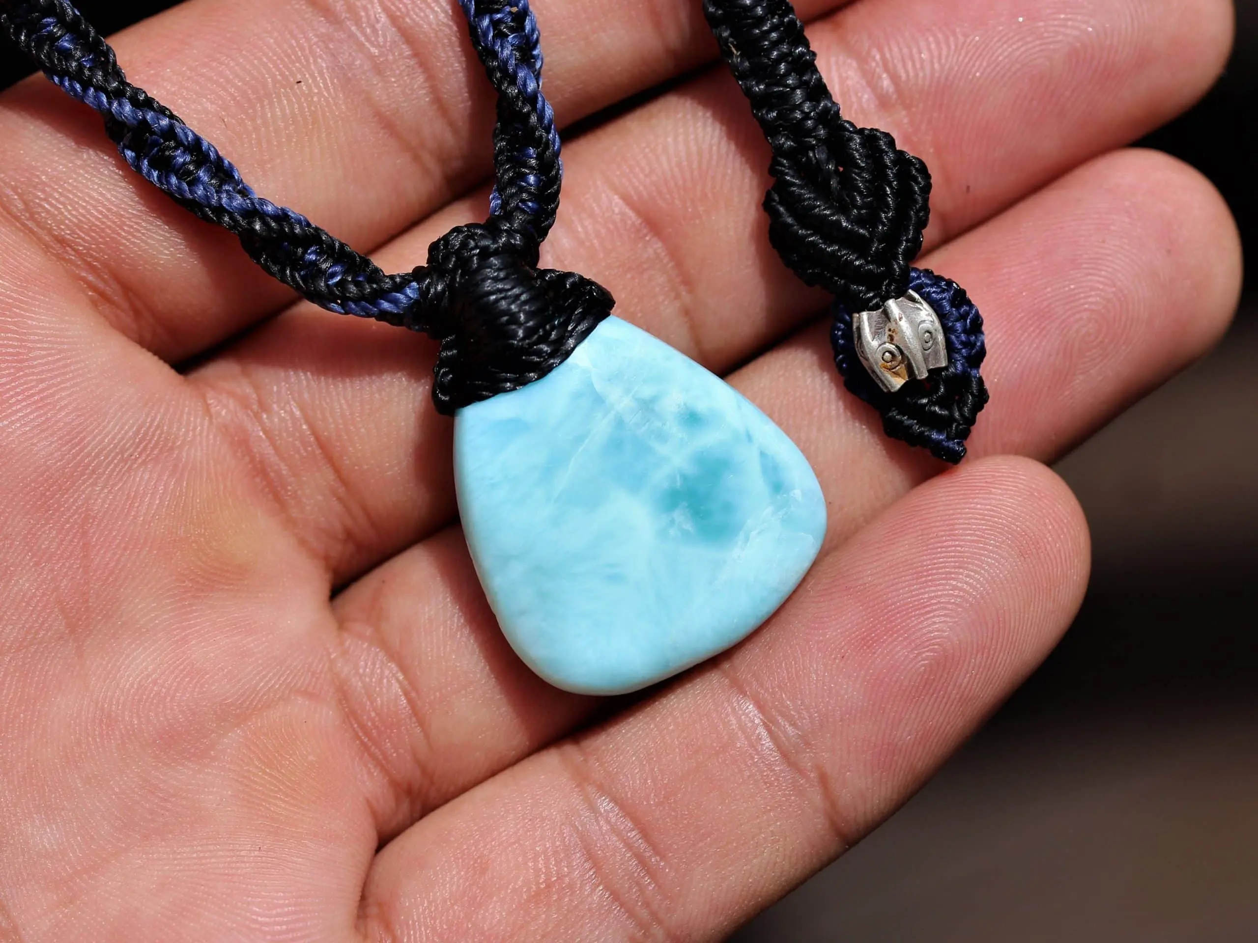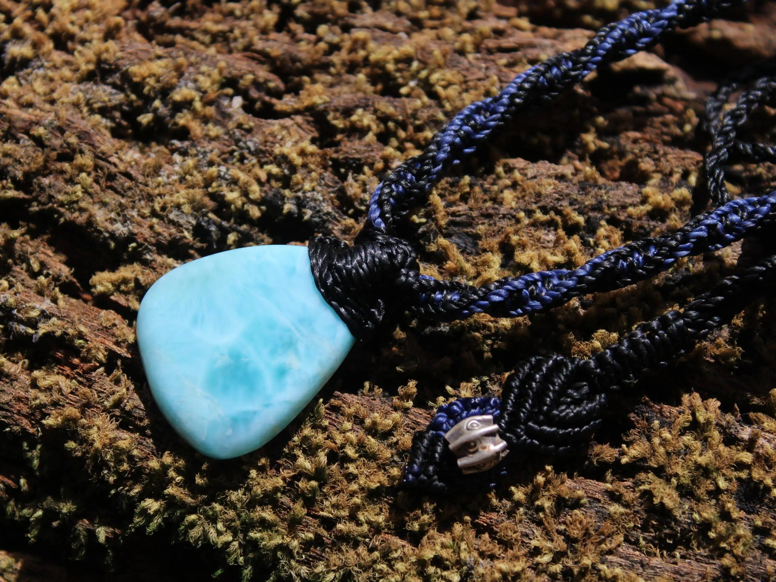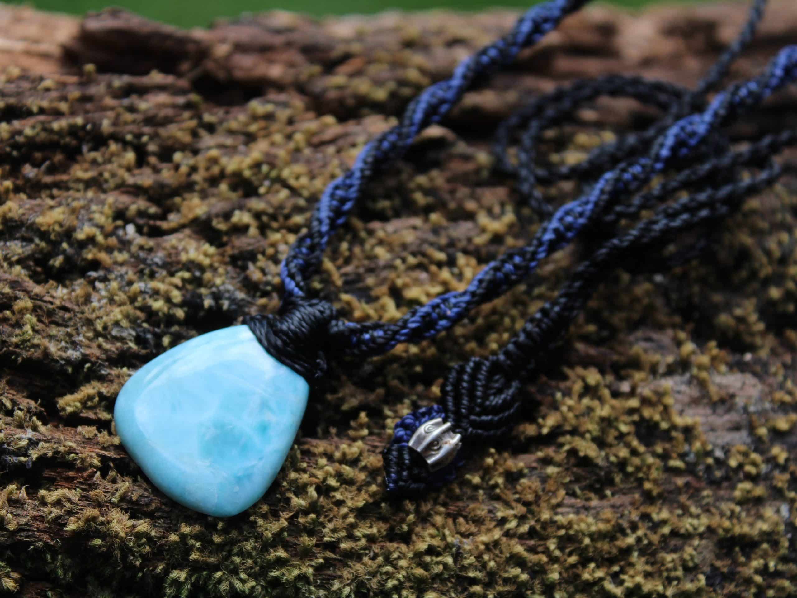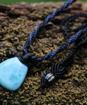 This divine larimar crystal talisman has been handcrafted by us here at Platypus Dreaming in the luscious rainforests of Far North Queensland, Australia. The larimar is some of the highest quality we have been able to source, and comes from the Dominican Republic – the only place on Earth where larimar is found. Features a 1000 pure silver tribal bead that has been hand-cut and chiseled using traditional methods.