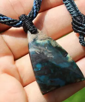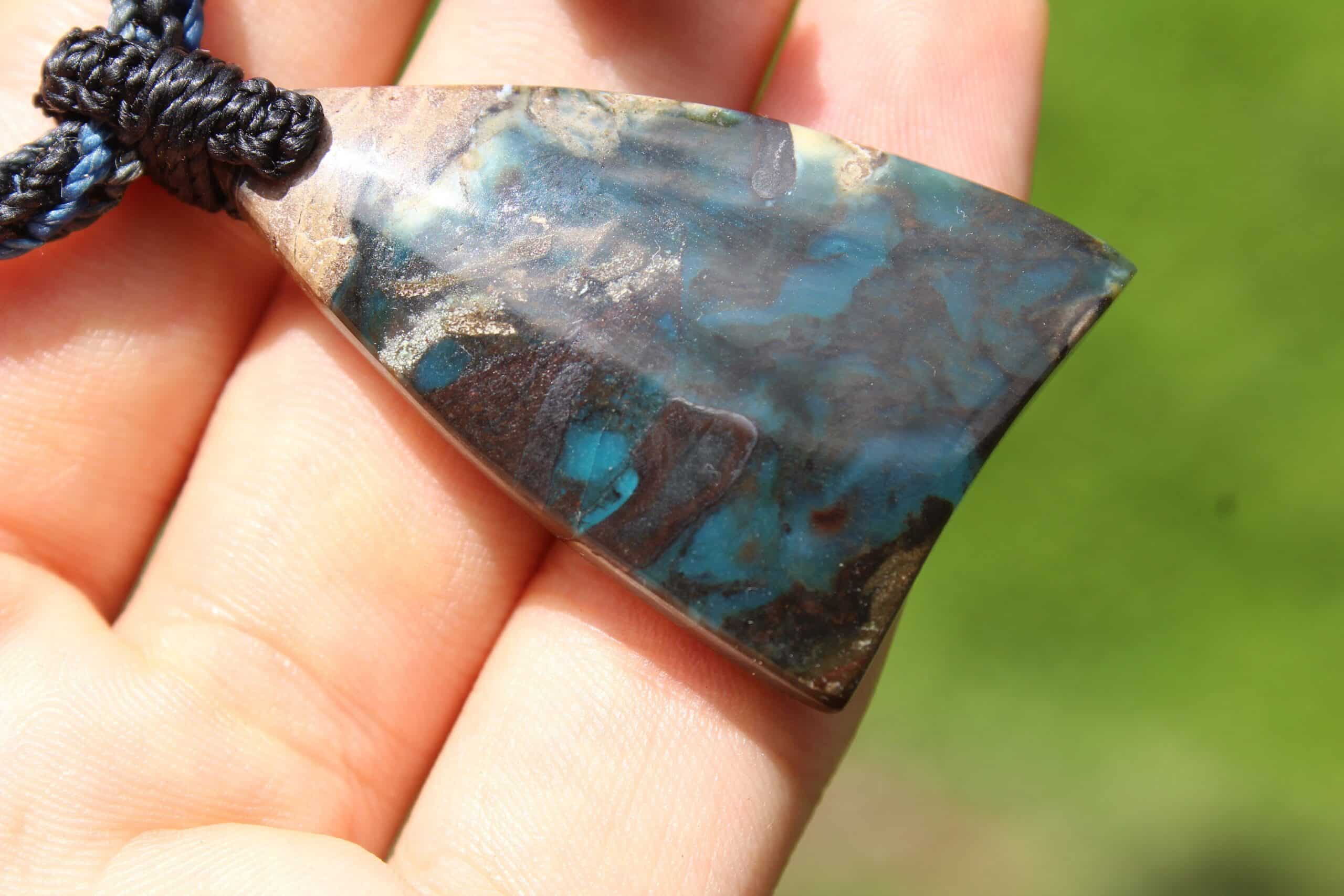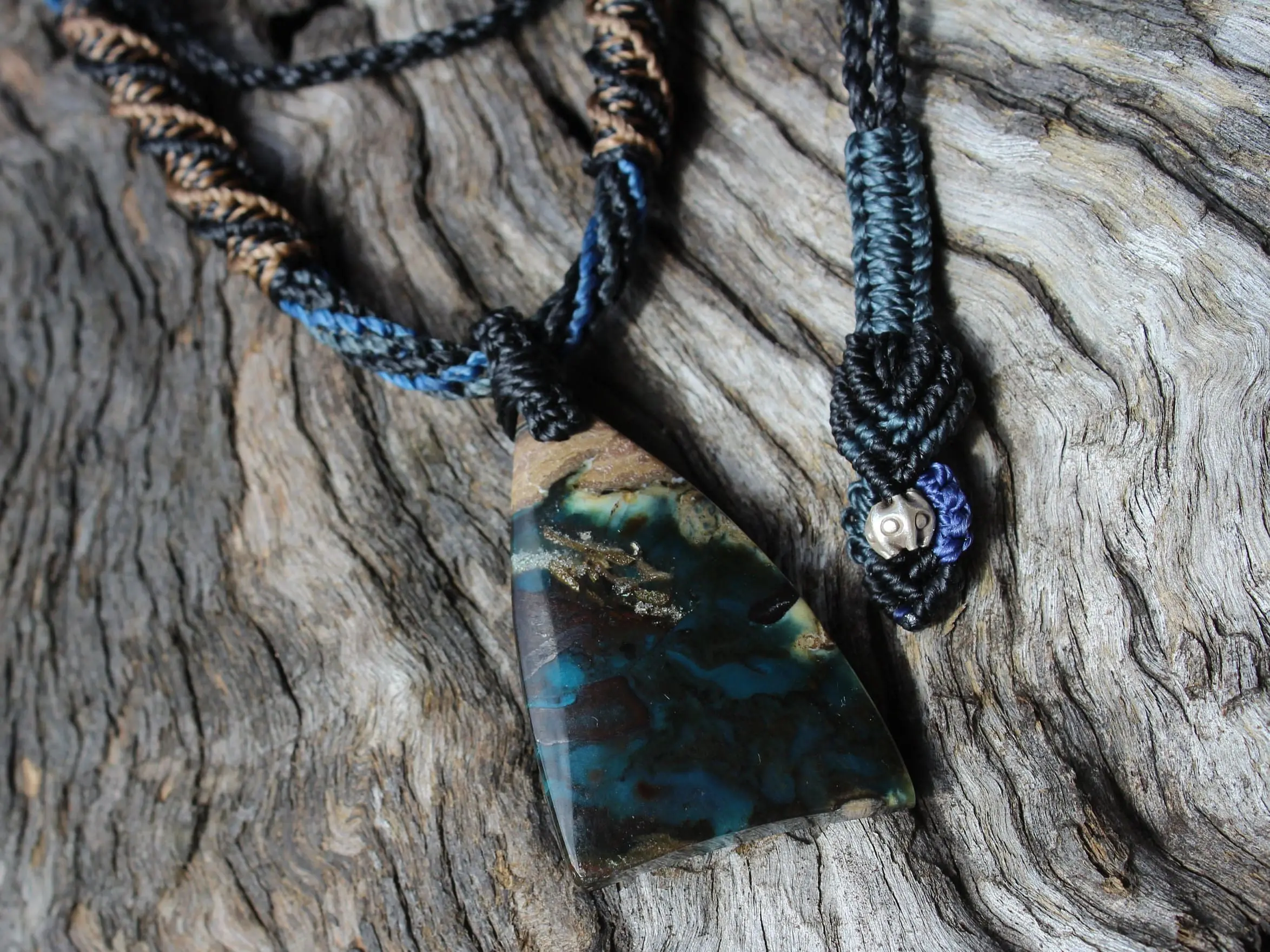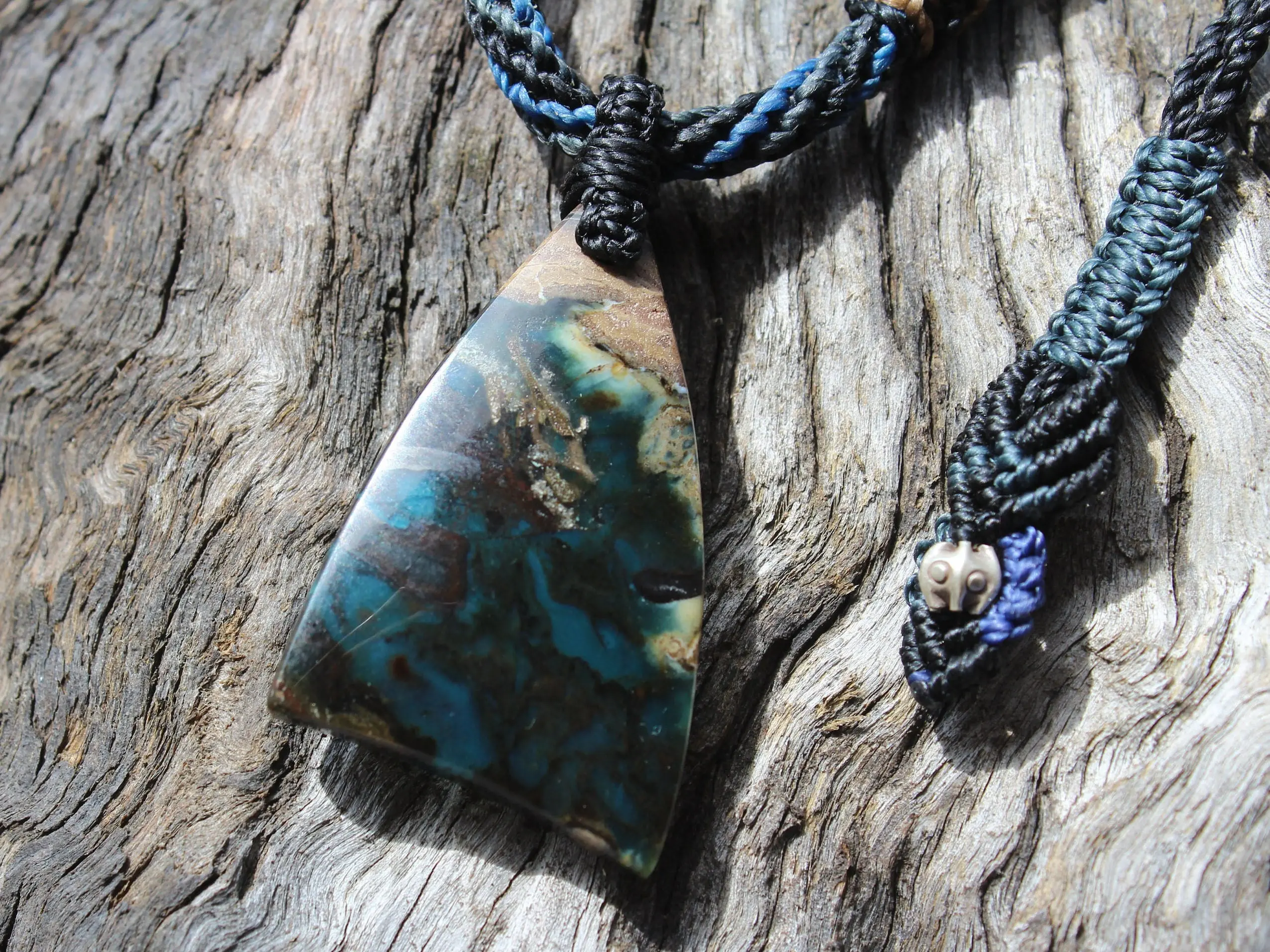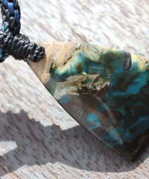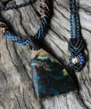 This is a super rare new found blue green opalised wood crystal talisman, handcrafted by us here at Platypus Dreaming in Far North Queensland, Australia. This incredible mineral was only discovered in 2018, near the slopes of three volcanoes in Indonesia’s West Java Province. What the miners actually found was an ancient petrified forest (how cool is that?), which had been pushed over by the deluge of “stuff” (pyroclastic flow) from a volcanic explosion. Then, over the ages, the wood was fossilized and preserved by opaline silica. The water in that silica was very rich in dissolved copper, iron, and manganese. Those copper and manganese deposits are now found inside this blue opal. This talisman also features a 1000 pure silver tribal bead that has been hand-cut and chiseled using traditional techniques.