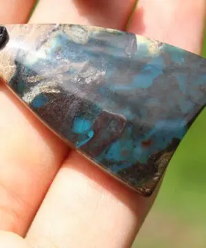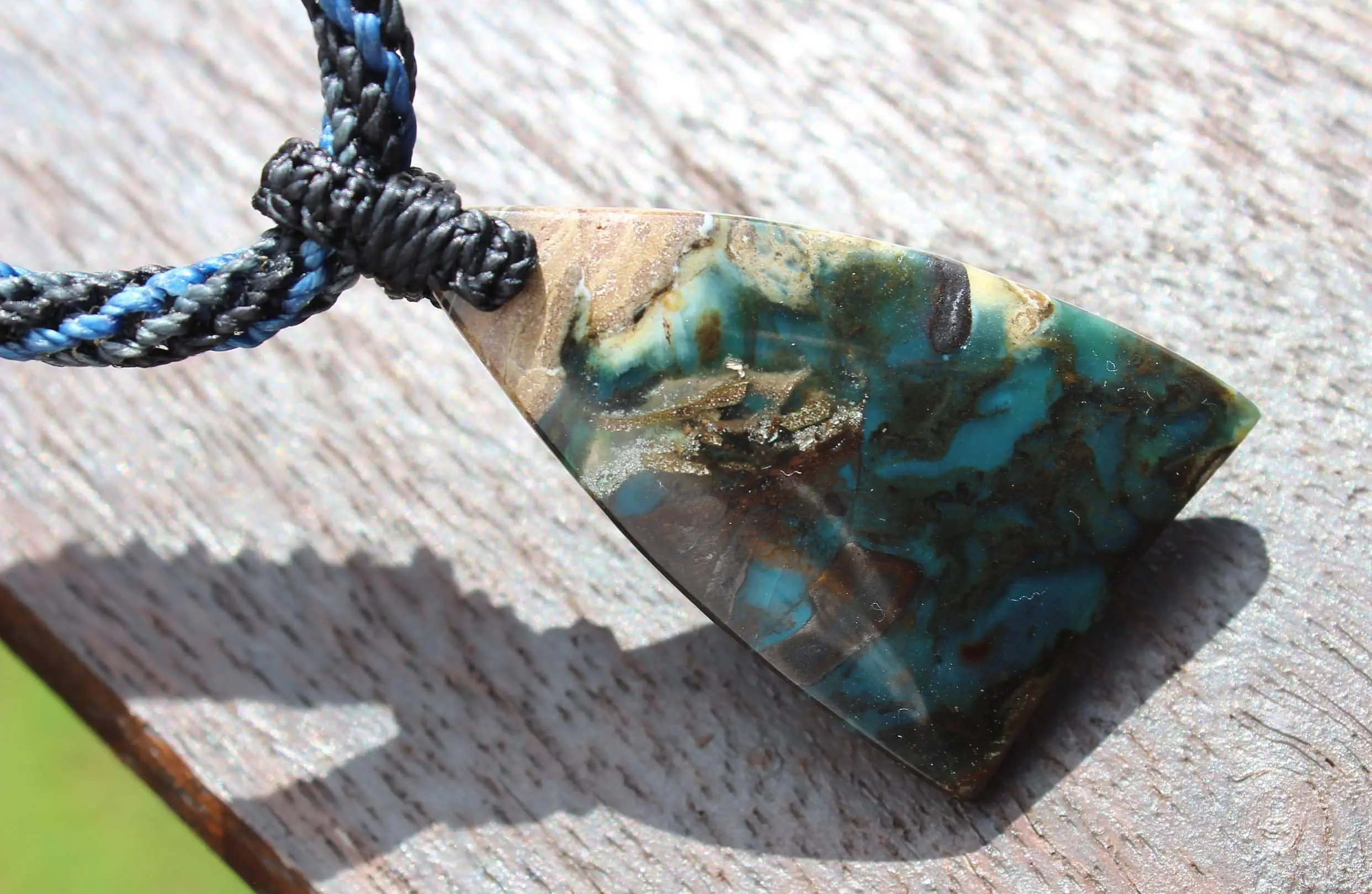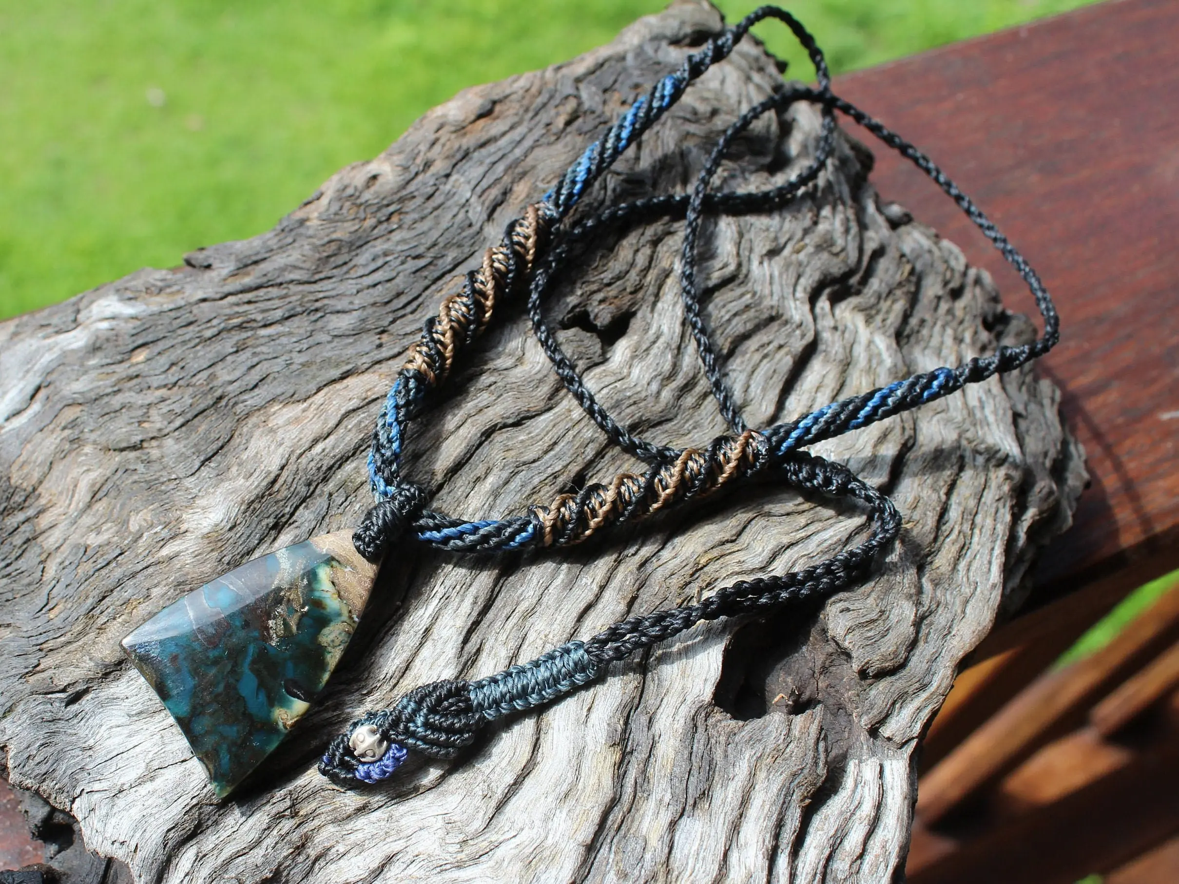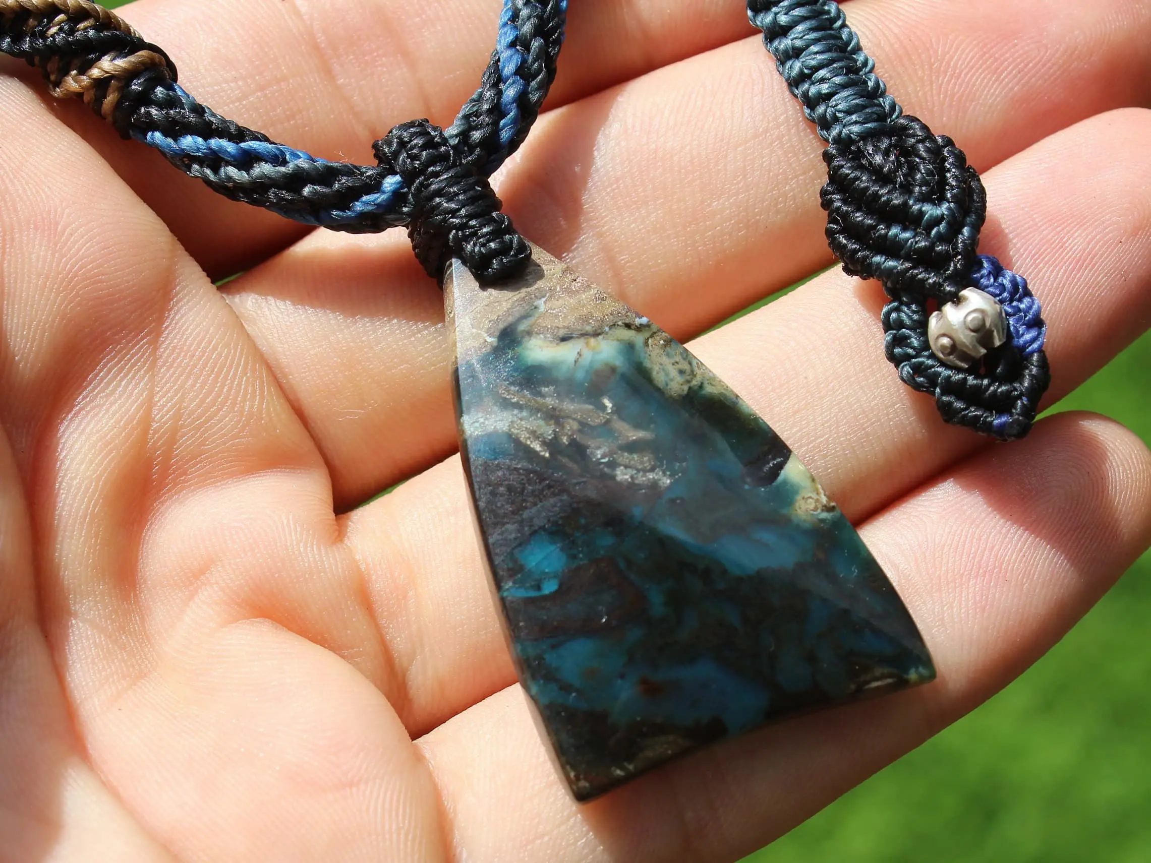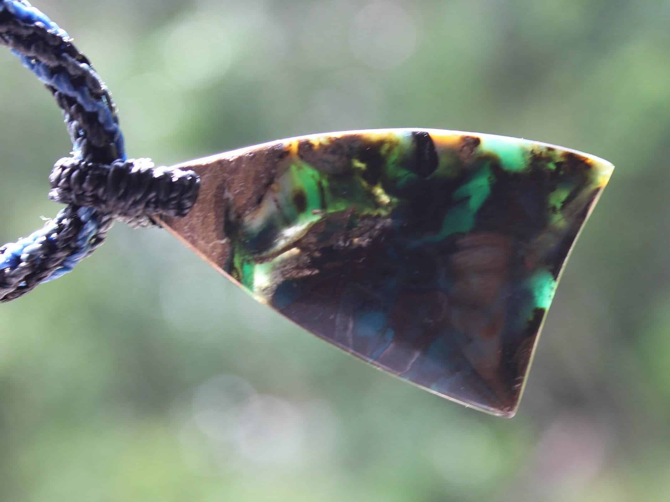 This is a super rare new found blue green opalised wood crystal talisman, handcrafted by us here at Platypus Dreaming in Far North Queensland, Australia. This incredible mineral was only discovered in 2018, near the slopes of three volcanoes in Indonesia’s West Java Province. What the miners actually found was an ancient petrified forest (how cool is that?), which had been pushed over by the deluge of “stuff” (pyroclastic flow) from a volcanic explosion. Then, over the ages, the wood was fossilized and preserved by opaline silica. The water in that silica was very rich in dissolved copper, iron, and manganese. Those copper and manganese deposits are now found inside this blue opal. This talisman also features a 1000 pure silver tribal bead that has been hand-cut and chiseled using traditional techniques.