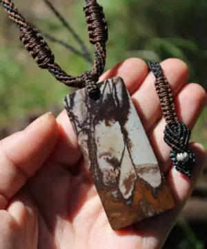 This extra large and thick Australian Outback Jasper crystal talisman has been handcrafted by us here at Platypus Dreaming in the luscious rainforests of Far North Queensland, Australia. This incredible stone is completely natural and has not been altered in any way – those incredible patterns emerge at the lapidary wheel from the raw earth. Outback Jasper is found in the Pilbara region of Western Australia – one of the most isolated and wild regions on Earth. Look closely to see the face of the crystal elemental who resides within!