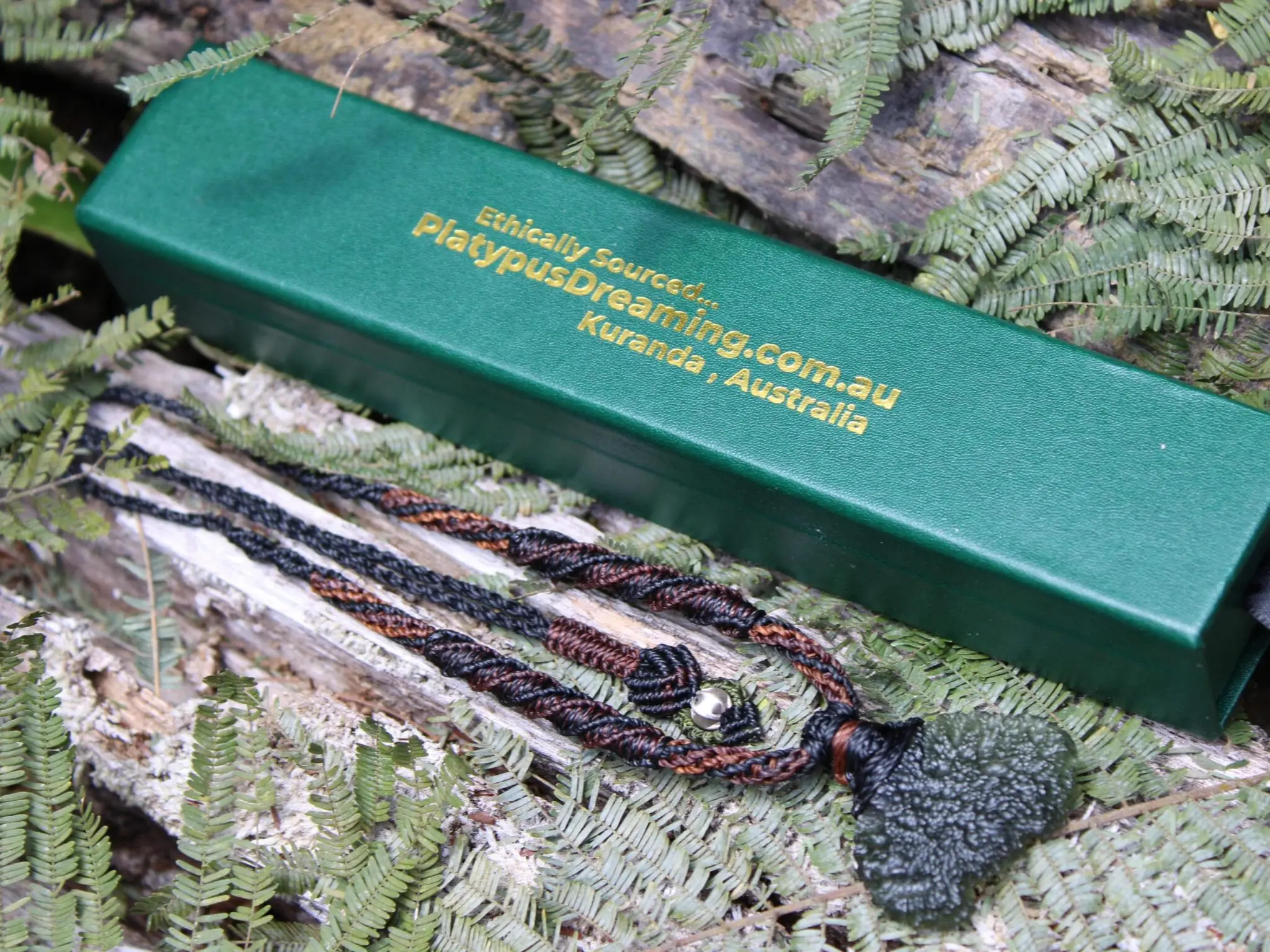 This is a divine double-sided frosty Moldavite pendant necklace from Czech Republic. It is a stunning rare bottle-green colour and it has no damage- 100% natural and authentic. Interesting and quirky shape! Extra-terrestrial origin, (this can not be confirmed!). Delicate, and ideal for use in ceremony. It has been handcrafted by us here at Platypus Dreaming in the beautiful rainforests of Kuranda, QLD Australia, Ngunbay Djapukai country.