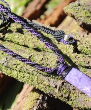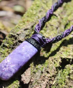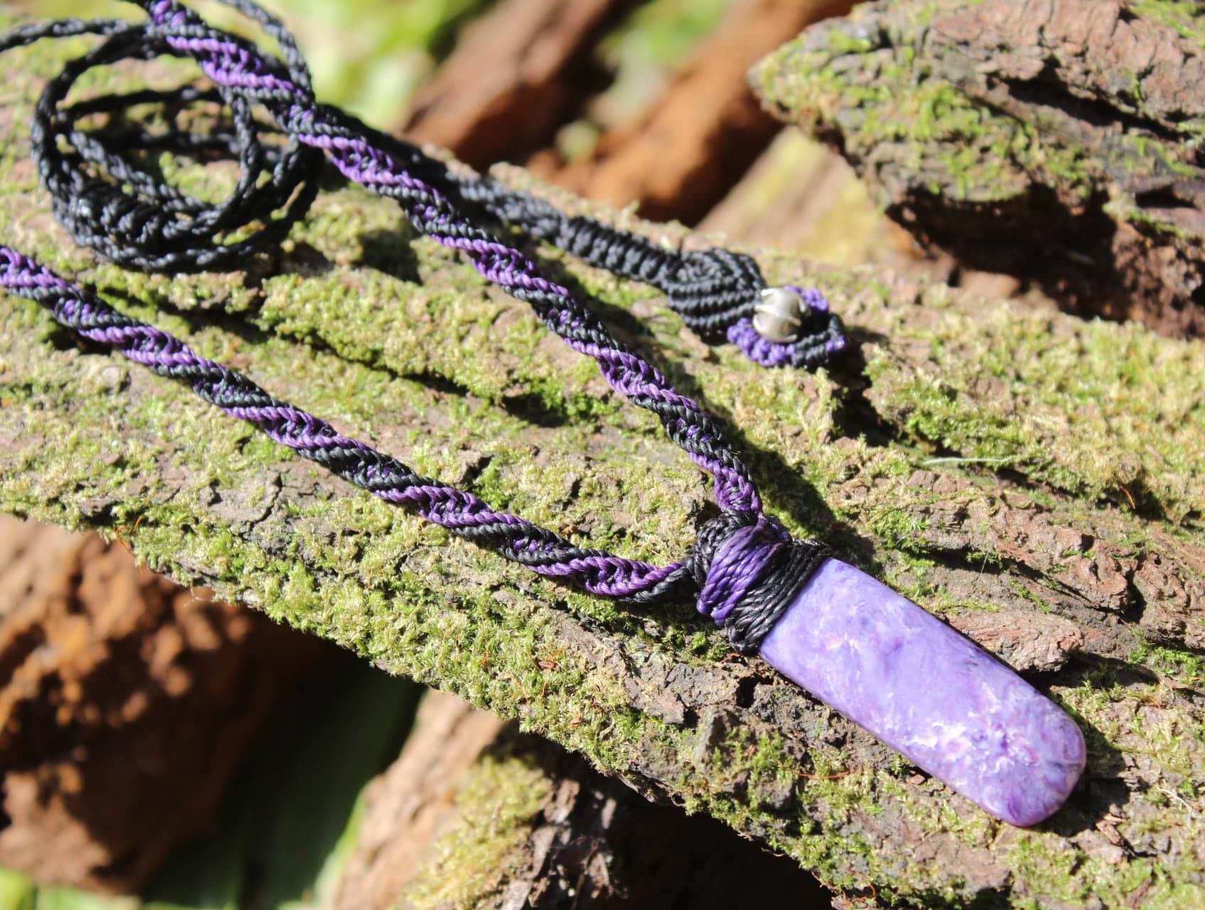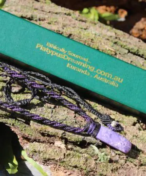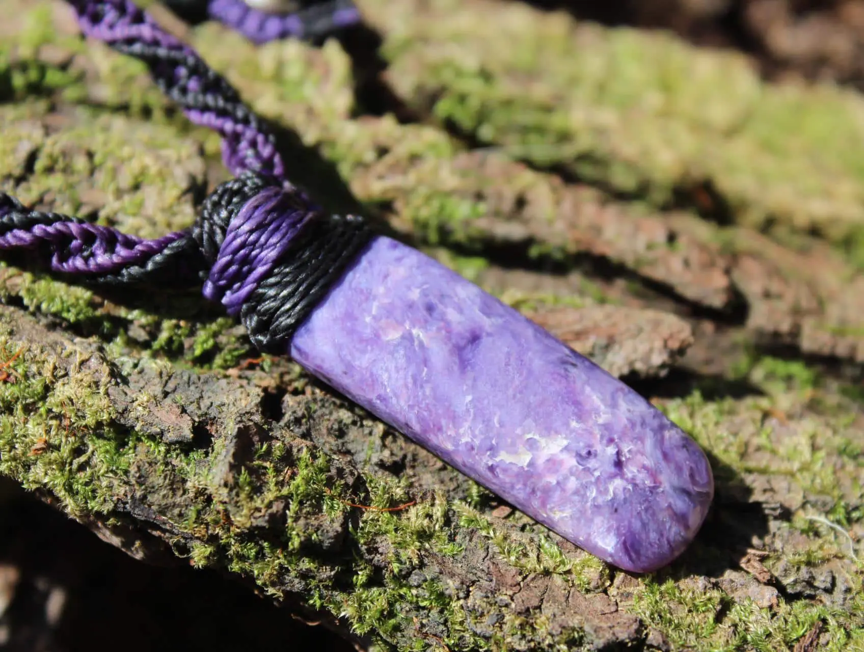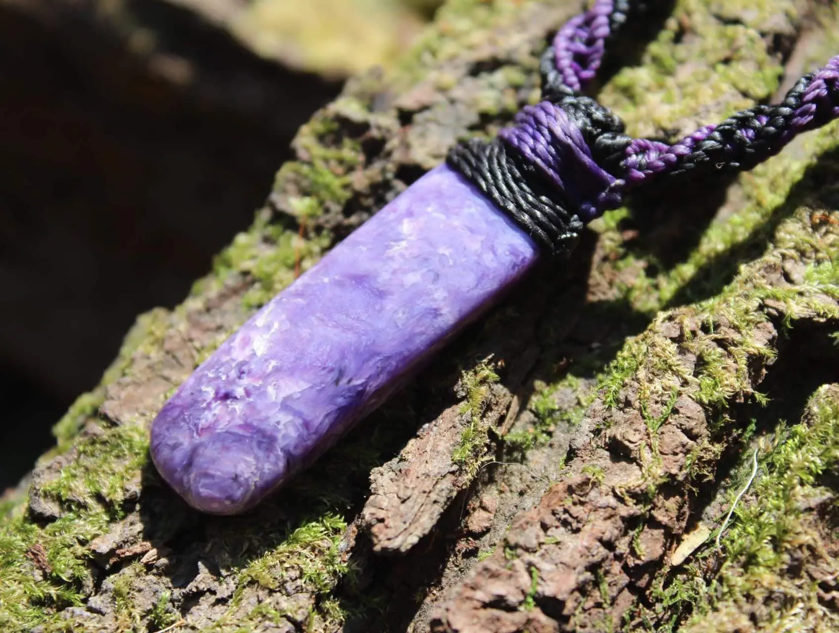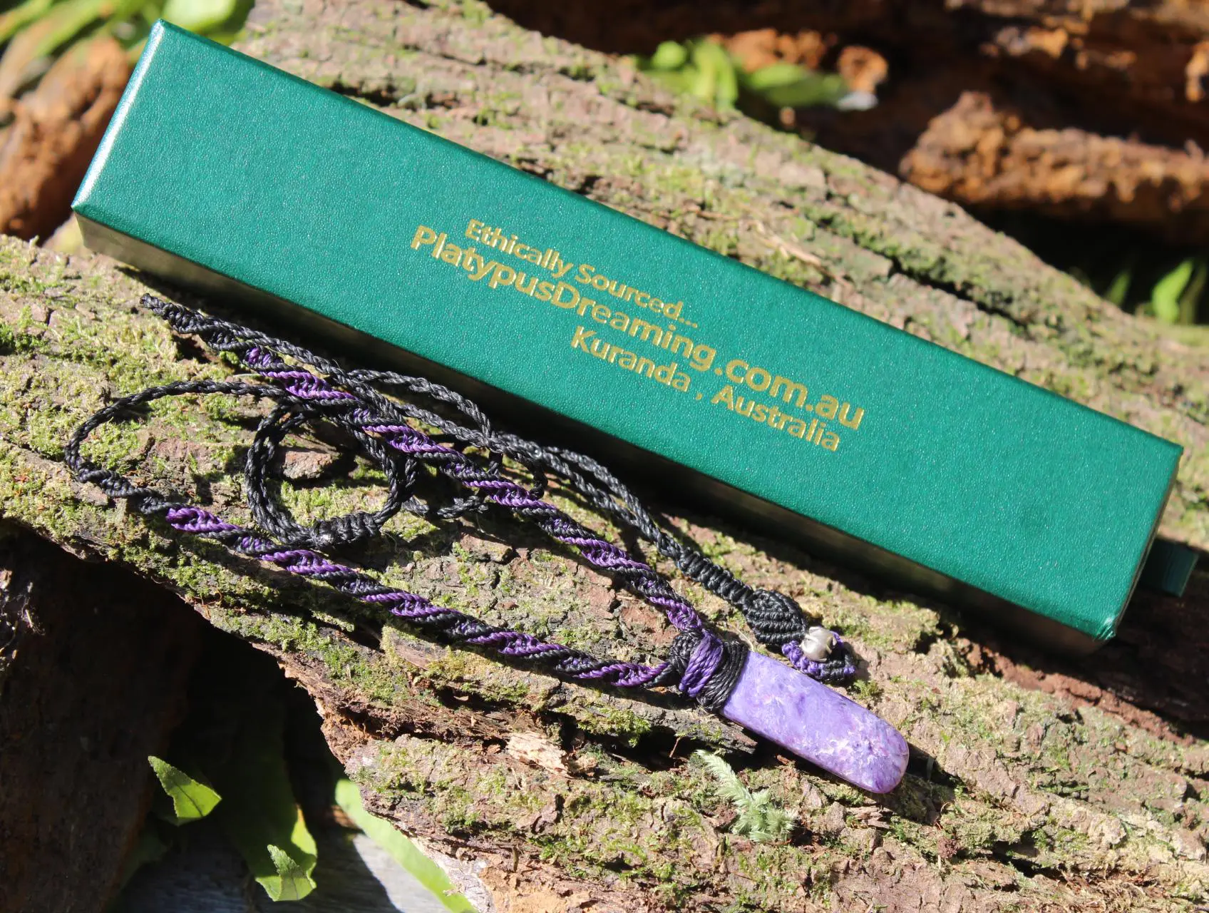 This divine charoite crystal talisman has been handcrafted by us here at Platypus Dreaming in the luscious rainforests of Far North Queensland, Australia. The charoite is some of the highest quality we have been able to source, and comes from the icy forests of Siberia, Russia. Features a 1000 pure silver tribal bead that has been hand-cut and chiseled using traditional techniques.