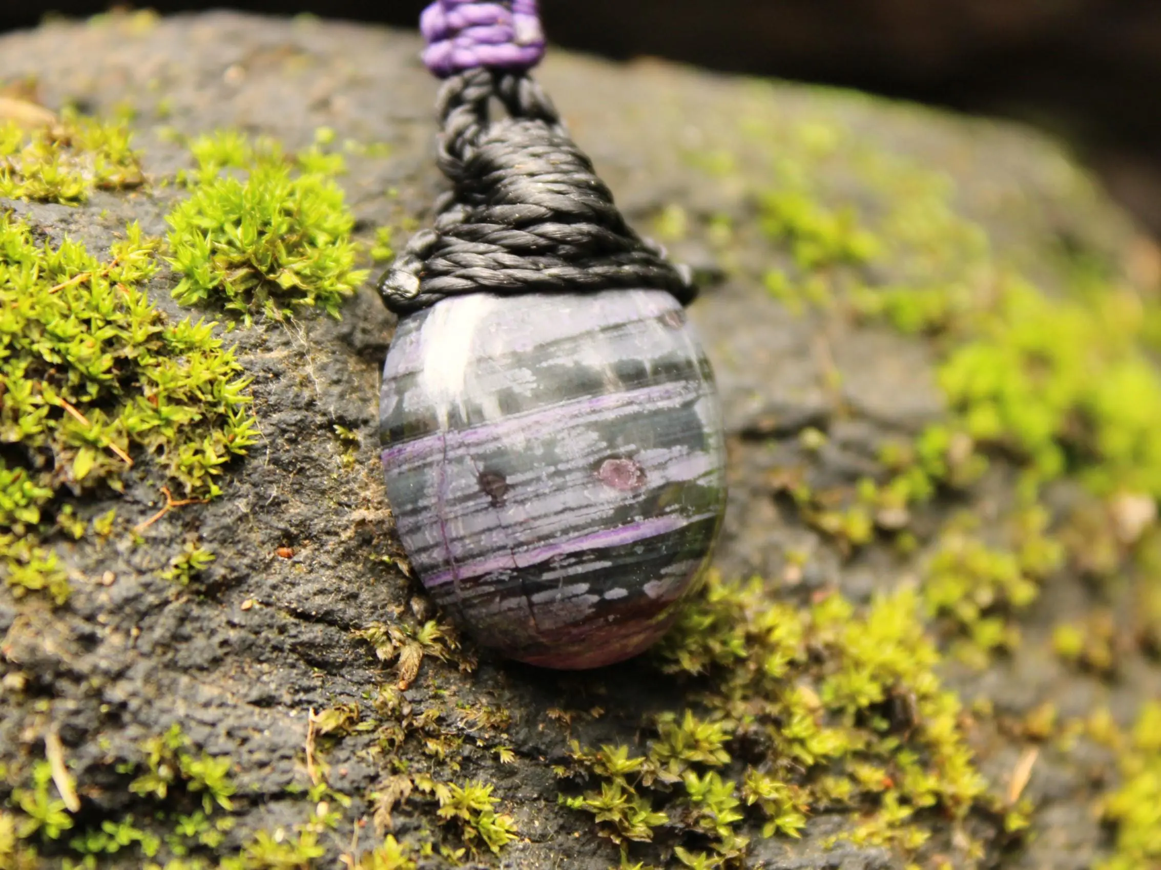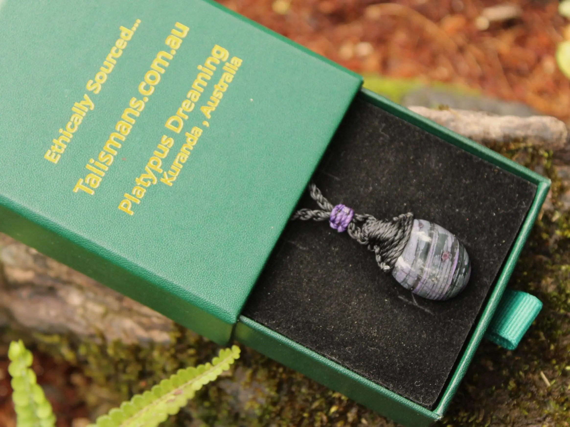 This AAA+ Sugilite crystal pendant has been handcrafted by us here at Platypus Dreaming, in the ancient rainforests of Far North Queensland, Australia — the oldest rainforest on Earth.