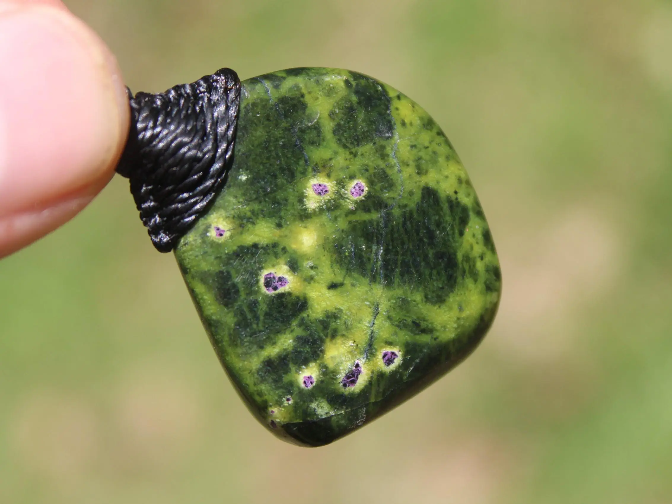 This piece features AAA+ bright green Serpentine with vivid purple Stichtite — a colour combination that is extremely rare, especially in such high clarity and saturation. This gem is also double-sided, polished on both faces in our signature rainforest-infused style.